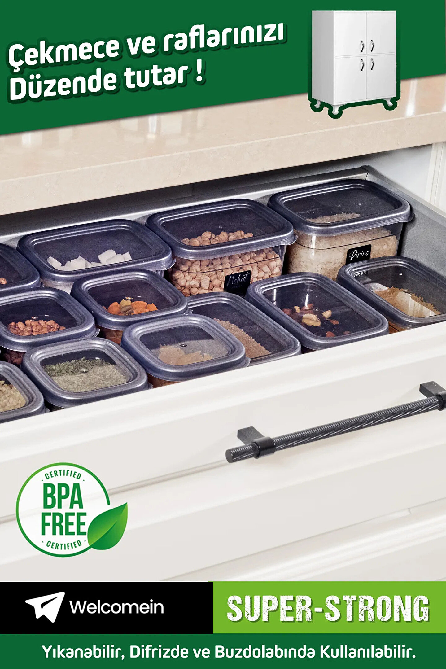 BPA İçermeyen ve Gıda Sınıfı Malzeme — Welcomein kiler saklama kapları, birçok diğer markanın plastik kaplarından daha uzun ömürlü olan dayanıklı plastikten, BPA içermeyenden yapılmıştır. Şeffaf kaplar, içinde ne olduğunu görmeyi kolaylaştırır, her kabı açmadan istediğinizi kolayca alabilirsiniz.