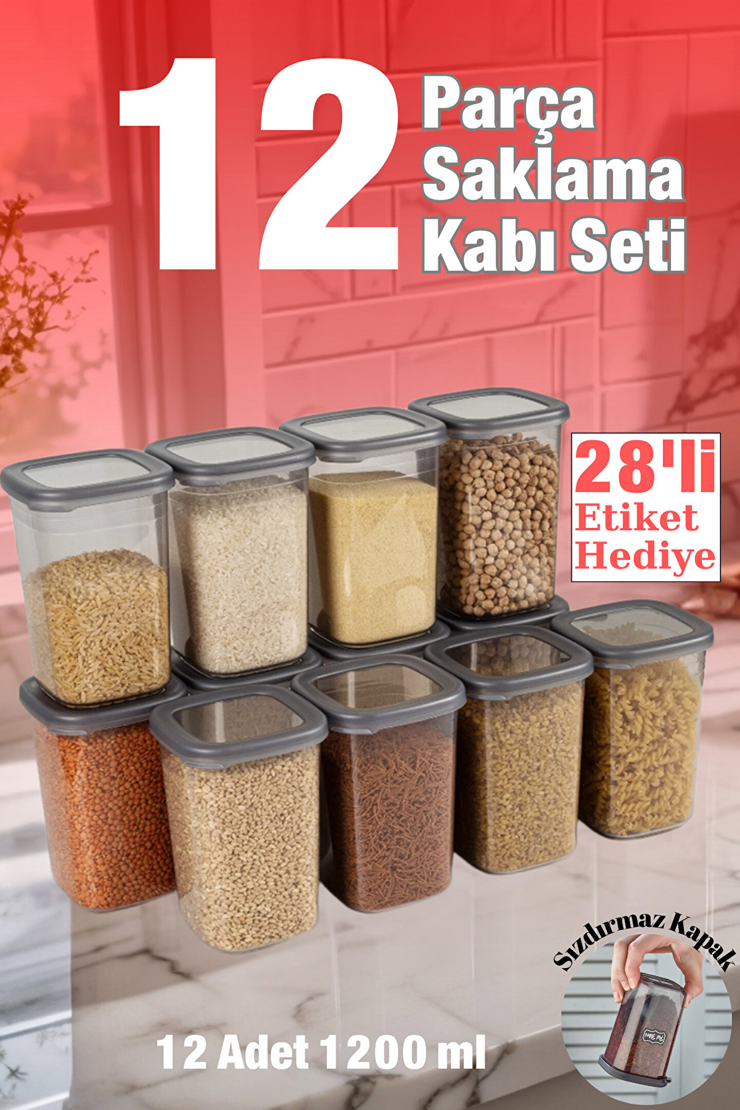12 Adet 24 Parça Etiket Hediyeli 1200 ml. Sızdırmaz Kapaklı Kare Erzak Bakliyat Saklama Kabı Seti