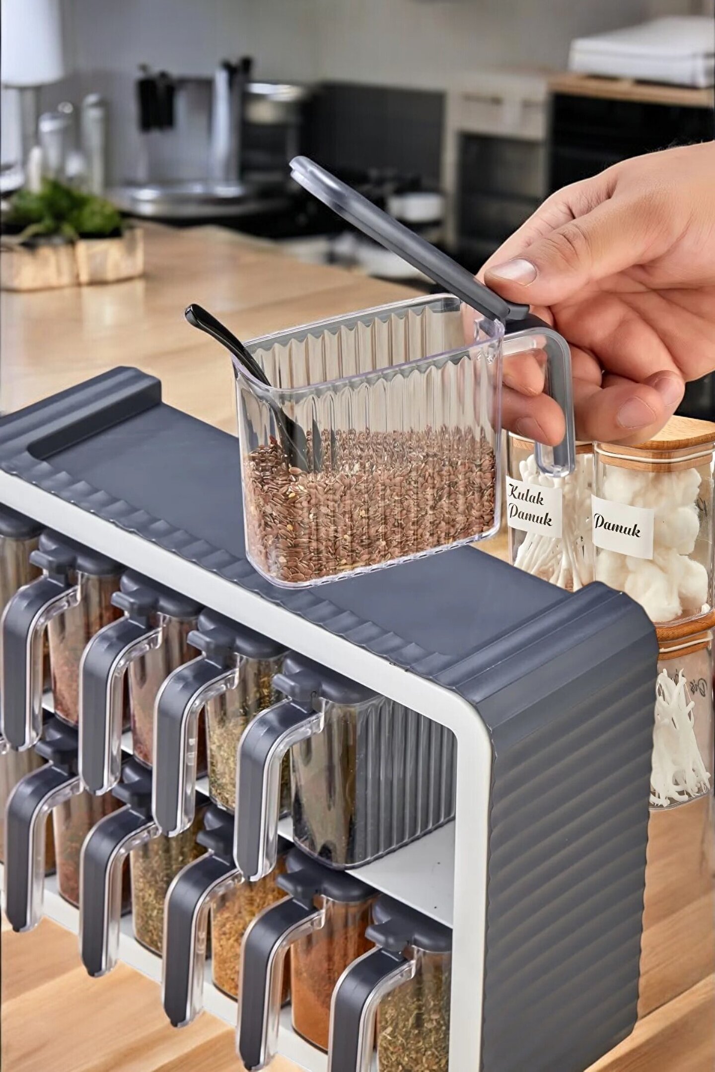 Mutfak tezgahınıza modern bir dokunuş ekleyen 12'li baharat standı, tüm baharatlarınızı düzenli bir şekilde saklamak için ideal. Her bir şişenin kolayca açılabilen kapakları, baharatlarınızın taze kalmasını sağlar. Fonksiyonel tasarımı sayesinde, yemek yaparken gerekli olan baharatlara hızlıca ulaşabilirsiniz. Şık görünümüyle mutfak dekorunuza da katkıda bulunur.
