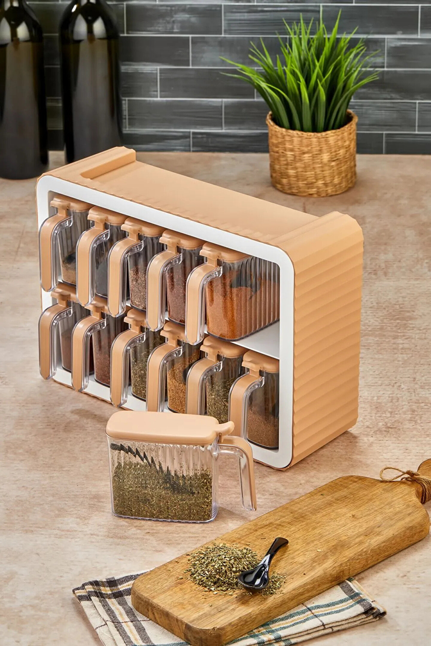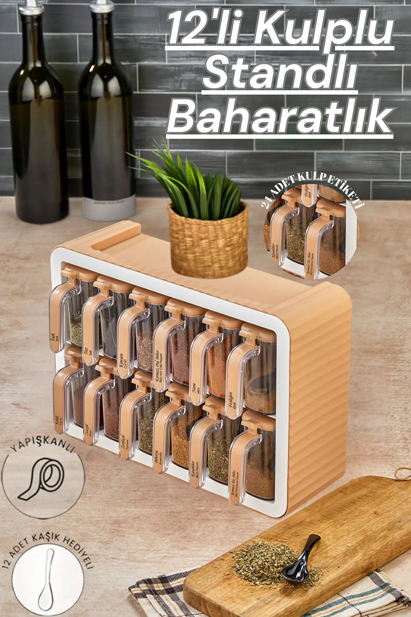 welcomein 12li Standlı Kendinden Yapışkanlı Kapaklı Kaşıklı Kulplu Etiketli Çizgili Baharatlık Takım Organizer