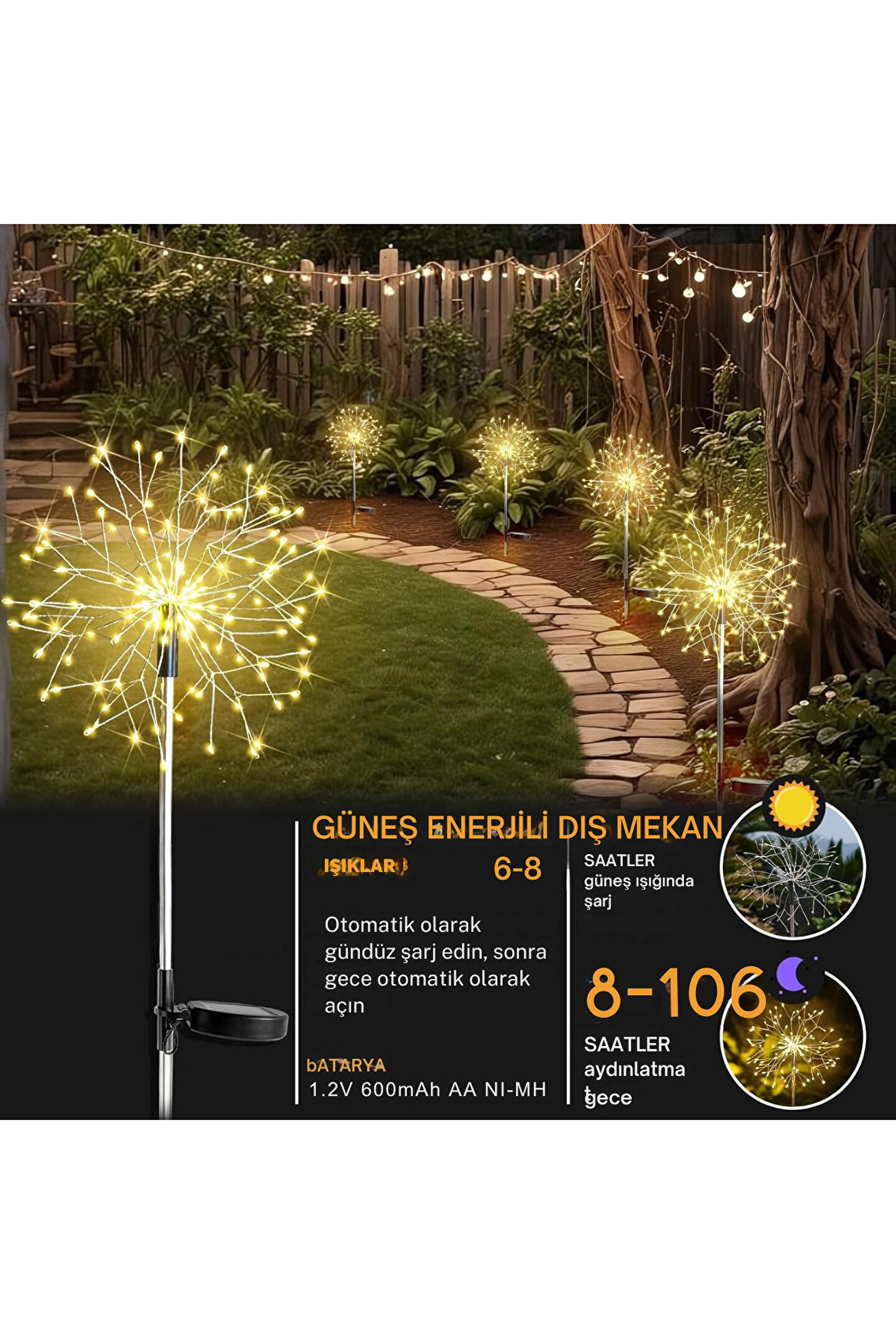 2'li Güneş Enerjili Bahçe Işıkları: 150 LED'li güneş enerjili kazık ışıklarımızla dış mekan sahnelerinizi canlandırın - 2'li paket iki kat daha fazla sihir! Geliştirilmiş şık yuvarlaklar 8 ışık moduyla patlayarak bahçenizi, bahçenizi güzel, parlak bir ışıltıyla boyar. Bu güneş enerjili ateş böceği ışıklarının parlak karahindiba denizi gibi dans ettiğini görün, dış mekanlarınıza hayat veren güzel, göz kamaştırıcı bir ışık yayar. Birden fazla setle büyüyü katlayın, dekorasyon oyununuzu yeni zirvelere taşıyan nefes kesici bir gösteri yaratın.