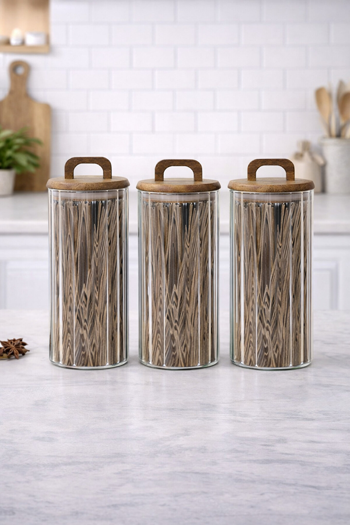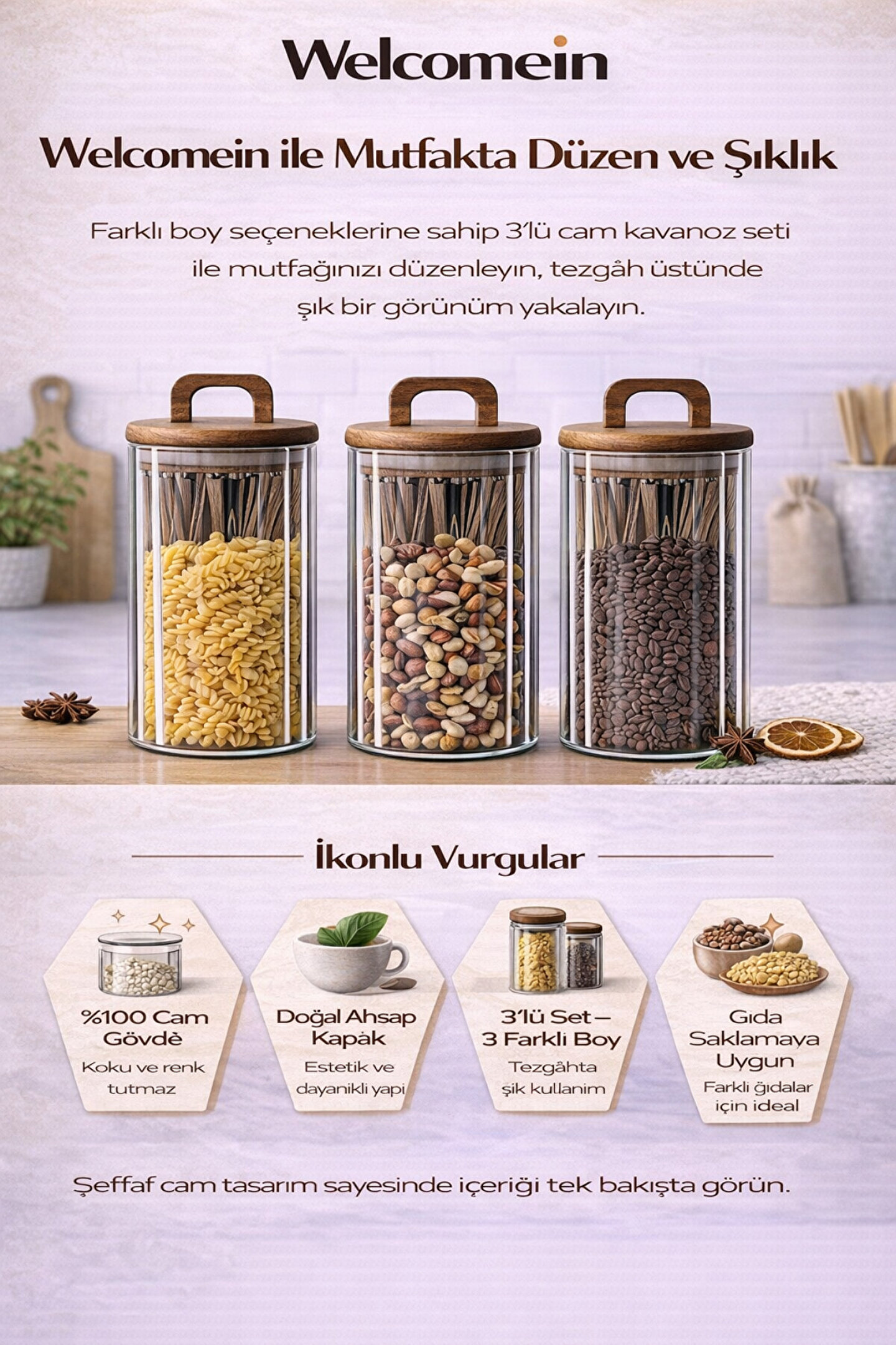 Welcomein 3’lü Cam Kavanoz Seti, mutfağınızda hem düzen hem de şıklık arayanlar için tasarlandı.