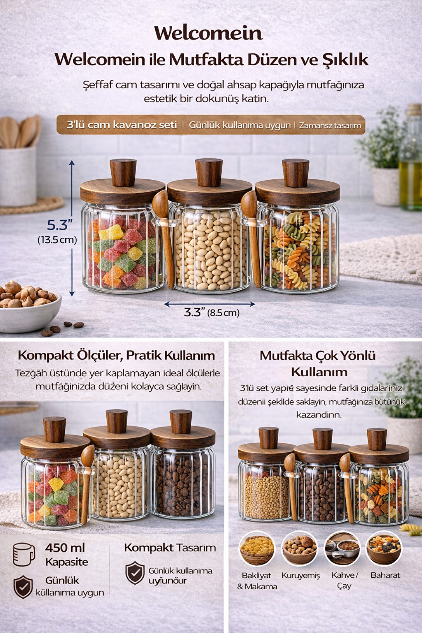 Welcomein 3’lü cam kavanoz seti, mutfağınızda hem düzen hem de estetik arayanlar için tasarlandı.