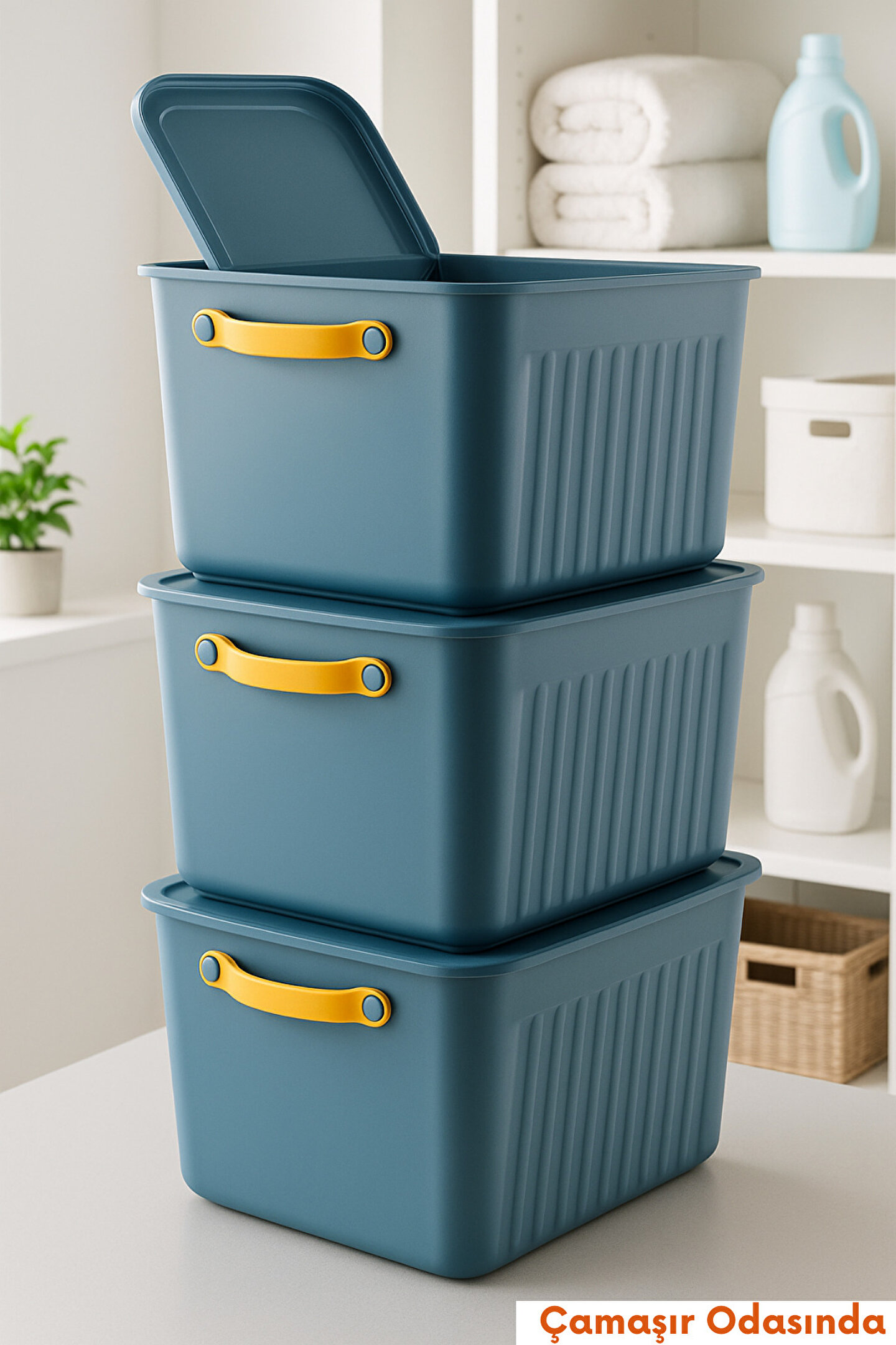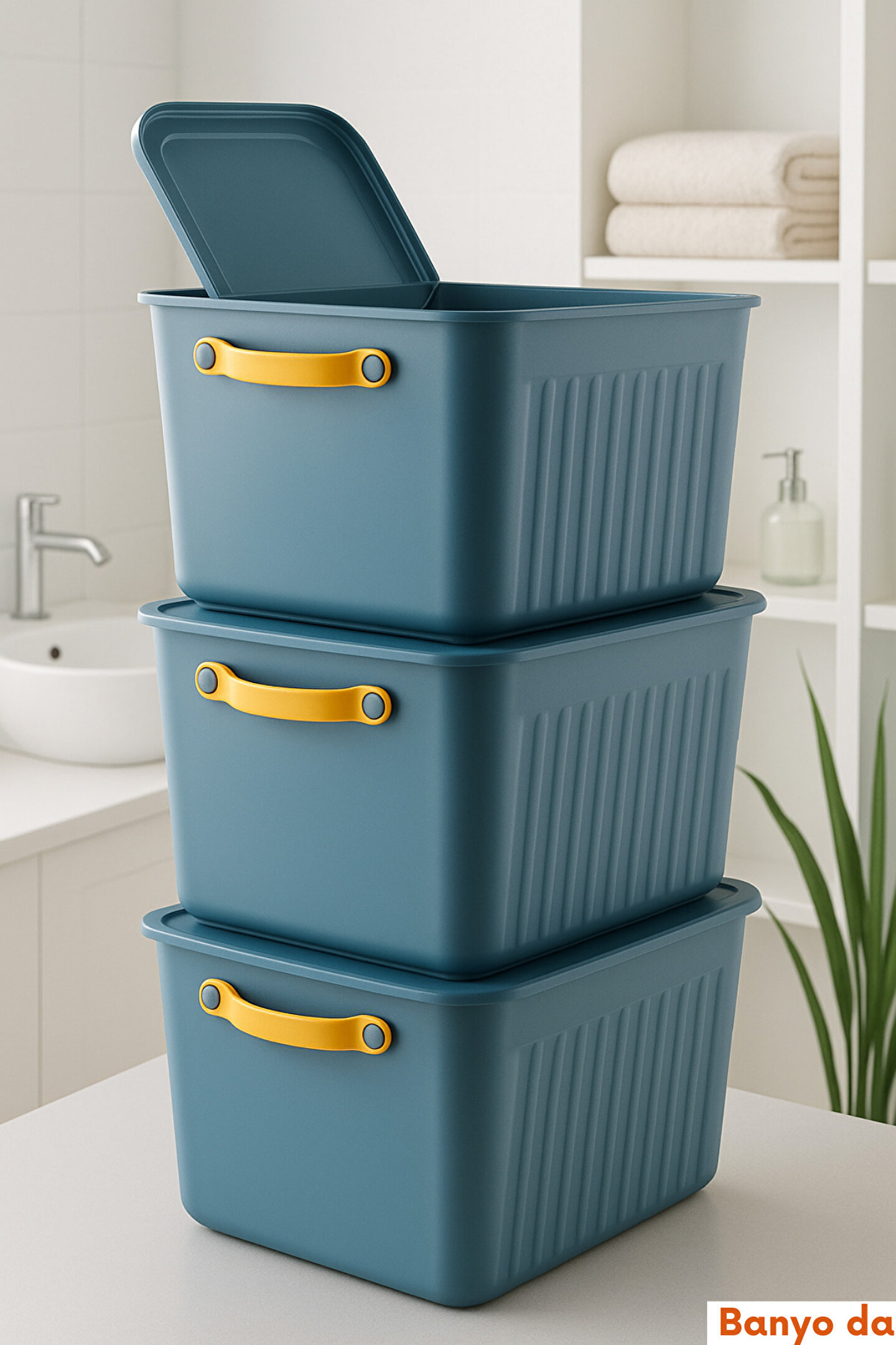 Modern tasarımı ve canlı renkleriyle evinize düzen katacak bu 3'lü kapaklı saklama kutusu seti, çamaşır odasından mutfağa, banyodan çocuk odasına kadar her alanda kullanıma uygundur. Dayanıklı plastik malzemeden üretilmiştir, üst üste yerleştirilebilir yapısı sayesinde yerden tasarruf sağlar. Her kutuda bulunan ergonomik sarı taşıma sapı sayesinde taşımak oldukça kolaydır.