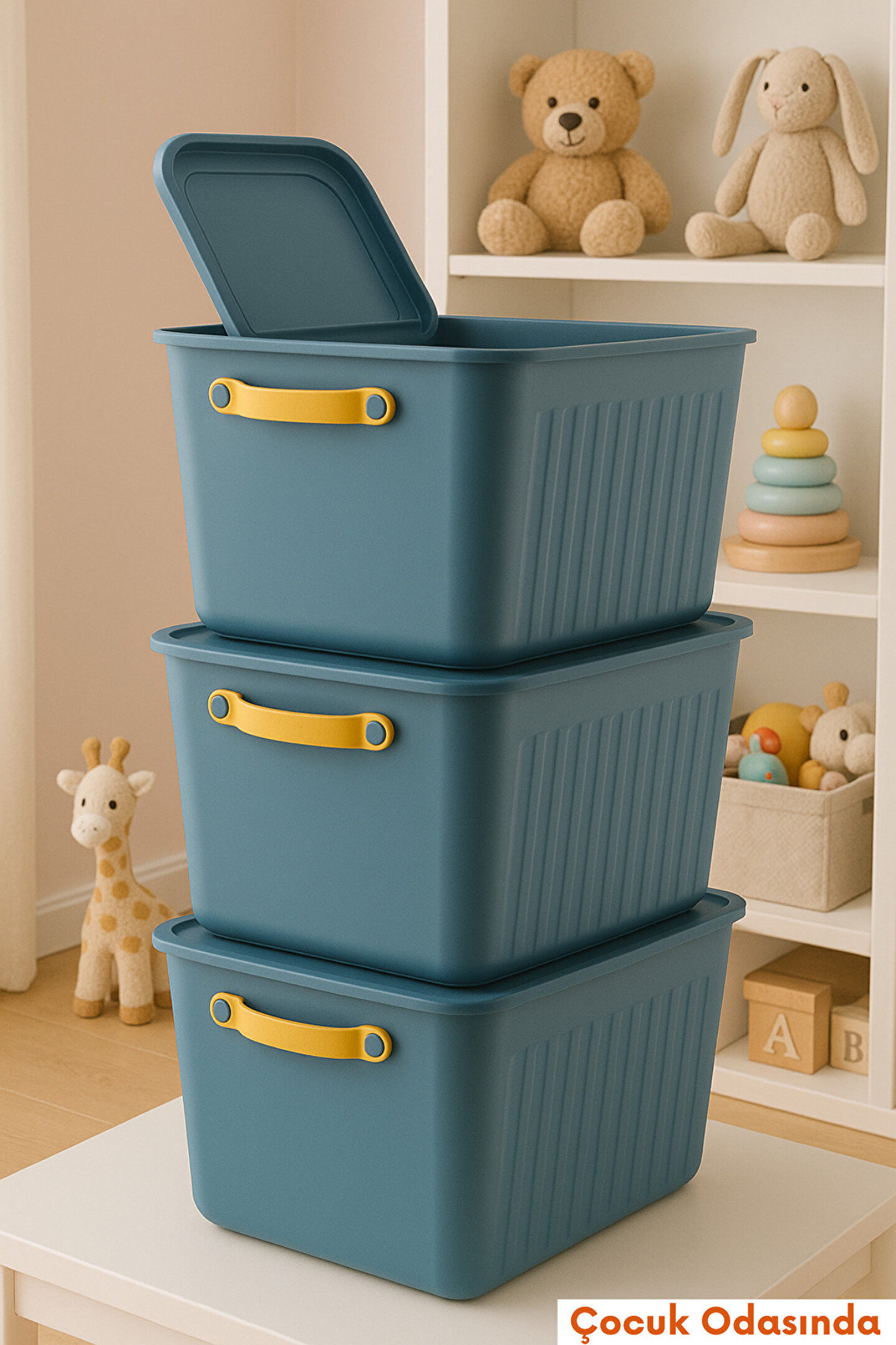 Modern tasarımı ve canlı renkleriyle evinize düzen katacak bu 3'lü kapaklı saklama kutusu seti, çamaşır odasından mutfağa, banyodan çocuk odasına kadar her alanda kullanıma uygundur. Dayanıklı plastik malzemeden üretilmiştir, üst üste yerleştirilebilir yapısı sayesinde yerden tasarruf sağlar. Her kutuda bulunan ergonomik sarı taşıma sapı sayesinde taşımak oldukça kolaydır.