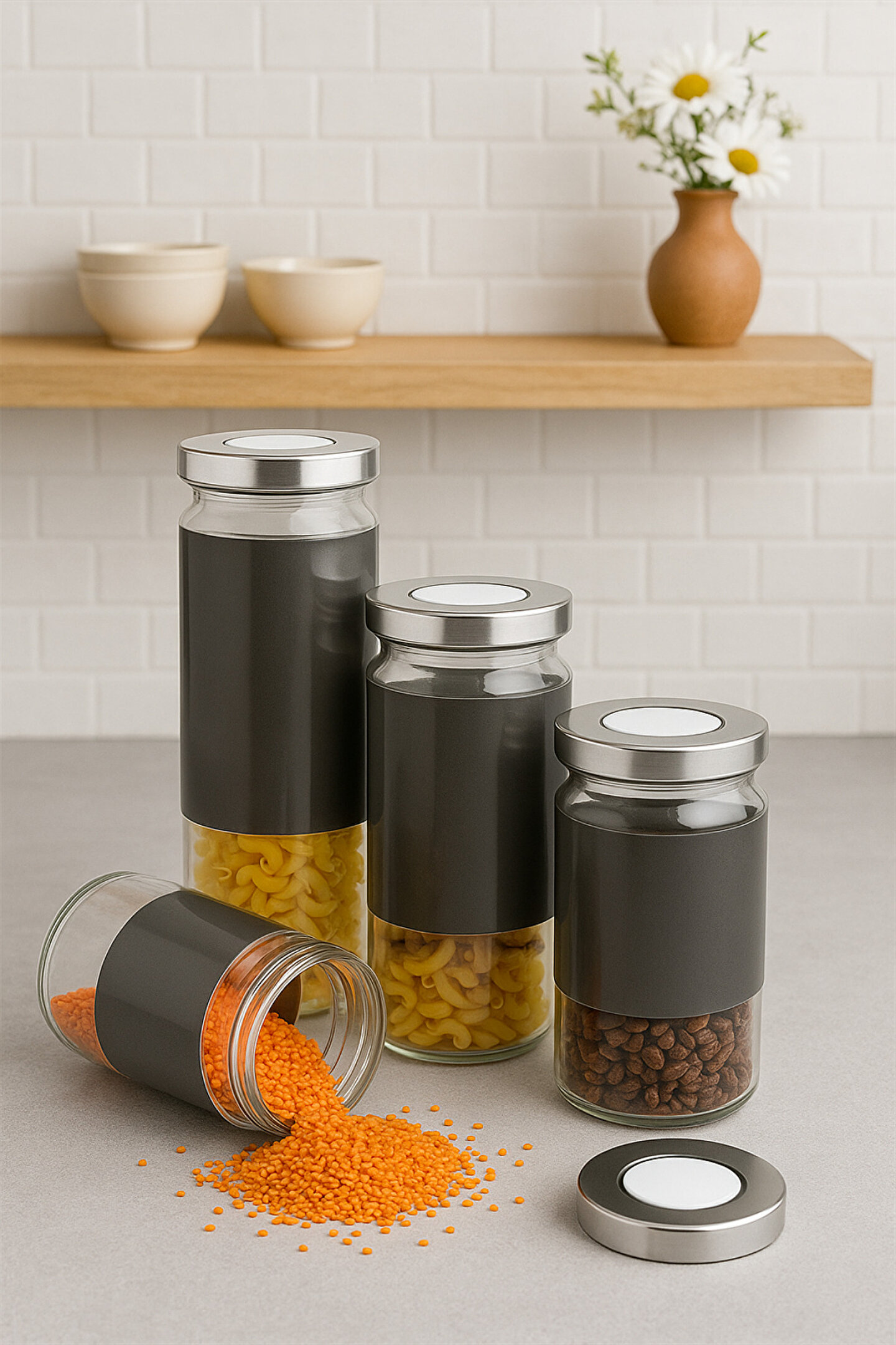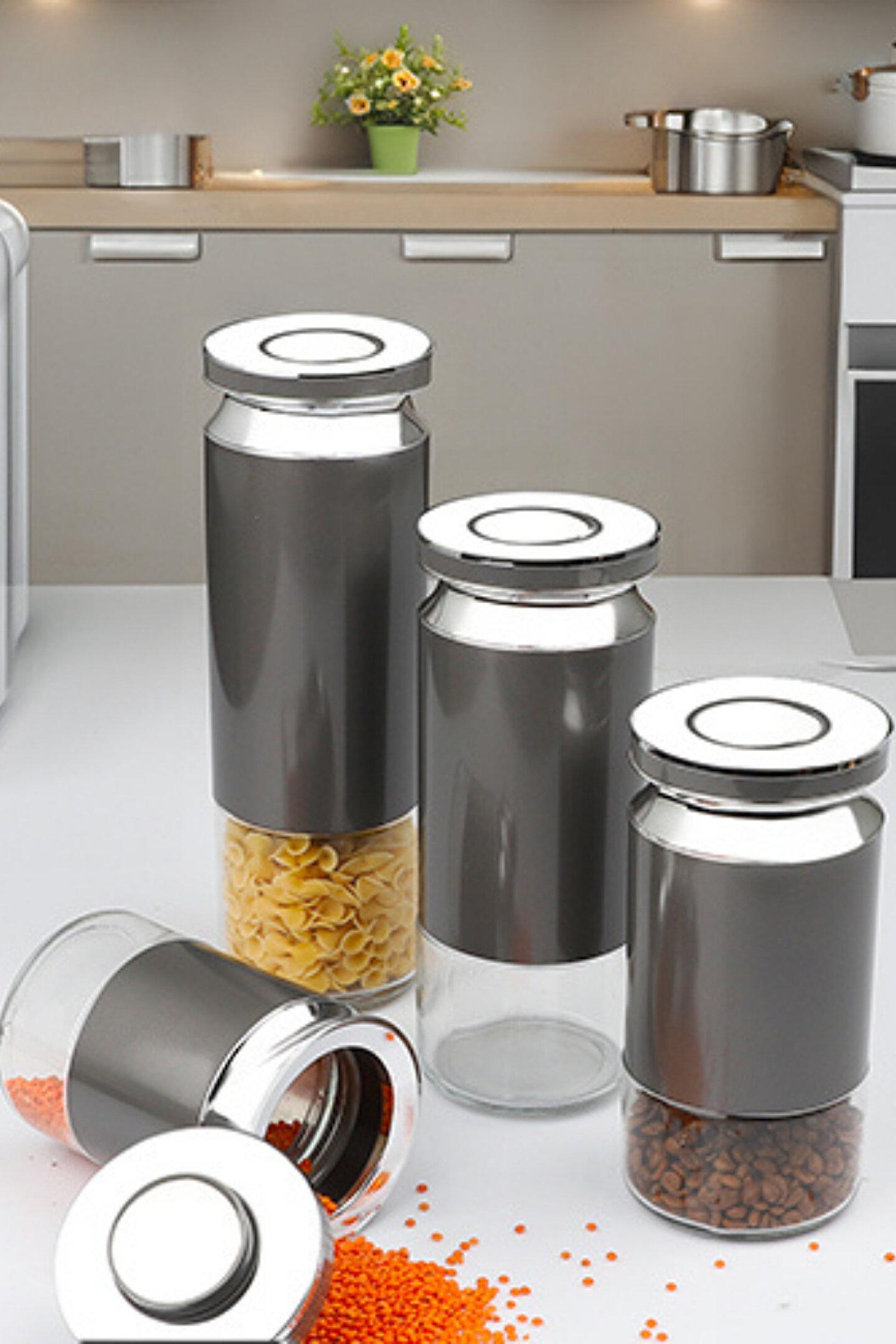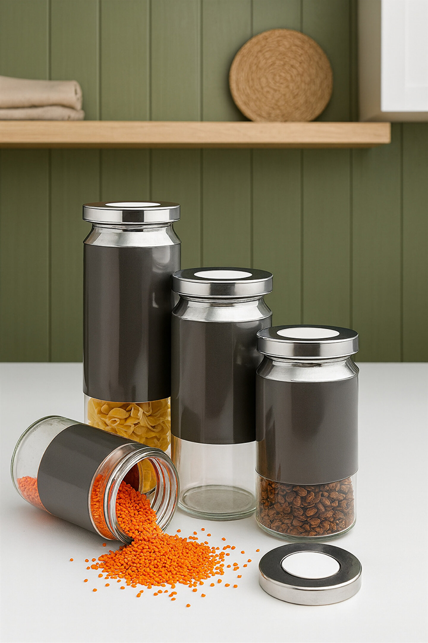 Modern gri tasarımlı 4’lü cam saklama kavanozu seti, paslanmaz çelik kapakları ve zarif formu ile tezgâhınızda dekoratif bir obje gibi dururken; makarna, bakliyat, kahve ve kuru gıdalarınızı düzenli ve taze tutmanıza yardımcı olur.
