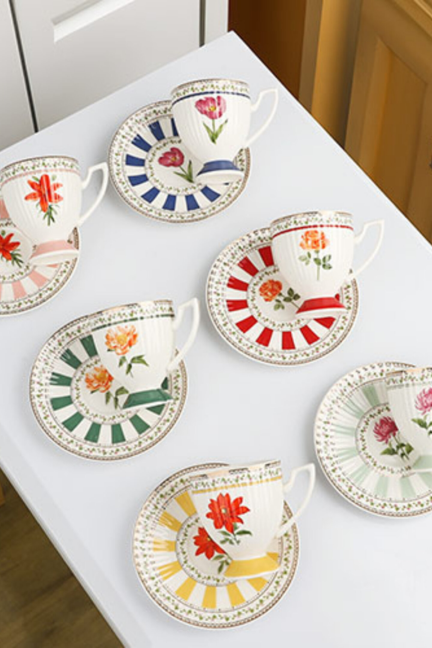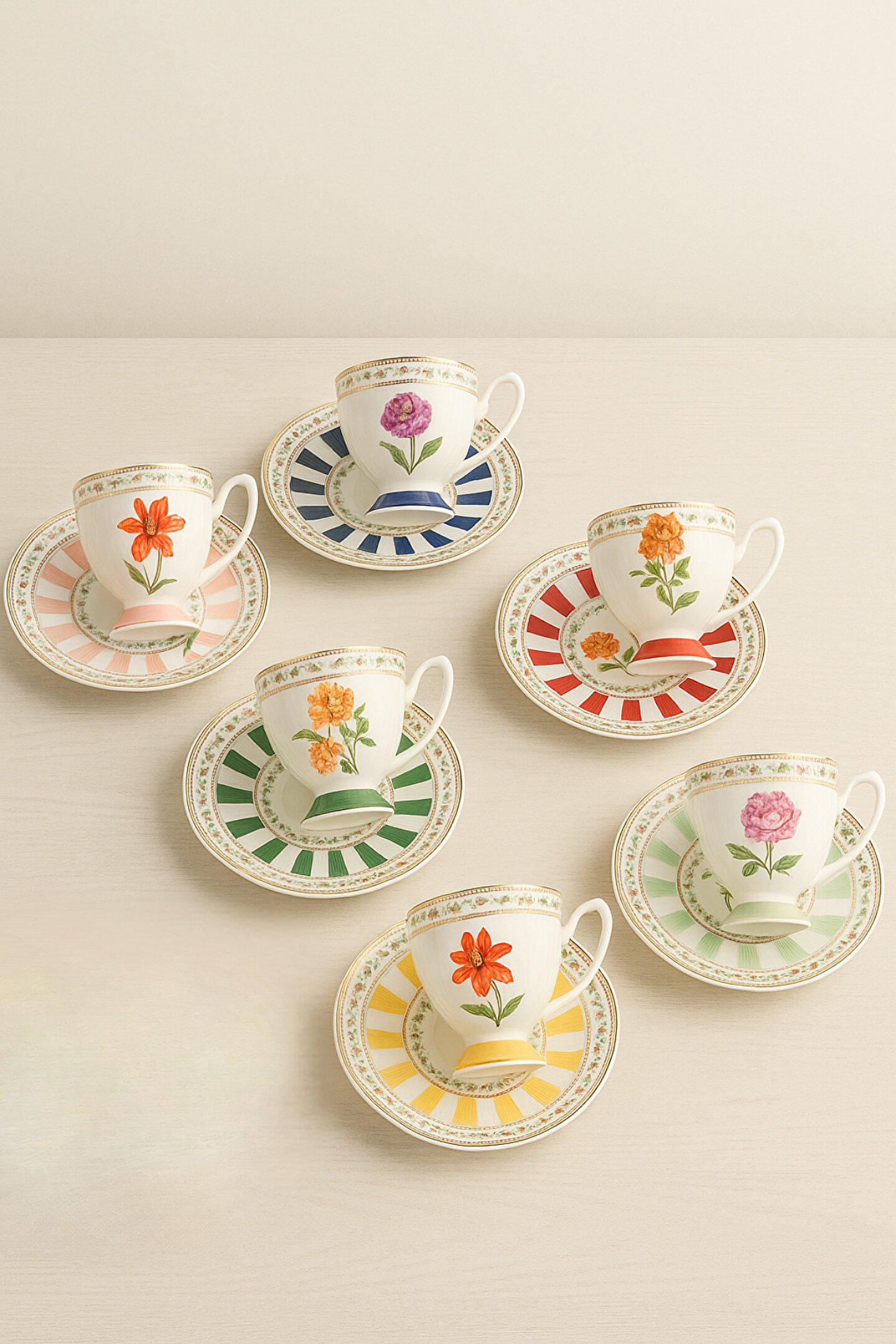 • 6 farklı renkte çiçek desenli fincan & tabak kombinasyonu