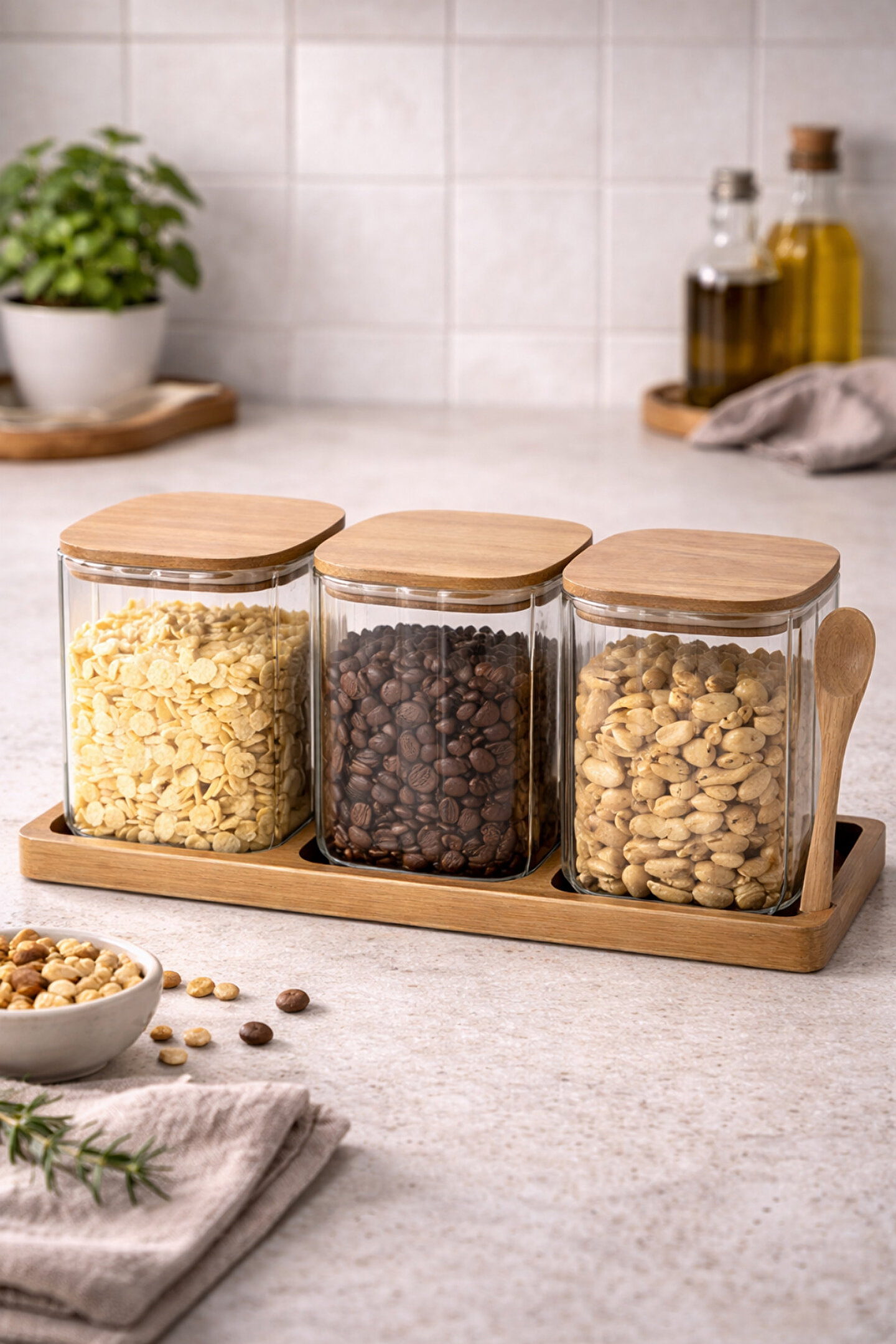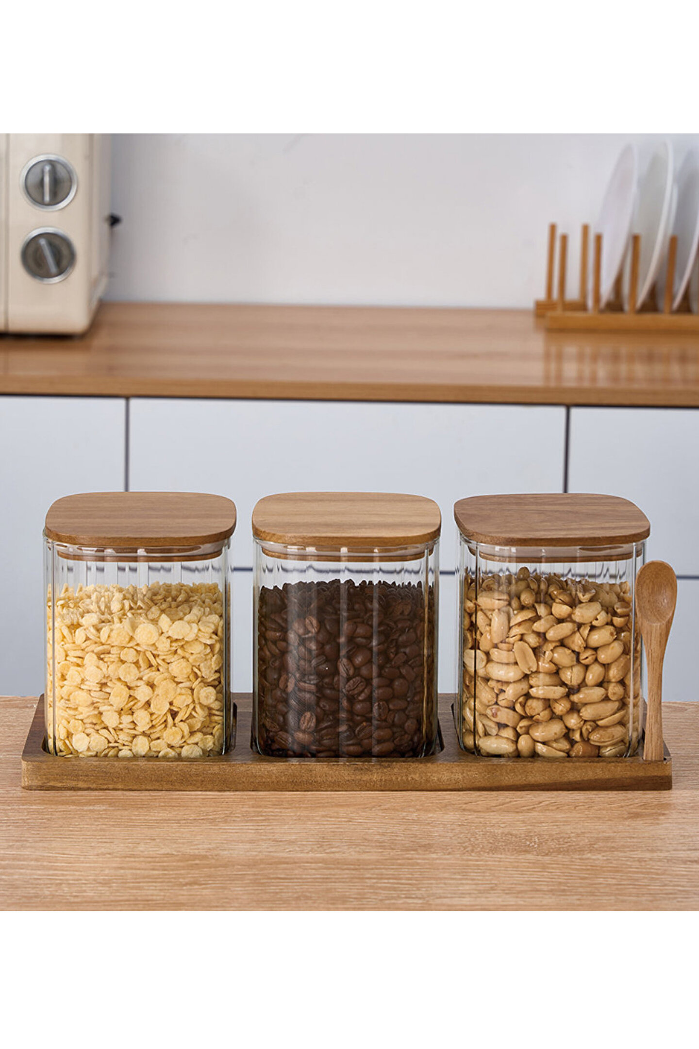 Set içeriği: 3 adet cam kavanoz + 1 adet ahşap stand + 1 adet ahşap kaşık