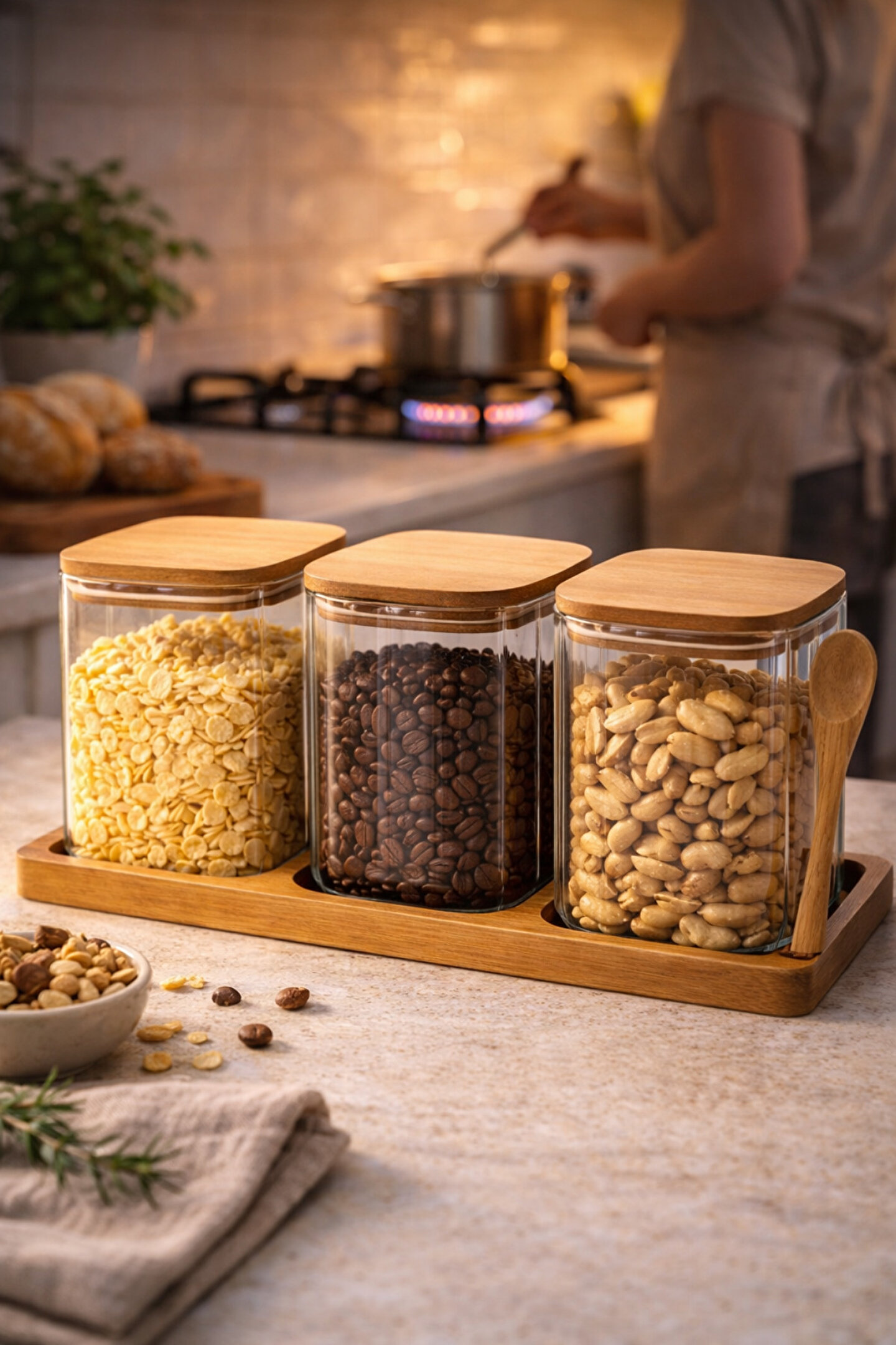 Welcomein 3’lü Cam Kavanoz Seti ile mutfağınızda hem düzeni sağlayın hem de doğal bambu dokusuyla şık bir görünüm yakalayın. Tezgâh üstü kullanım, kahve köşesi veya kahvaltılık alanı için ideal bir tamamlayıcıdır.
