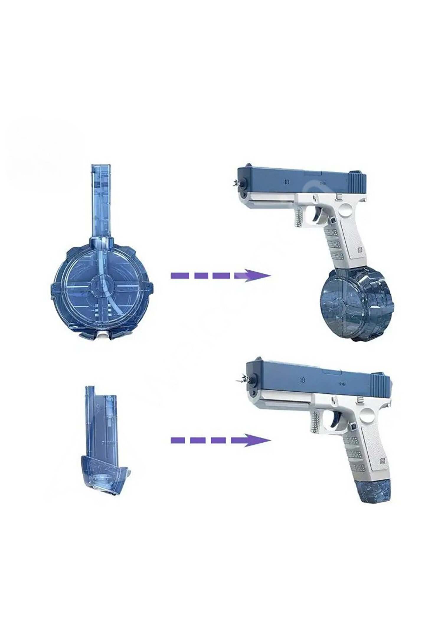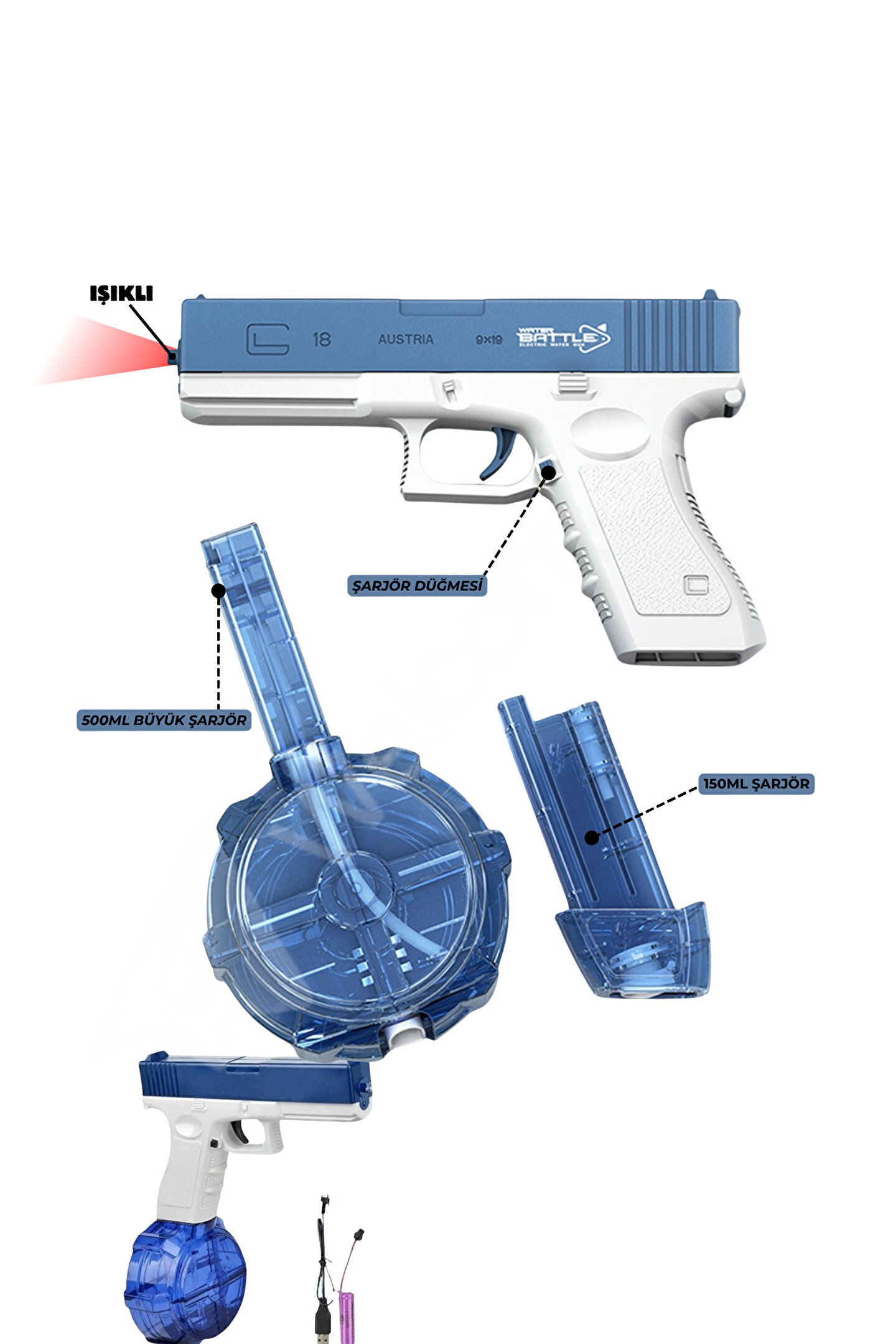 Yaz aylarının vazgeçilmezi olacak8-10 metre su atan ışıklı otomatik şarjlı su tabancası, güçlü performansı ve uzun menziliyle su savaşlarını bambaşka bir seviyeye taşıyor. 550 ml ve 150 ml kapasiteli iki ayrı su haznesi sayesinde uzun süre kesintisiz eğlence sunar. LED ışık efektleriyle gece ve gündüz kullanımda ekstra keyif verir. Otomatik atış sistemi sayesinde sadece tetiğe basarak yüksek basınçlı su fışkırtır. Şarjlı yapısı ile pille uğraşma derdi olmadan tekrar tekrar kullanabilirsiniz. Dayanıklı malzemesi, ergonomik tasarımı ve suya dayanıklı yapısıyla hem çocuklar hem de yetişkinler için idealdir. Havuzda, plajda veya bahçede sınırsız eğlencenin tadını çıkarın!