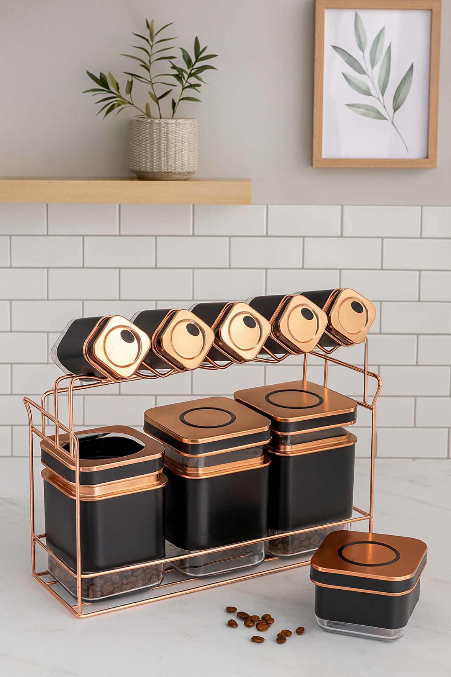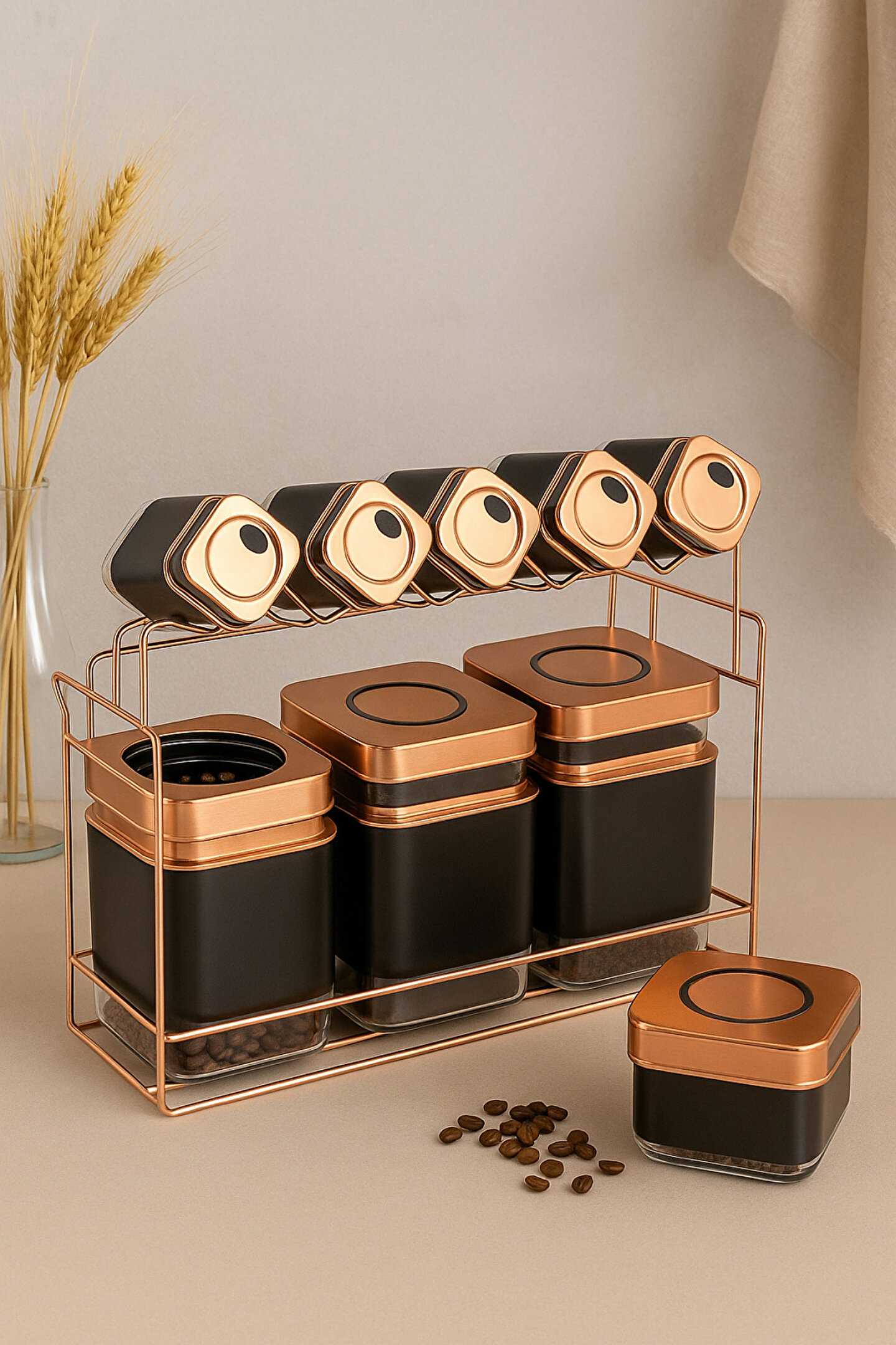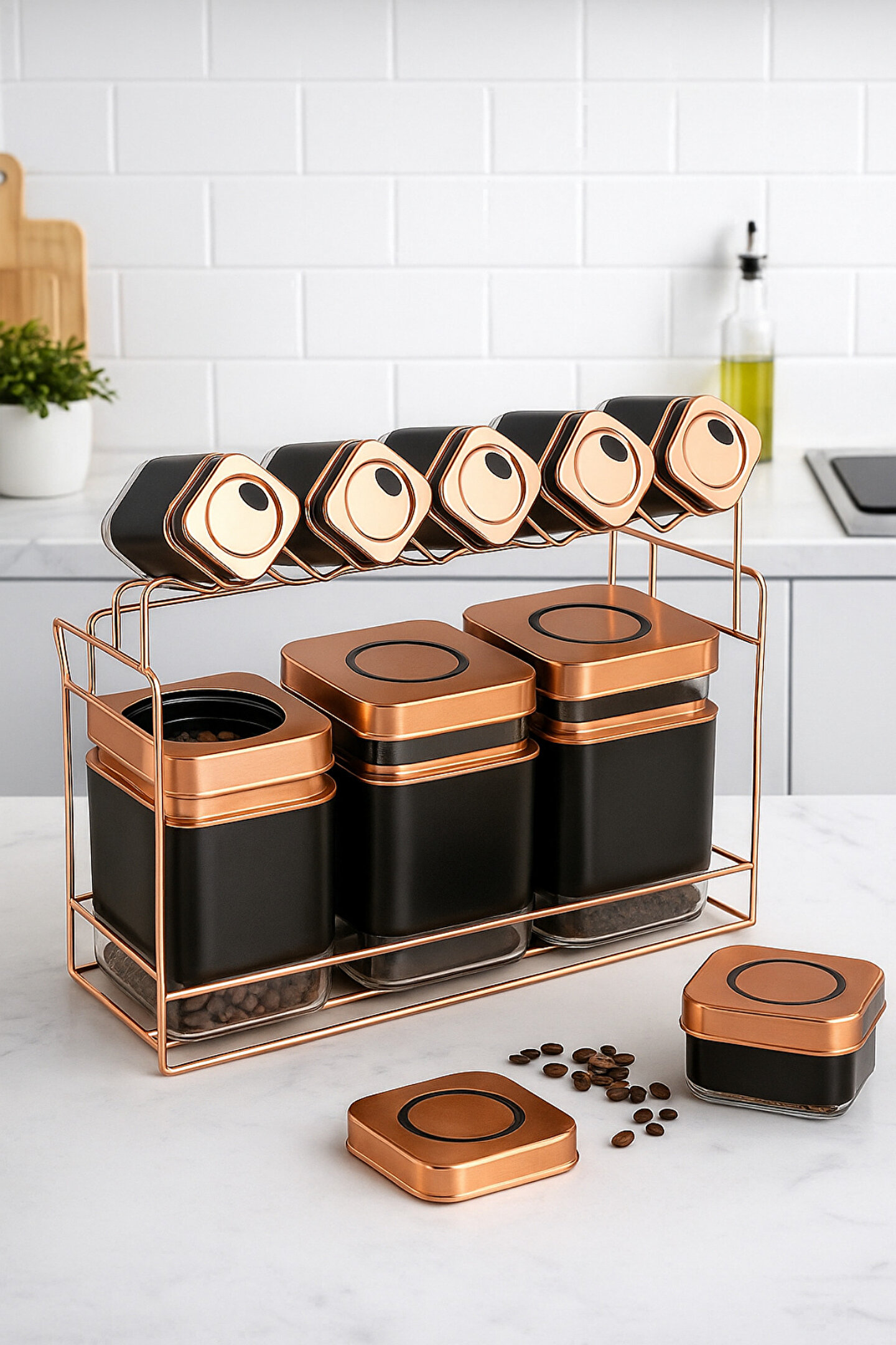 Mutfağınızda hem şıklık hem düzen istiyorsanız, bakır detaylı bu 9’lu saklama kabı ve baharatlık seti tam size göre. Siyah mat gövde ve rose gold/bakır kapak kombinasyonu, modern tezgahlarla mükemmel uyum sağlar; metal standı sayesinde tüm kavanozlarınız tek yerde, derli toplu durur.