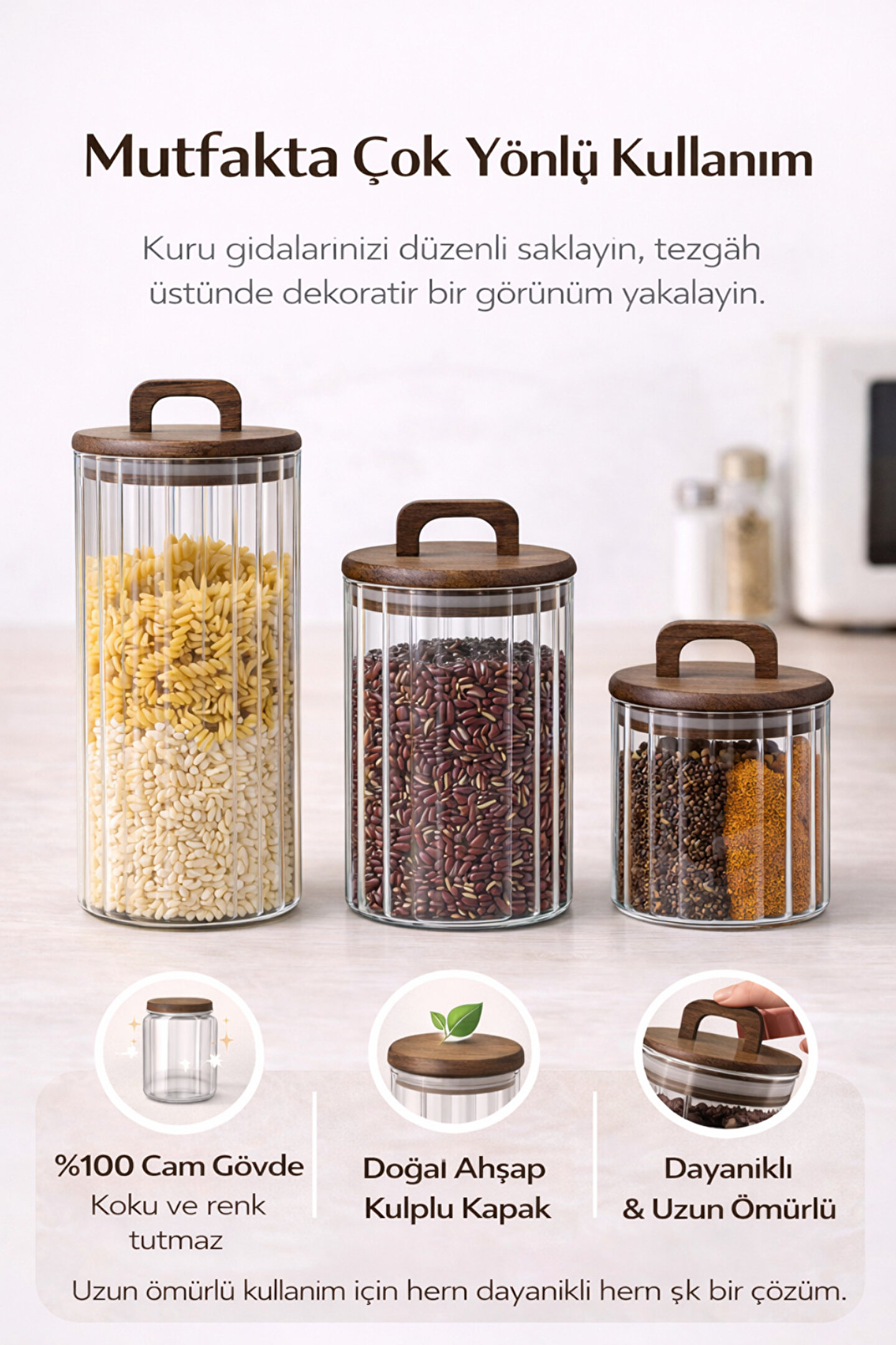 Farklı hacimlere sahip 3’lü set içeriği sayesinde bakliyat, makarna, kuruyemiş, kahve, baharat ve atıştırmalıkları güvenle saklayabilirsiniz. %100 cam gövdesi koku ve renk tutmaz, doğal ahşap kulplu kapağı ise hem estetik hem de kullanım kolaylığı sağlar.