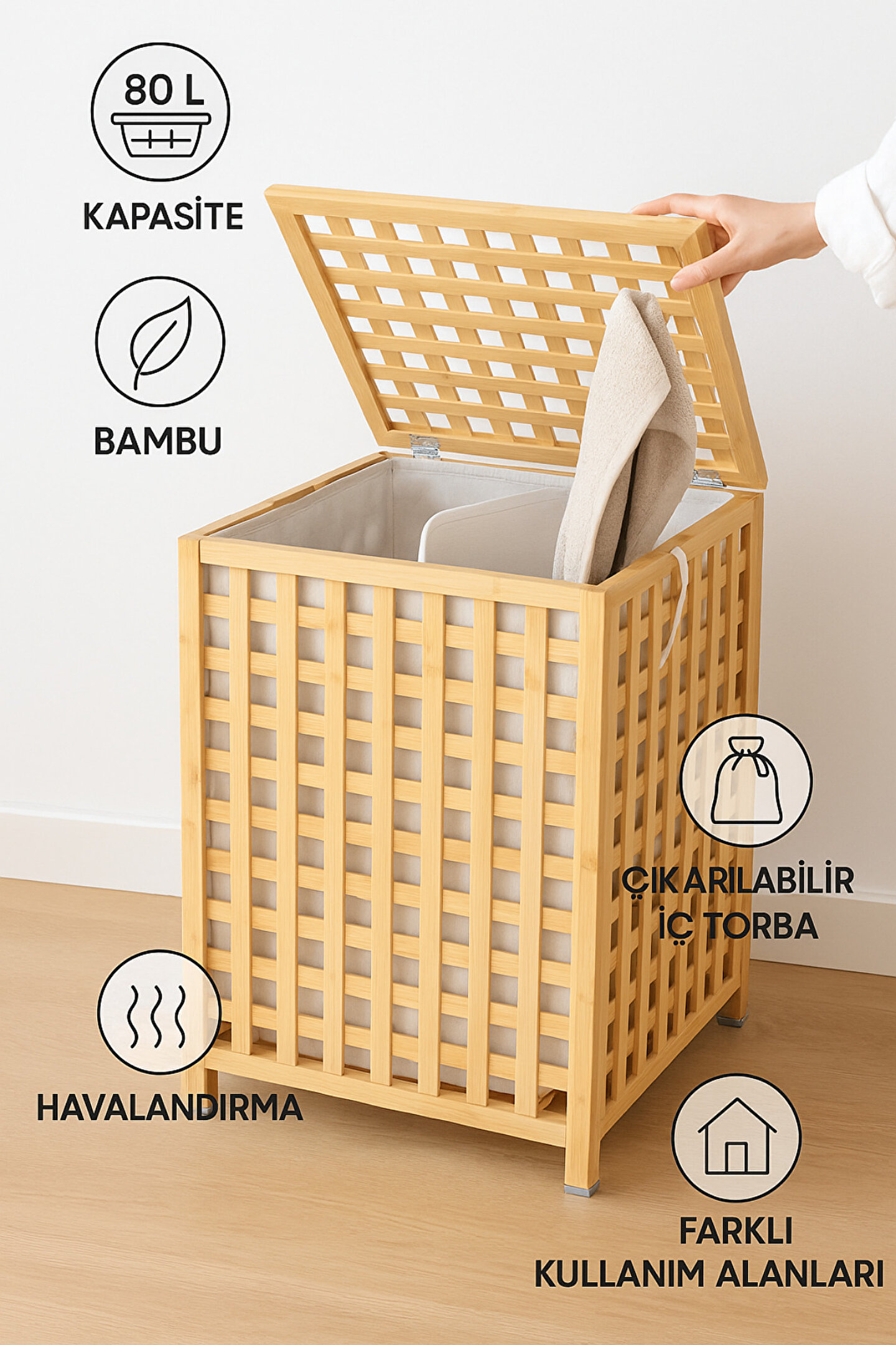 Welcomein bambu çamaşır sepeti ile dağınık çamaşırlar şık bir detaya dönüşsün.; Doğal bambu gövdesi, modern kafes deseni ve kapaklı tasarımı sayesinde hem banyonuzda hem yatak odanızda dekoratif bir görünüm sunar.; Doğal bambu malzeme ile sıcak ve modern görünüm Koku ve nem oluşumunu azaltmaya yardımcı hava alan kafes tasarım Makinede yıkanabilir, çıkarılabilir iç kumaş torba Yanlarda taşıma sapları ile kolayca taşınabilir Çamaşır, oyuncak, battaniye ve düzen kutusu olarak çok amaçlı kullanım Geniş iç hacmi sayesinde tüm aile bireylerinin çamaşırlarını tek sepette toplayabilir, kapağı sayesinde dağınık görüntüyü gizleyerek evinizde her zaman düzenli ve ferah bir atmosfer yakalayabilirsiniz.;