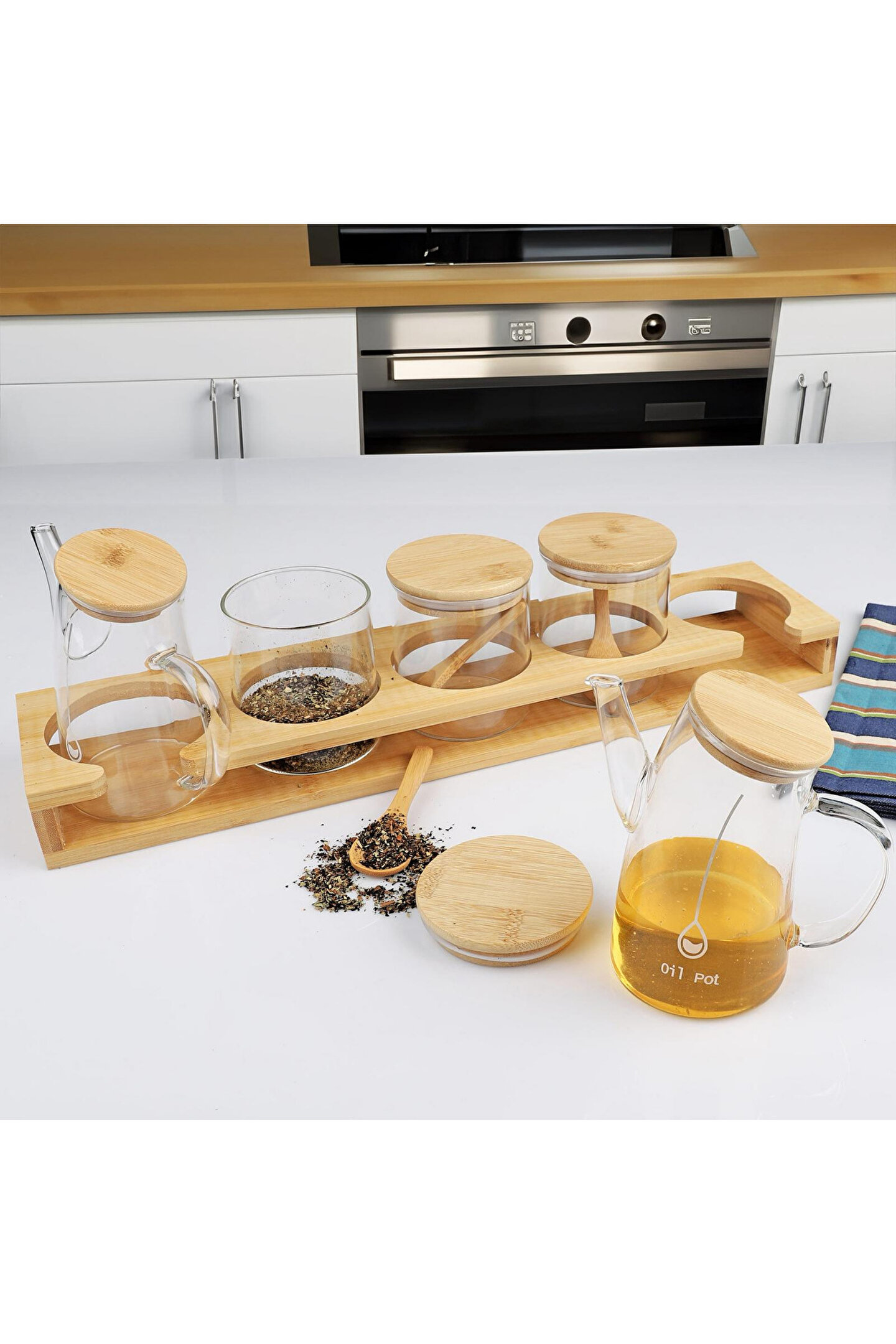 Bambulu Cam Baharatlık Salata Sos Kapları & Yağlık Seti – Kapaklı Standlı 6 Parça Düzenleyici