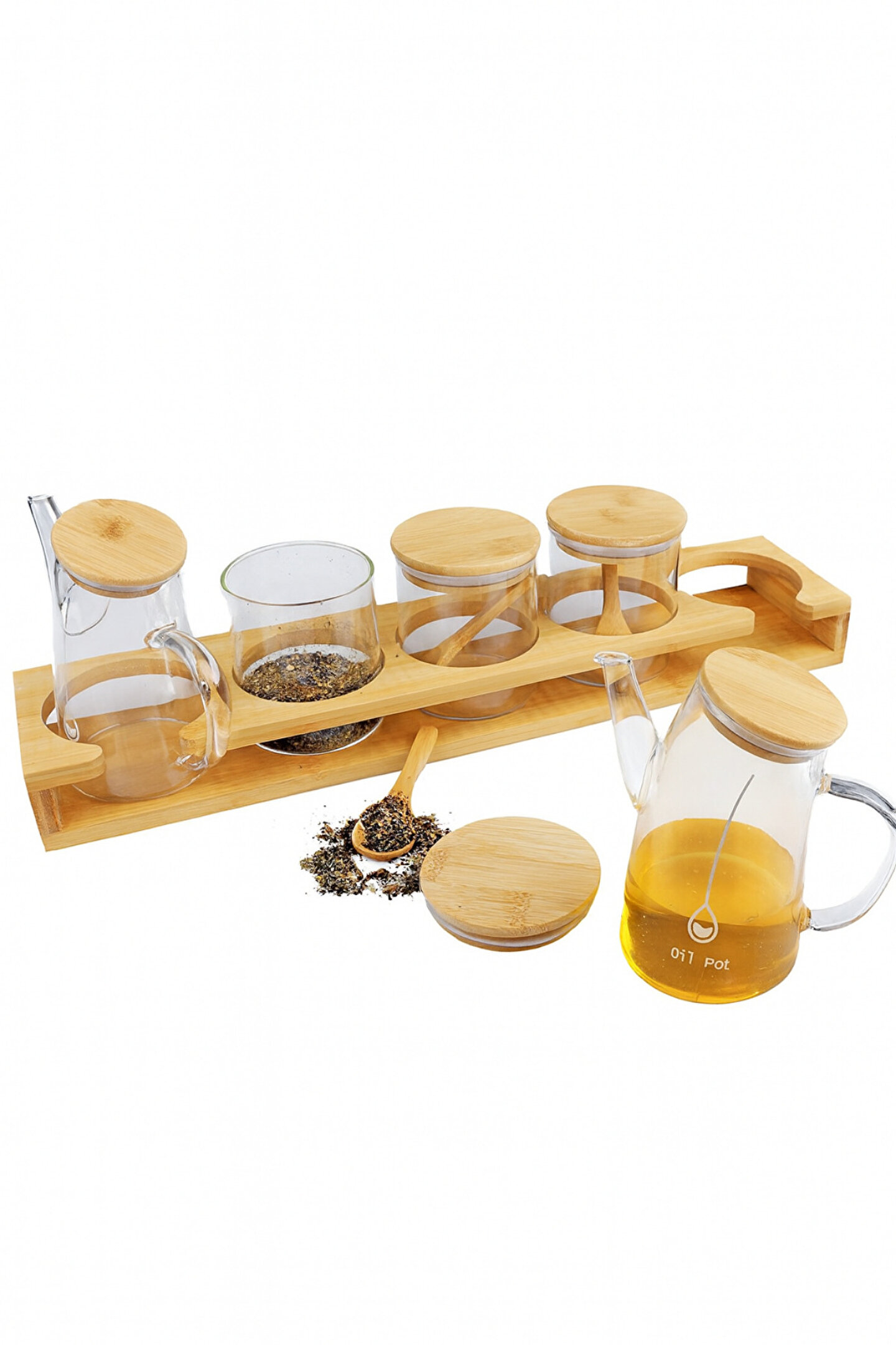 Mutfaklarınızda hem şıklığı hem de düzeni sağlayacak Bambulu Cam Baharatlık & Yağlık Seti, modern tasarımı ve kullanışlı yapısıyla günlük kullanım için idealdir.