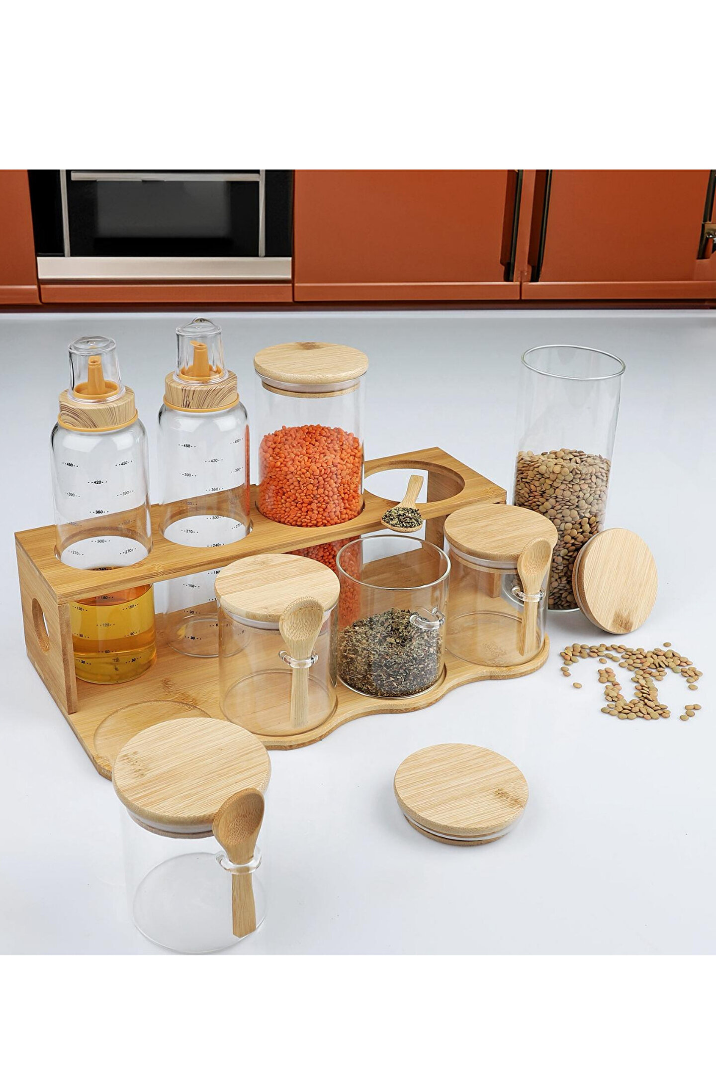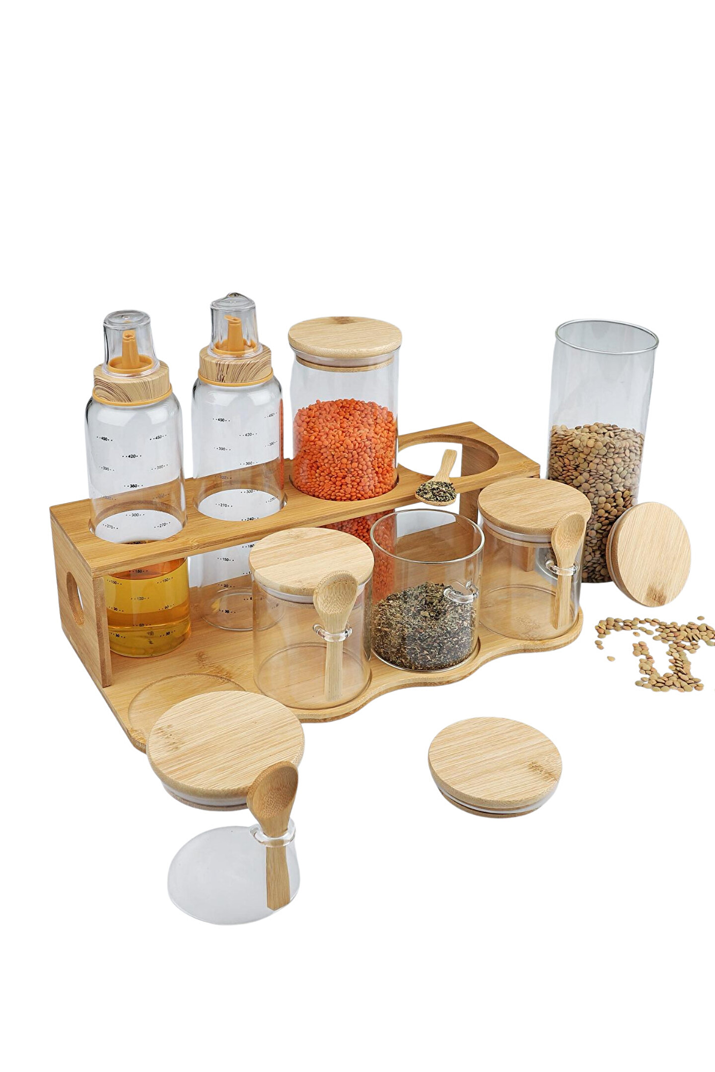 Mutfak düzenini şıklıkla buluşturan Bambulu Cam Baharatlık & Yağlık Seti, doğal bambu standı, kapaklı cam kavanozları ve ölçülü yağlık şişeleriyle günlük kullanım için ideal bir çözümdür.