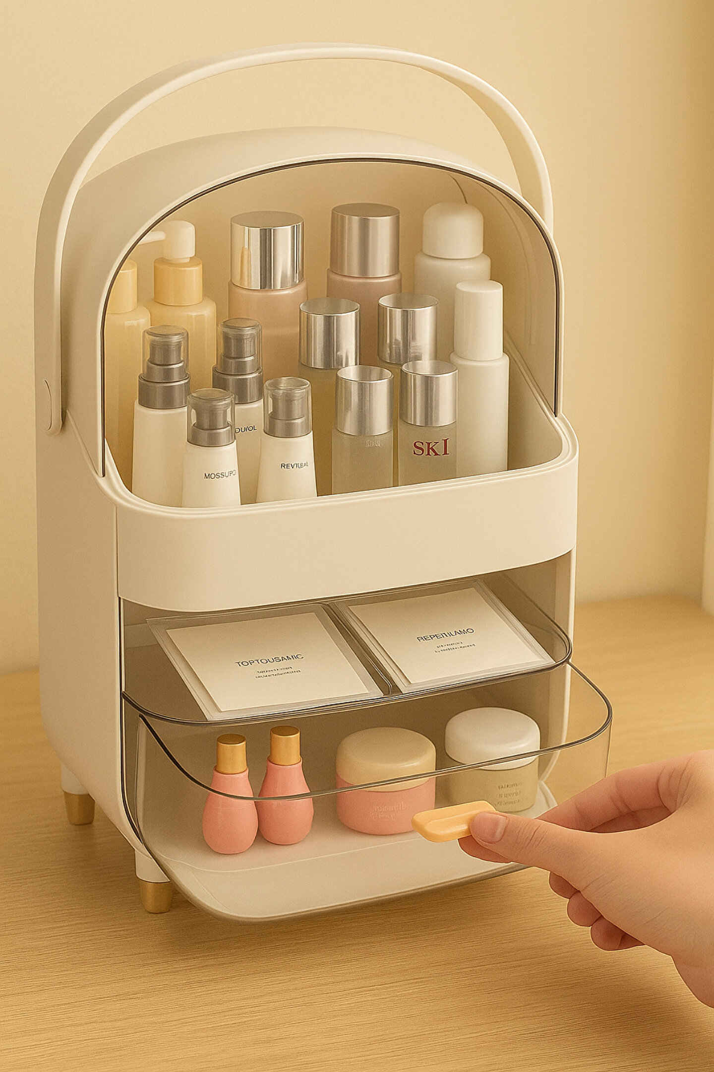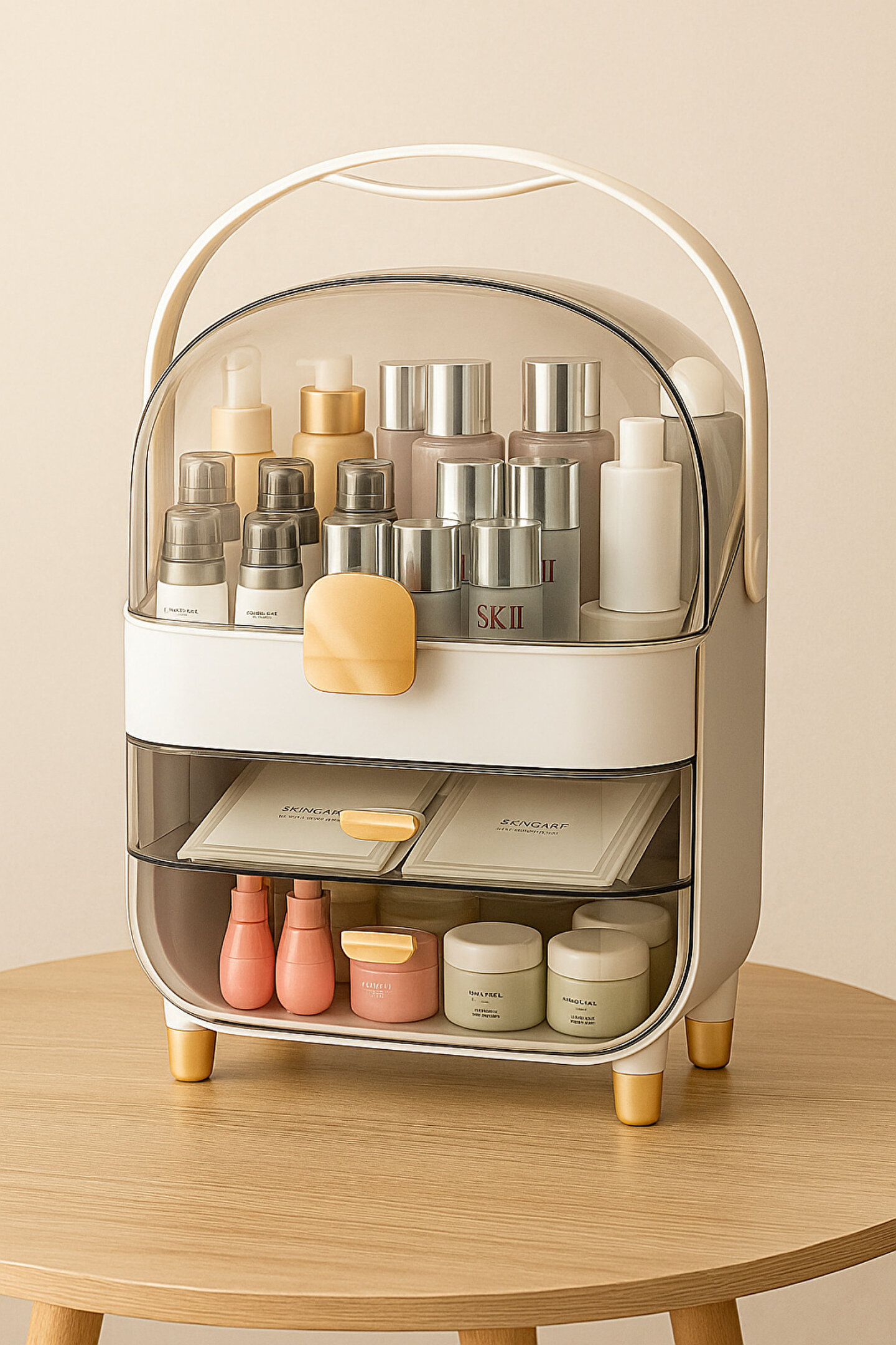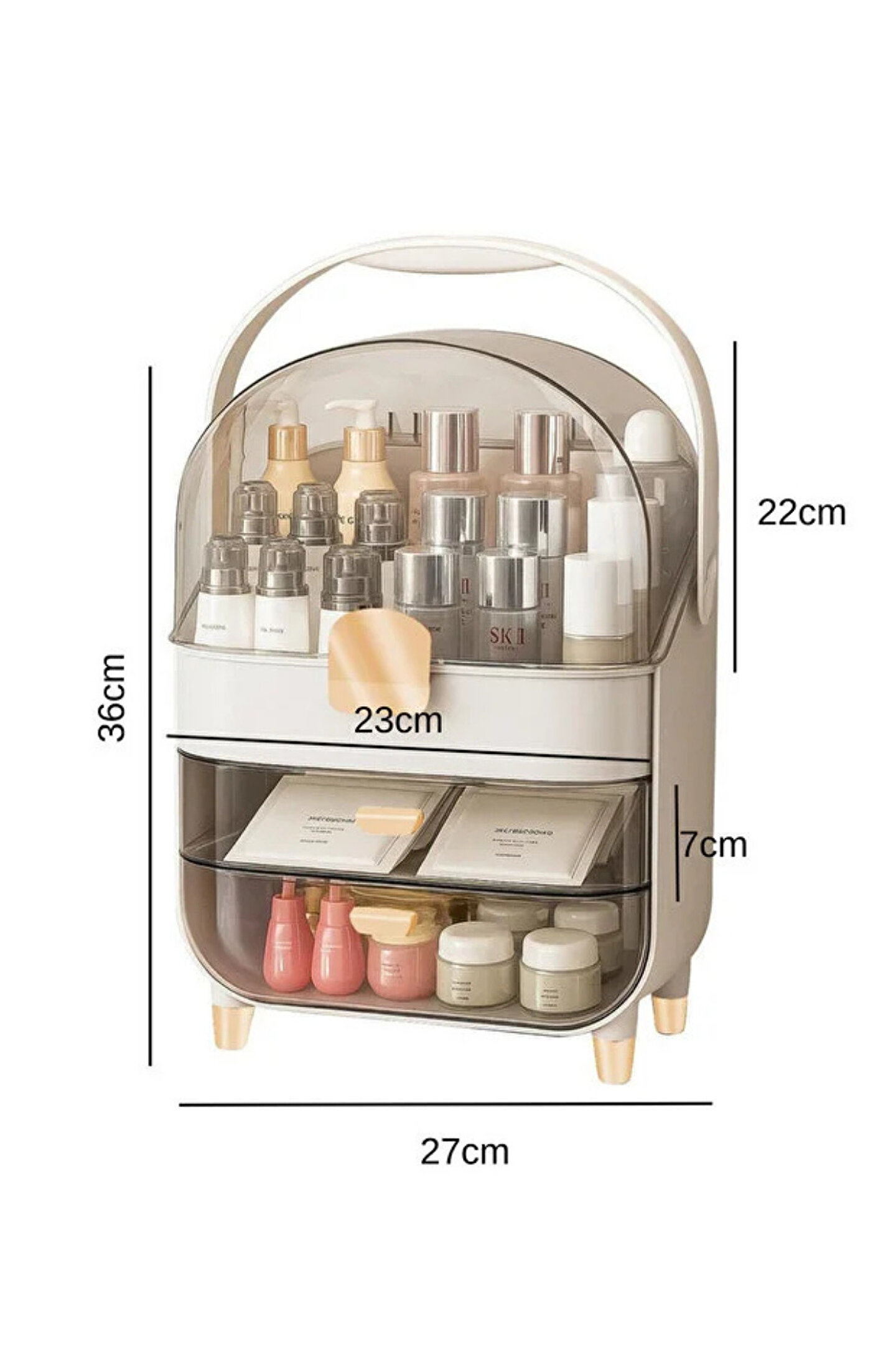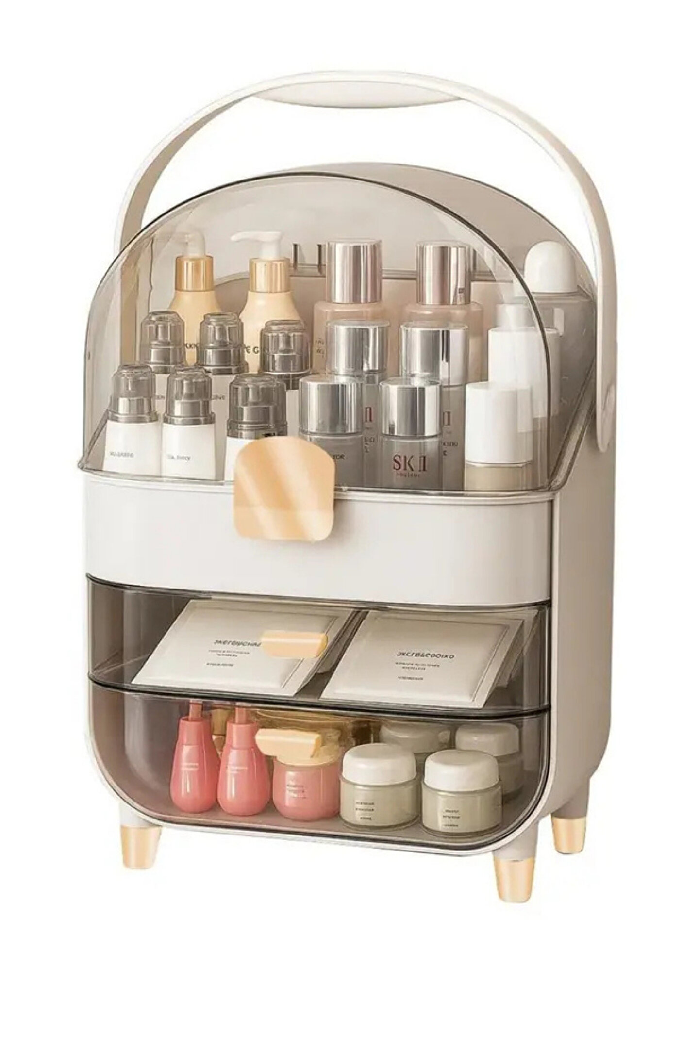 kozmetik organizeri, geniş iç hacmi sayesinde tüm bakım ürünlerinizi düzenli ve kolay erişilebilir şekilde saklamanızı sağlar.