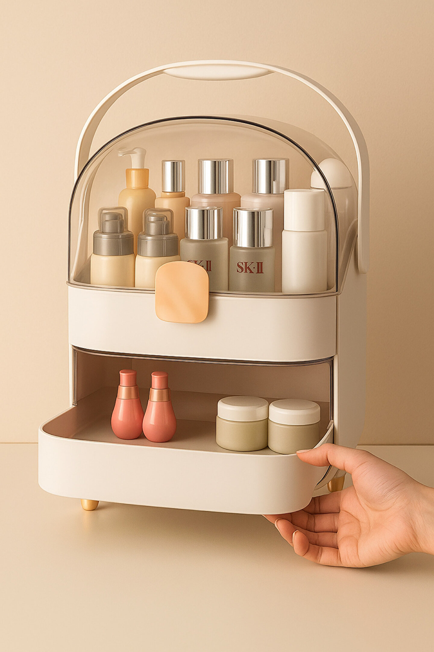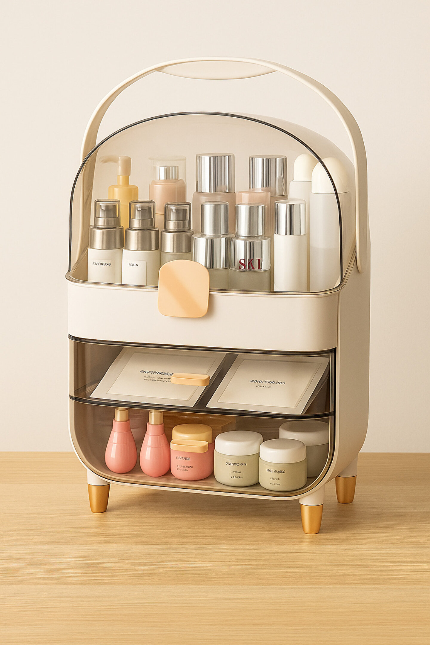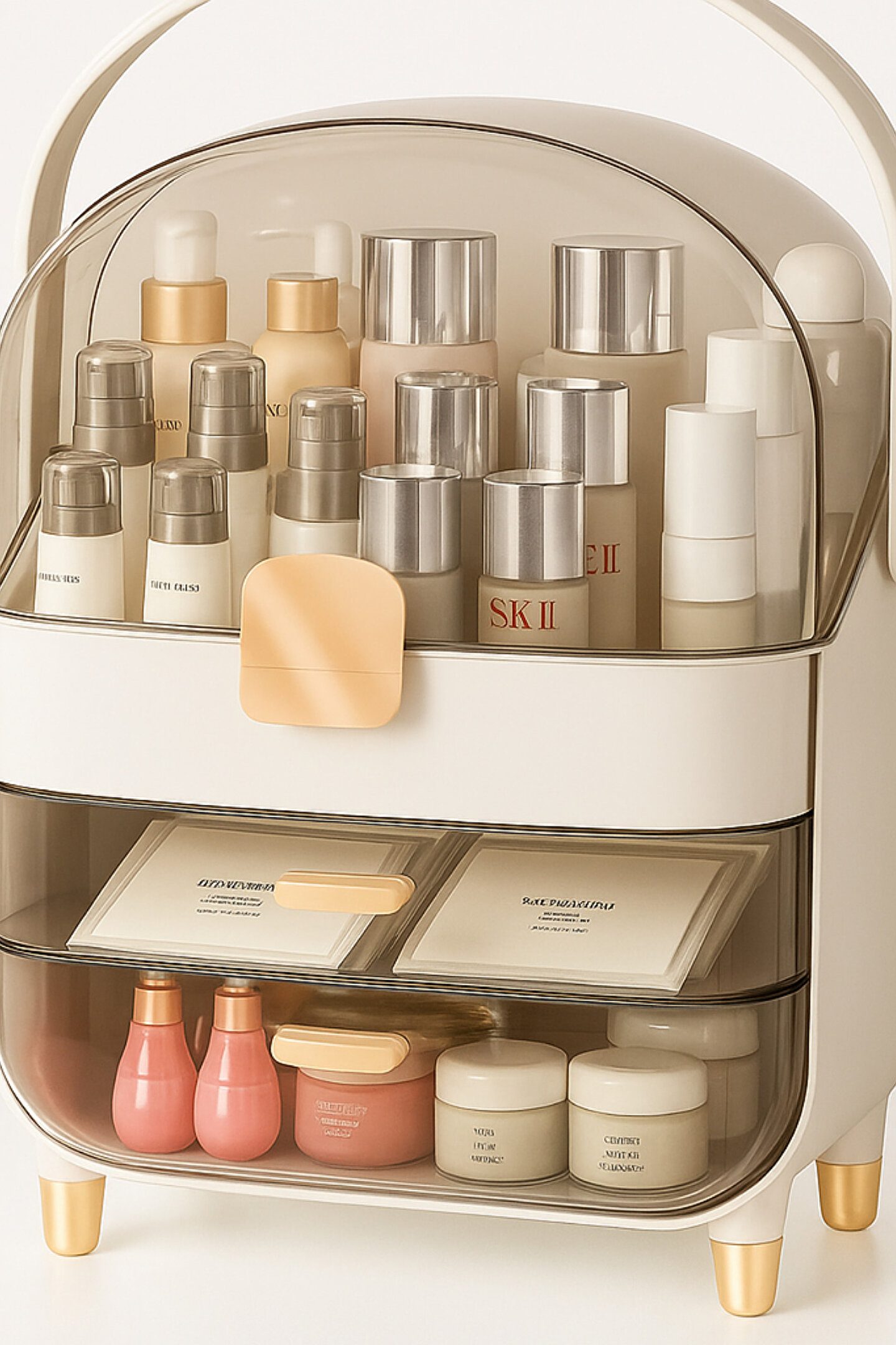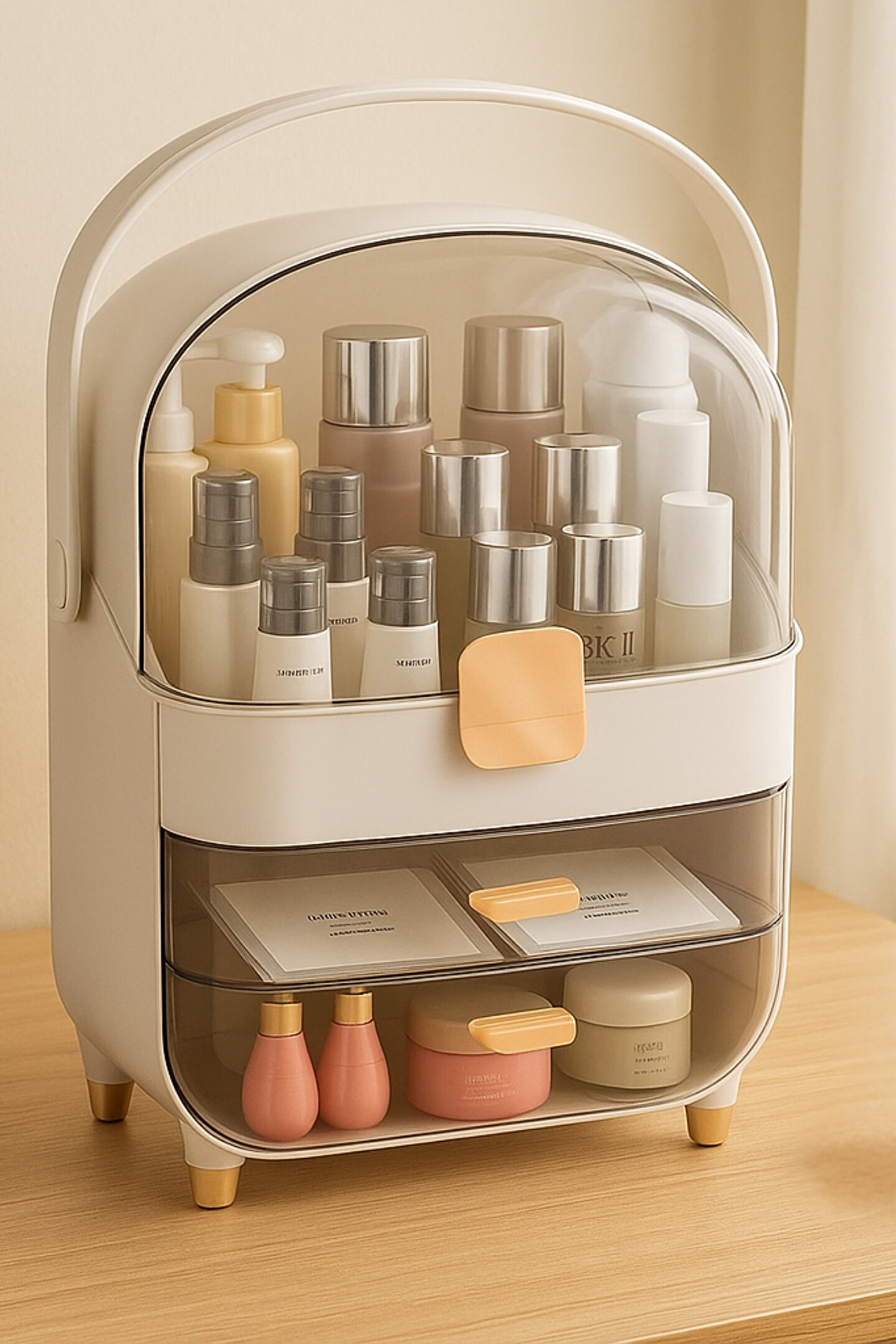 kozmetik organizeri, geniş iç hacmi sayesinde tüm bakım ürünlerinizi düzenli ve kolay erişilebilir şekilde saklamanızı sağlar.