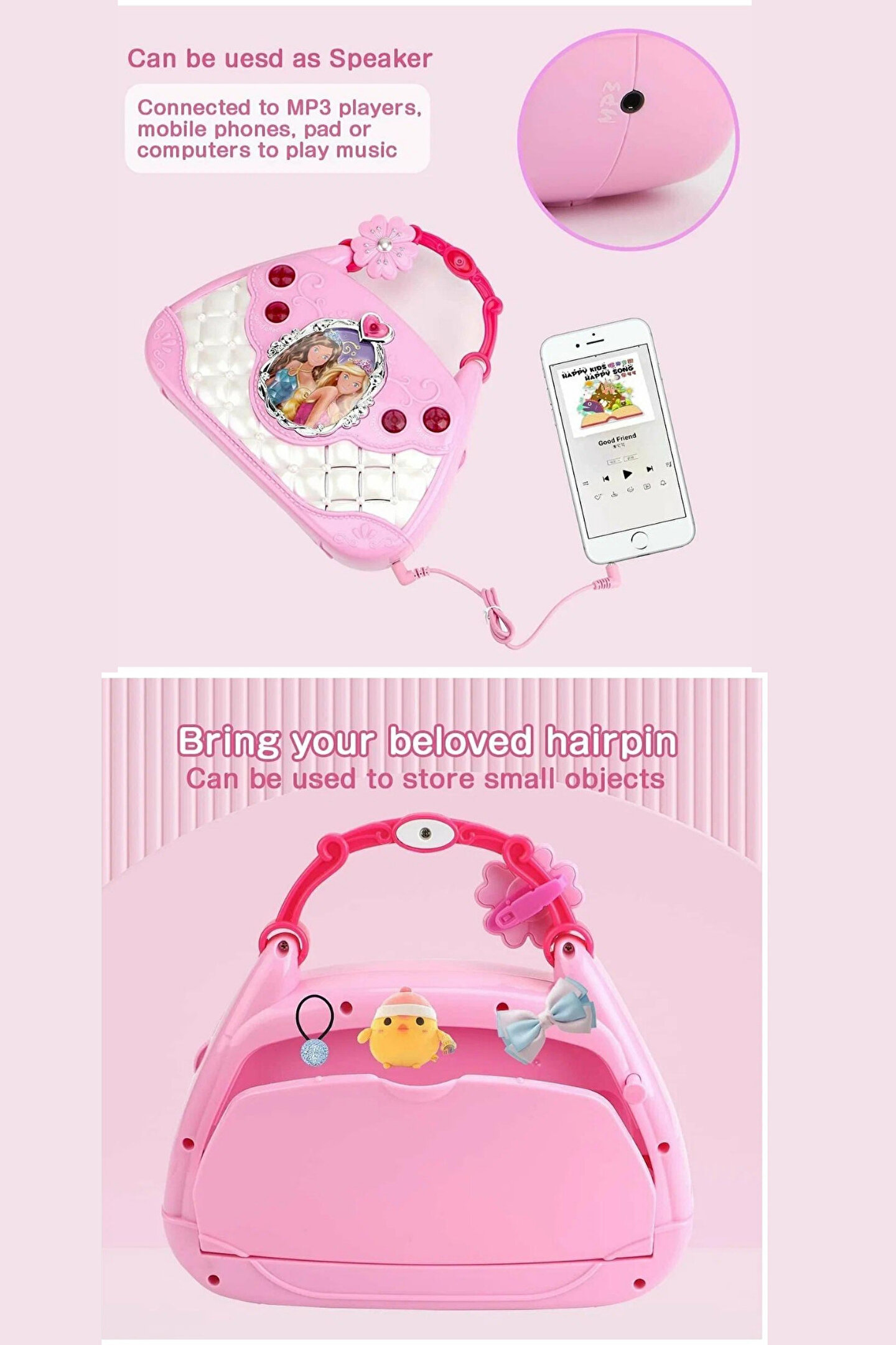 Mikrofon ve MP3 Çalar: ; Oyuncak set, bir mikrofon ve entegre bir MP3 çalar içerir. Bu sayede çocuklar, sevdikleri şarkıları söyleyebilir ve kendi performanslarını gerçekleştirebilirler. ; Karaoke ve Parti Teması: ; Set, karaoke özellikleriyle çocuklara kendi şarkılarını söyleme ve arkadaşlarıyla eğlenceli parti müzikleri yapma fırsatı sunar. ; El Çantası Tasarımı: ; Oyuncak, taşıması kolay bir el çantası tasarımına sahiptir. Bu, çocukların oyuncaklarını istedikleri yere kolayca taşımalarına ve paylaşmalarına olanak tanır. ; Renkli ve Çekici Tasarım: ; El çantası ve içindeki oyuncaklar renkli ve çekici bir tasarıma sahiptir. Bu, çocukların dikkatini çeker ve oyuncaklarıyla etkileşimde bulunmalarını teşvik eder. ; Eğlenceli Ses Efektleri: ; Oyuncak mikrofon ve MP3 çalar, eğlenceli ses efektleri içerebilir. Bu, çocukların performanslarını daha keyifli hale getirir. ; Güvenli ve Dayanıklı Malzemeler: ; Tüm oyuncaklar, çocuk güvenliği gözetilerek tasarlanmış dayanıklı malzemelerden üretilmiştir. ; Pil İle Çalışma: ; Set, genellikle pil ile çalışır, böylece çocuklar istedikleri zaman ve her yerde müzikle etkileşimde bulunabilirler. ; Eğitici ve Geliştirici: ; Karaoke ve müzikal etkileşim, çocukların müzikle ilgili temel becerilerini geliştirmelerine ve özgüven kazanmalarına yardımcı olabilir. ;