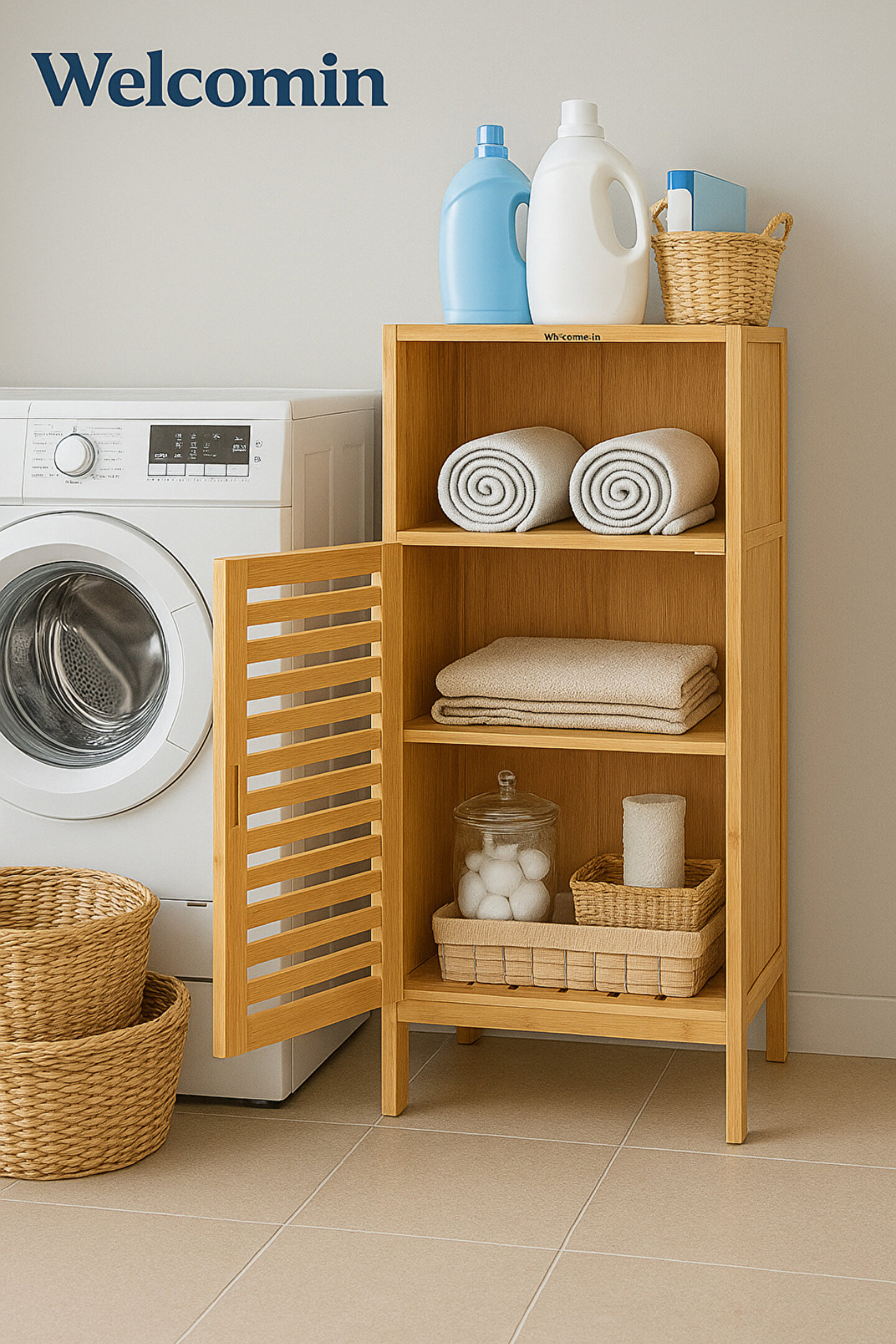 Doğal bambu malzemeden üretilen Welcomein banyo ve çamaşır dolabı, tek kapaklı panjur tasarımı ve 4 raflı yapısıyla balkon, banyo ve çamaşır alanlarında şık ve düzenli saklama alanı sunar.