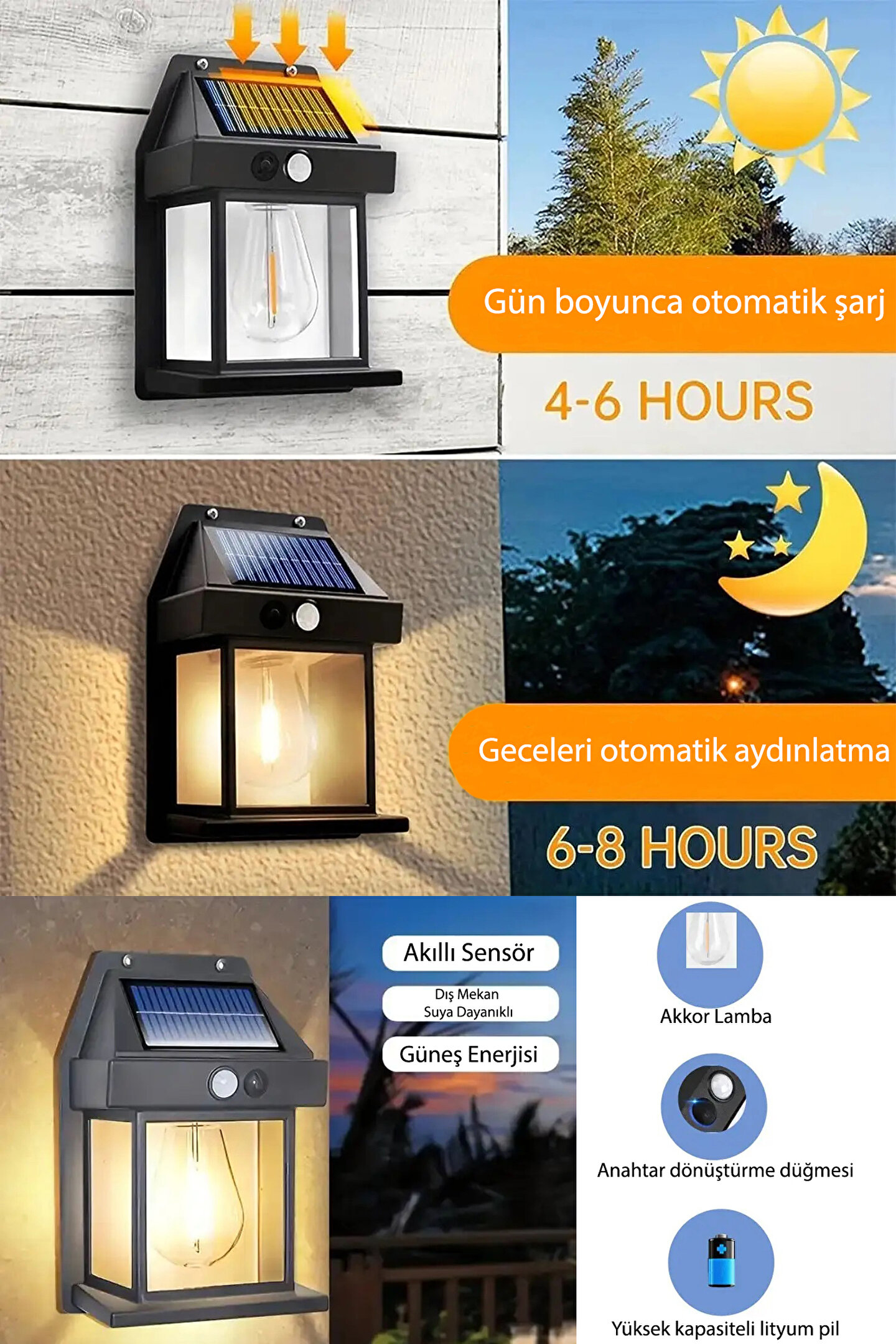 2024 model yeni suya dayanıklı hareket sensörlü güneş enerjili solar led dış mekan bahçe lambası Duvar tipi bahçe aydınlatmaları, dış mekanlarda estetik bir görünüm sağlarken aynı zamanda güvenliği ve aydınlatmayı artıran dekoratif aydınlatma çözümleridir.; Bu aydınlatmalar, bahçelerde, teraslarda, patikalarda ve diğer dış mekan alanlarında kullanılmak üzere tasarlanmıştır.; Bu tip aydınlatmalar genellikle duvara monte edilir ve farklı tasarım ve özelliklere sahip olabilirler.; Bazıları modern ve şık bir görünüme sahipken, diğerleri daha geleneksel veya rustik bir tarzda tasarlanmış olabilir.; Duvar tipi bahçe aydınlatmalarının birçok faydalı özelliği vardır: Aydınlatma ve Güvenlik: Bahçe ve dış mekanların karanlık köşelerini aydınlatarak güvenliği artırır.; Bu aydınlatmalar, geceleyin yürüyüş yaparken veya dış mekan etkinlikler düzenlerken daha iyi görünürlük sağlar.; ; Dekoratif Görünüm: Çeşitli tasarım seçenekleri sayesinde bahçenize veya terasinize estetik bir dokunuş ekler.; Farklı tarzlarda ve boyutlarda olan bu aydınlatmalar, dış mekanınızın dekorasyonuna uyum sağlar.; ; Enerji Verimliliği: Çoğu duvar tipi bahçe aydınlatması LED teknolojisini kullanır, bu da enerji tasarrufu sağlar ve uzun ömürlüdür.; ; Dayanıklılık: Dış mekan koşullarına dayanıklı olarak tasarlanmıştır, bu nedenle suya, nem ve hava koşullarına karşı dirençlidirler.; ; Kolay Montaj: Duvara monte edilerek kolayca kurulabilirler ve genellikle elektrik bağlantısı gerektirirler.; ; Duvar tipi bahçe aydınlatmaları, dış mekan alanlarınızı aydınlatırken estetik ve işlevselliği bir araya getirerek keyifli ve güvenli bir ortam oluşturmanıza yardımcı olur.; ;