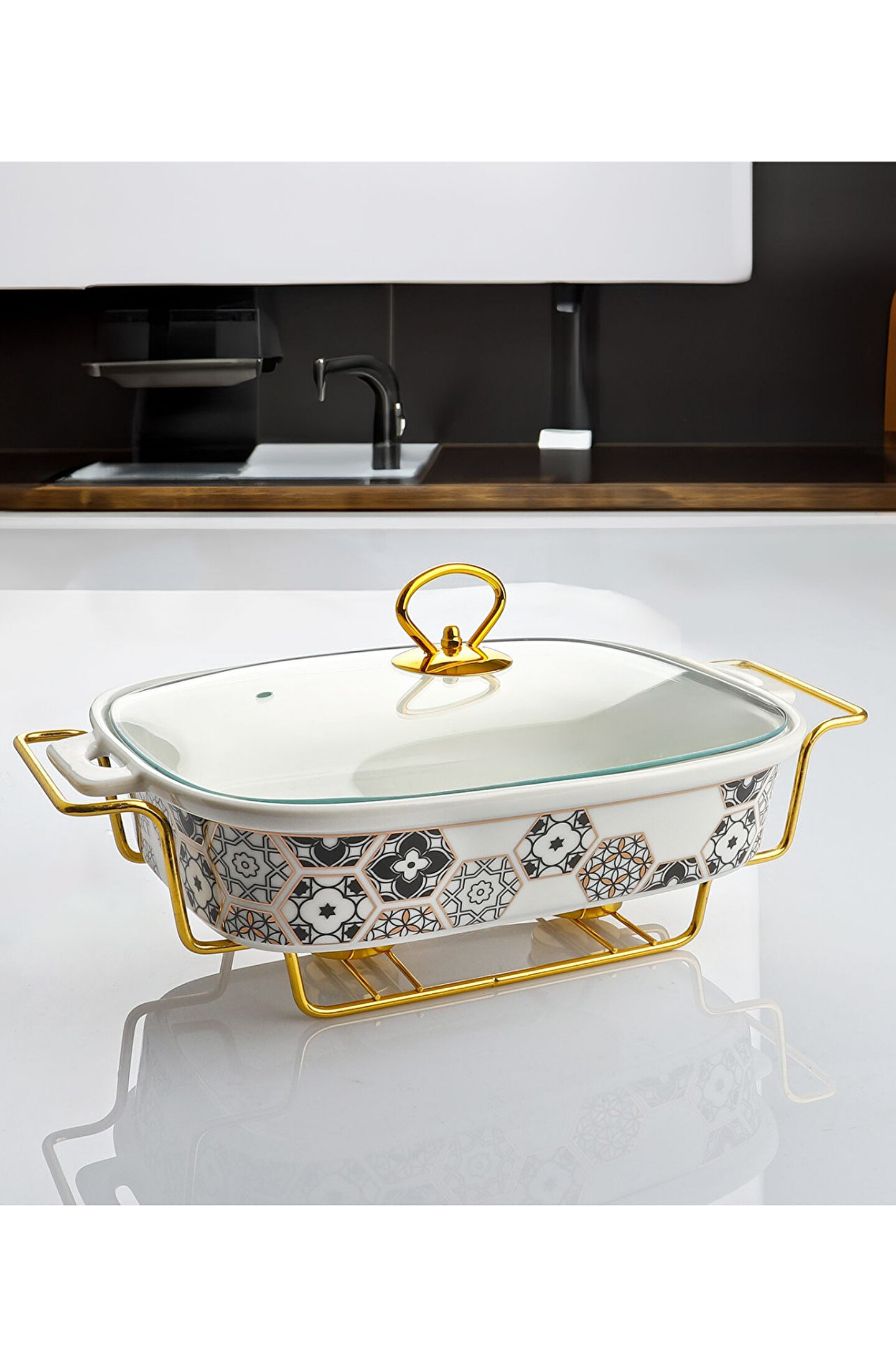 Premium kalitede porselen malzemeden üretilen bu güveç, çizilmelere ve yüksek ısıya karşı dayanıklıdır. Modern desenleri ve gold detaylarıyla sofranıza zarafet katarken, cam kapağı sayesinde yemeklerinizi sıcak ve hijyenik şekilde sunmanızı sağlar.