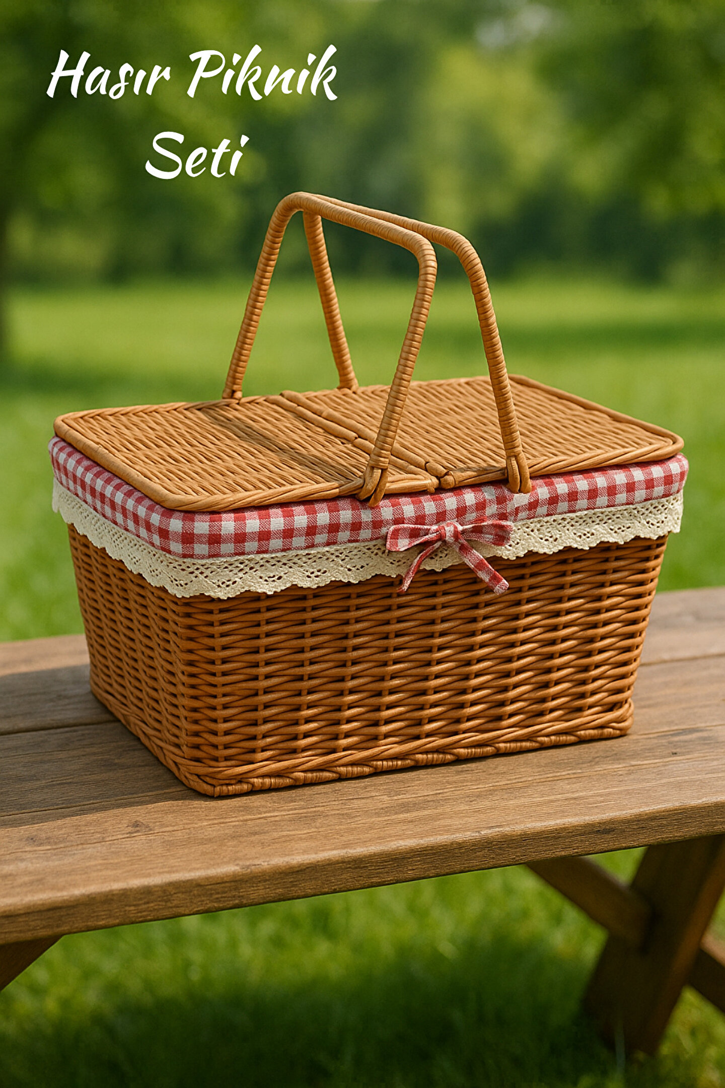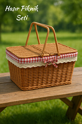 welcomein Kapaklı Hasır Piknik Sepeti – Dantelli, Kırmızı Kareli Kumaşlı, Şık ve Doğal Tasarım 39 cm