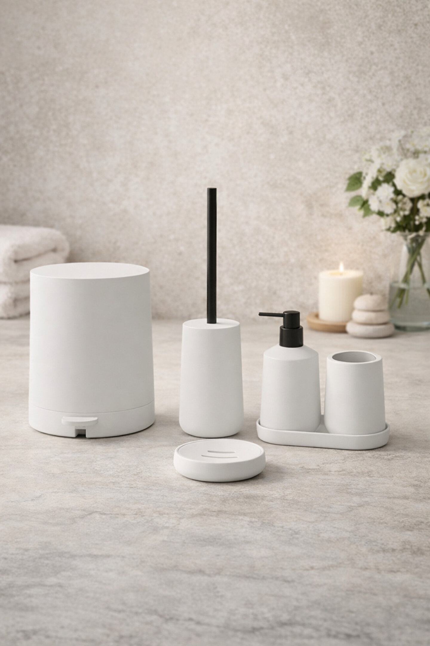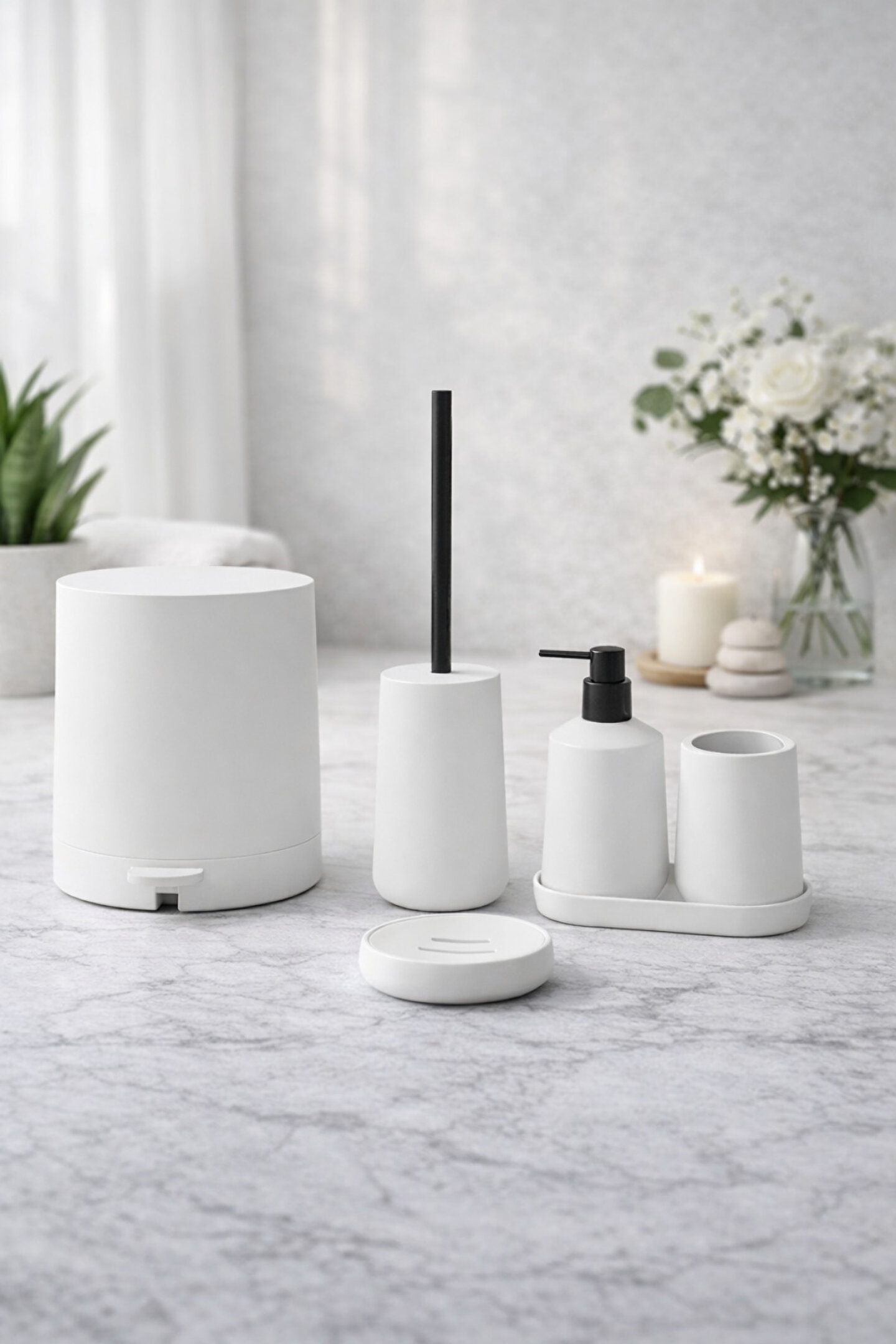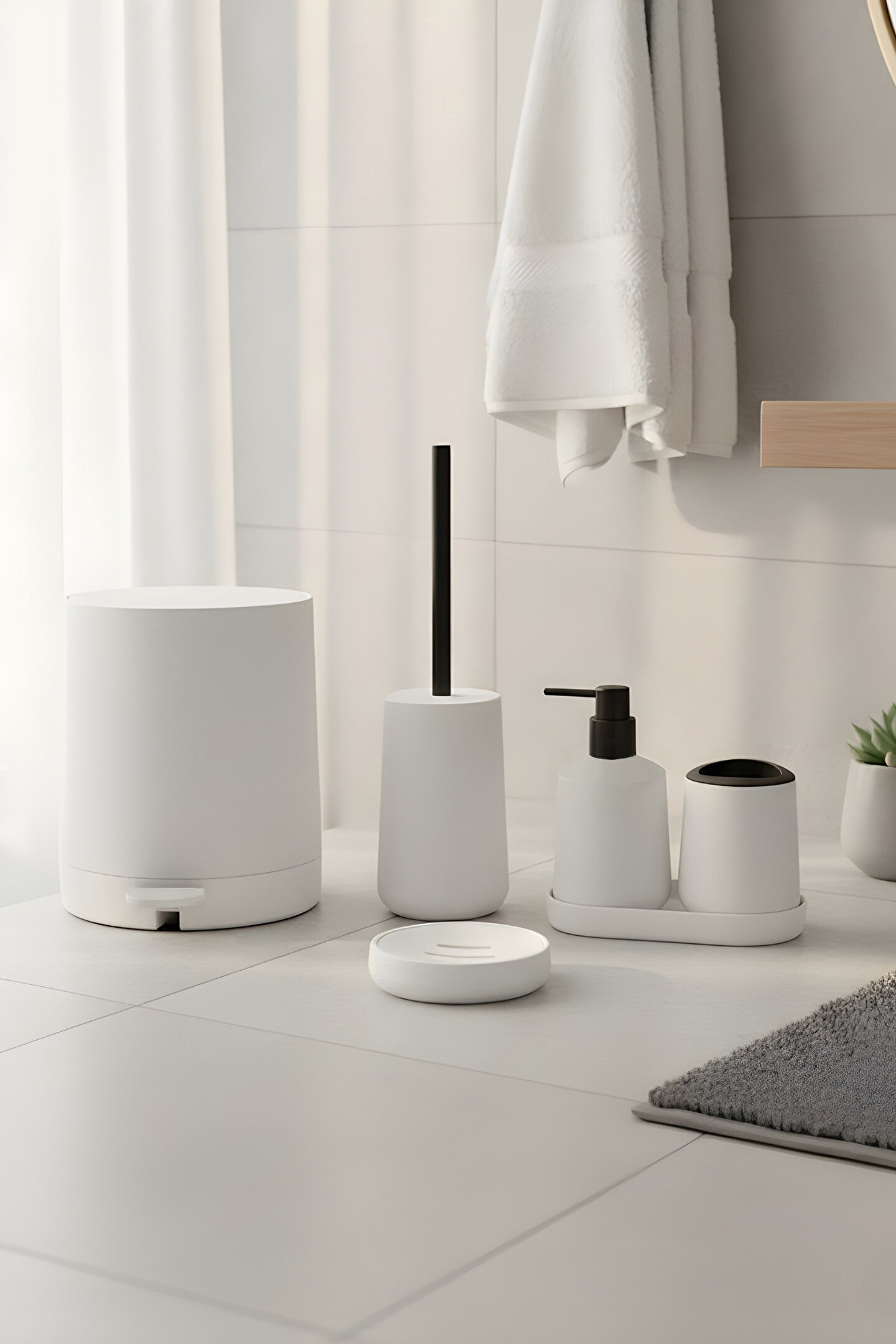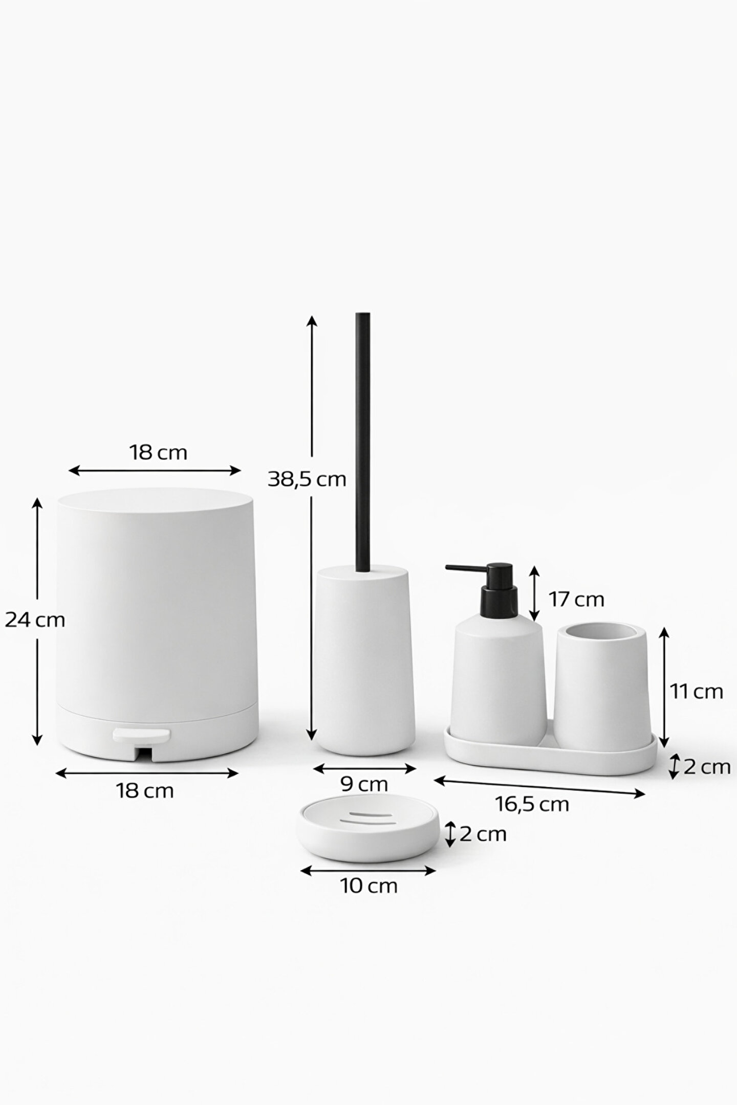 welcomein Mat Beyaz 5 Parça Yuvarlak Banyo Seti – Kovası, Tuvalet Fırçası, Sıvı Sabunluk