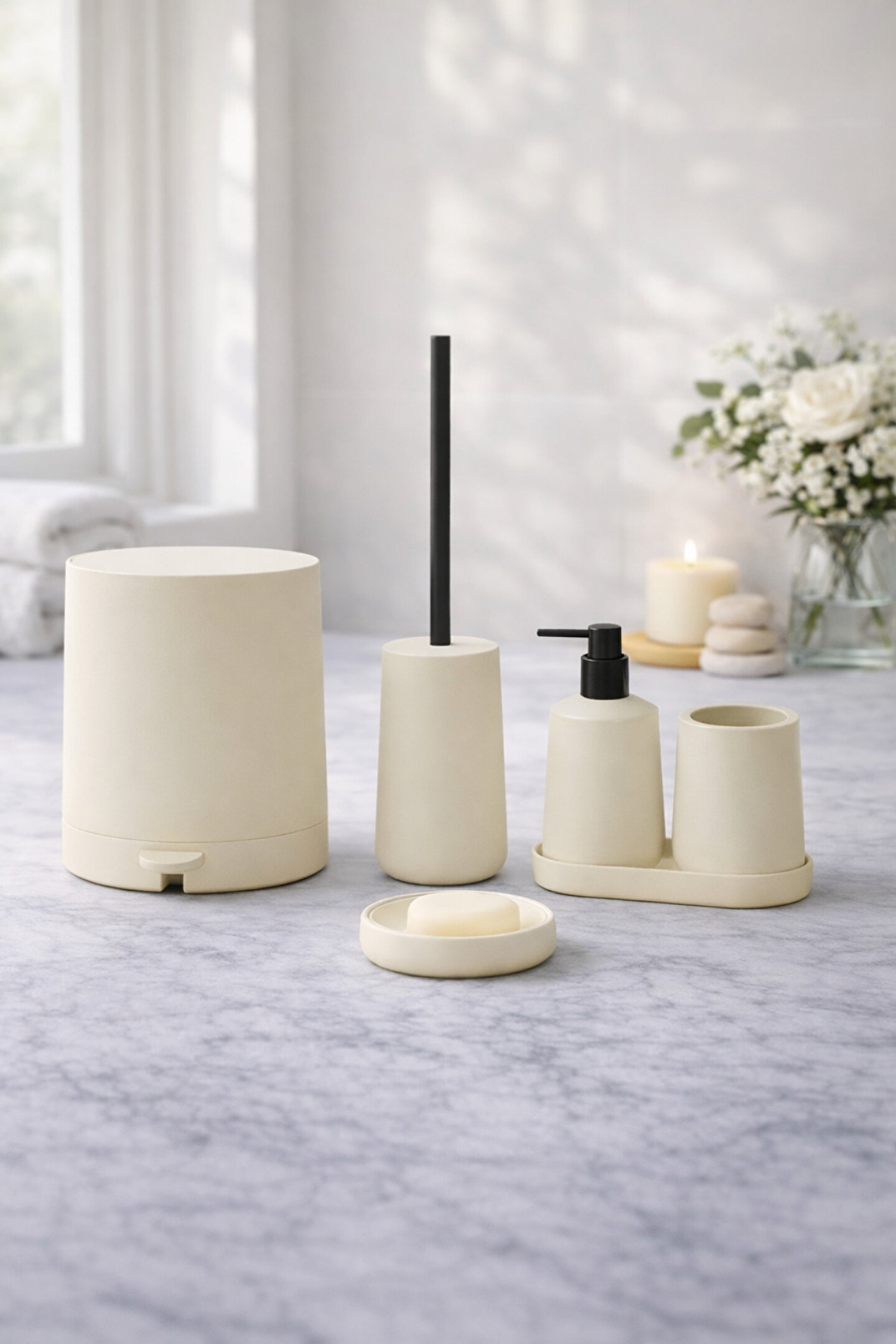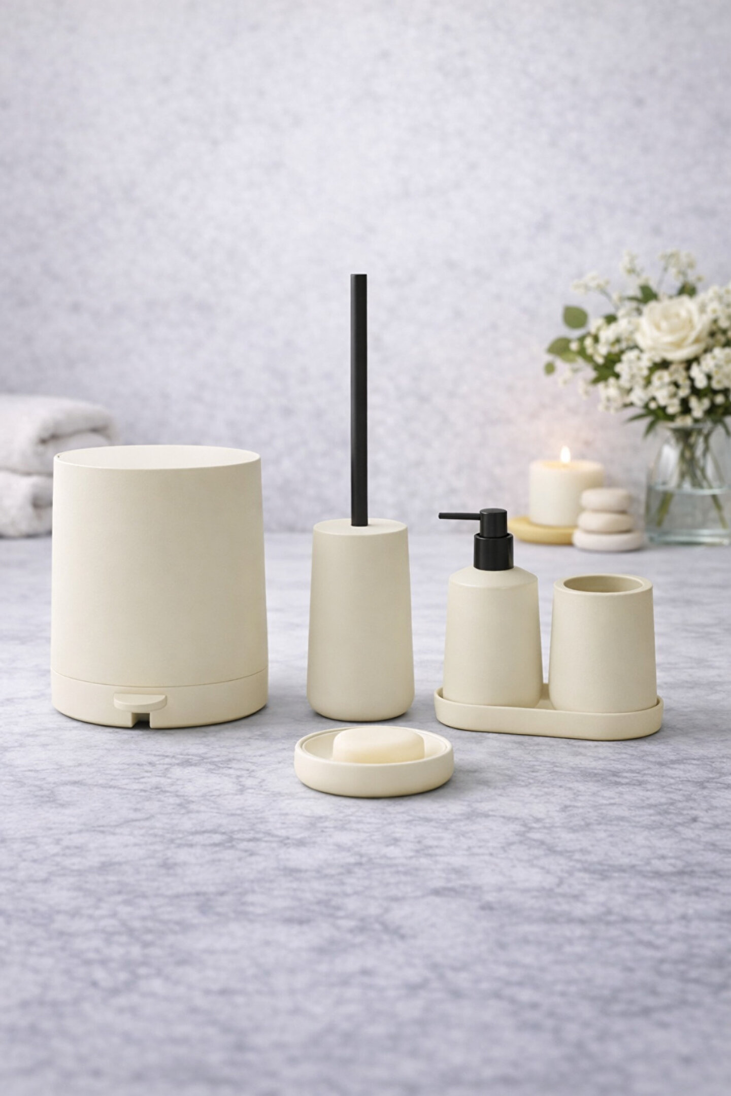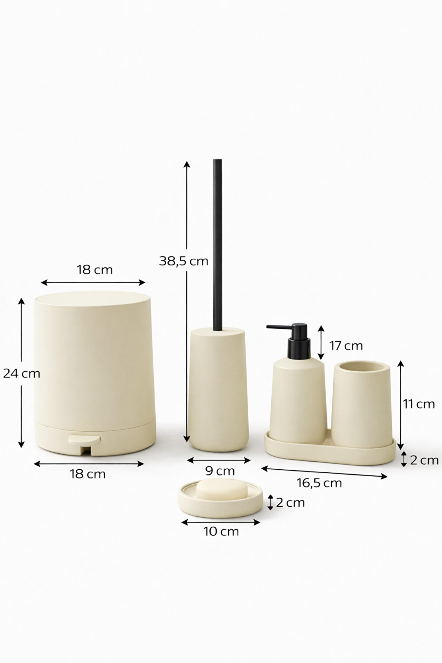 welcomein Mat Krem 5 Parça Yuvarlak Banyo Seti – Kovası, Tuvalet Fırçası, Sıvı Sabunluk