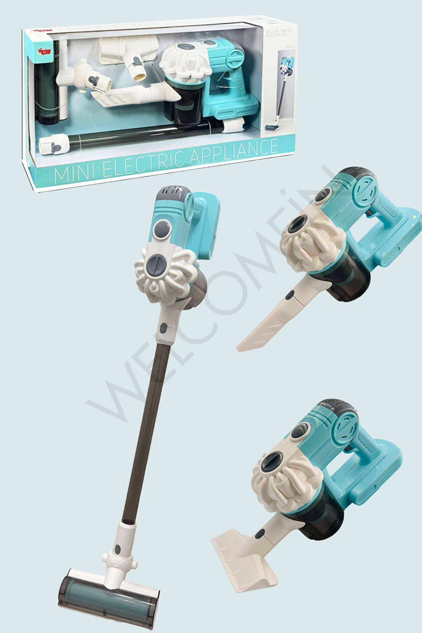 welcomein Mavi Kablosuz Model Oyuncak Süpürge Dikey Süpürge Seti 3 Başlıklı Pilli Temizlik Aktivite