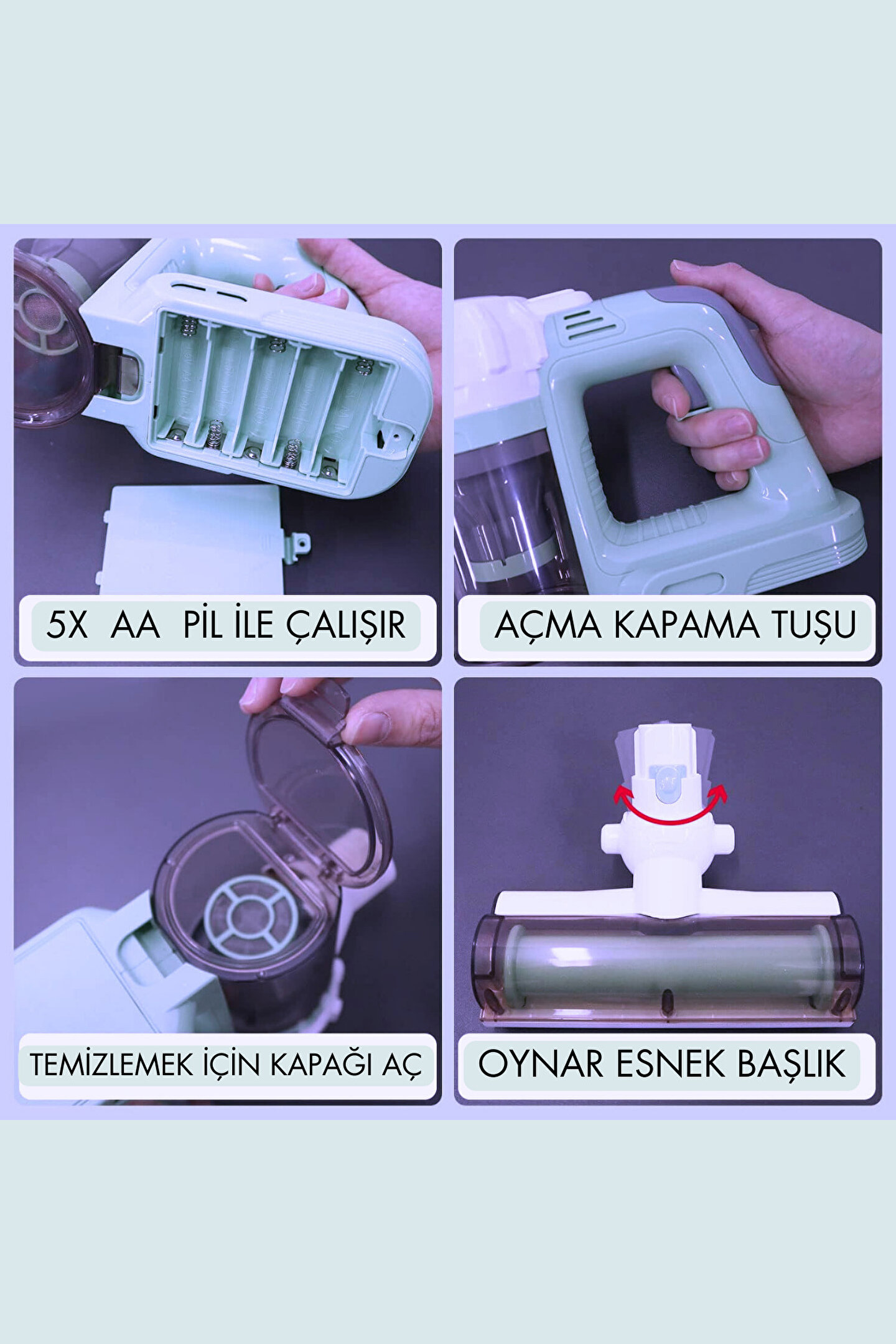- Çocukların eğlenceli vakit geçirmesi için tasarlanmış, 3 yaş ve üzeri çocukların kullanımına uygun bir oyuncak süpürge seti; - Kablosuz yapısı sayesinde kablo karmaşasına son vererek, çocukların özgürce hareket etmesine olanak tanır; - Üç farklı başlık seçeneği ile farklı yüzeylerde etkili temizlik imkanı sunar; zemin, halı ve mobilya temizliği için idealdir; - Pillerle çalışan bu oyuncak süpürge, kolayca değiştirilebilen pillerle sürekli kullanım imkanı sağlar;