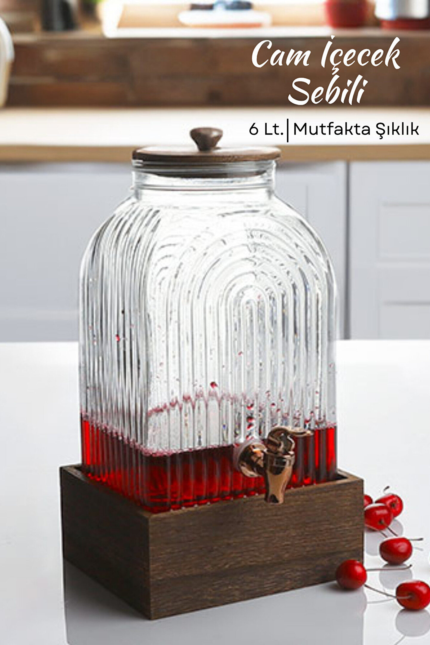 Musluklu Cam İçecek Sebili 6 L Bambu Standlı Çizgili Şerbetlik Halat Kulplu Şık Sunum Su Sebili