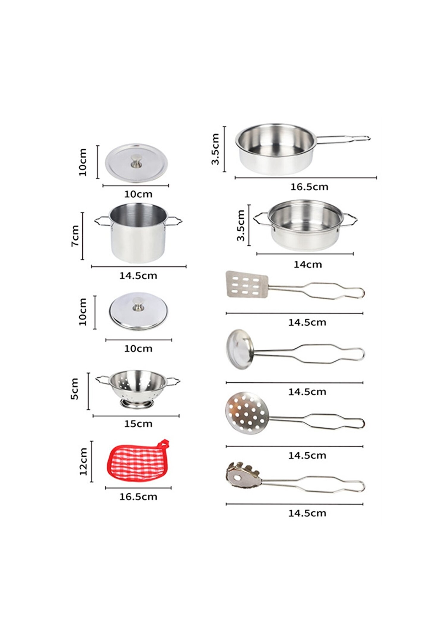 Metal Paslanmaz Çelik Oyuncak Tencere Seti 11 Parça Aksesuarlı - Evcilik Mutfak Oyuncak Tencere Seti, küçük şeflerin mutfağa olan ilgisini desteklemek ve eğlenceli bir oyun deneyimi sunmak amacıyla tasarlanmıştır. İşte bu oyuncak tencere setinin özellikleri madde madde: ; Malzeme:Set, yüksek kaliteli metal paslanmaz çelik malzemeden üretilmiştir. Bu sayede, çocuklar gerçek mutfak ekipmanlarına benzer bir deneyim yaşayabilirler. ; Parça Sayısı:Tencere seti, 11 farklı parçadan oluşmaktadır. Bu parçalar, çocukların hayal güçlerini kullanarak çeşitli yemekleri hazırlamalarına olanak tanır. ; Oyuncak Aksesuarlar:Set, mutfak oyunlarını daha eğlenceli hale getirmek için çeşitli aksesuarlar içerir. Bu aksesuarlar, çocukların yaratıcılıklarını geliştirmelerine yardımcı olabilir. ; Güvenli ve Dayanıklı:Paslanmaz çelik malzeme, setin dayanıklı ve uzun ömürlü olmasını sağlar. Aynı zamanda, oyuncak tencere seti çocuklar için güvenli bir şekilde tasarlanmıştır. ; Eğitici Değer:Bu oyuncak tencere seti, çocuklara temel mutfak becerilerini öğrenme ve sosyal becerilerini geliştirme fırsatı sunar. Ayrıca, takım çalışması ve sorumluluk duygusunu teşvik eder. ; Çeşitli Renkler ve Tasarımlar:Setin renkli ve çeşitli tasarımları, çocukların ilgisini çeker ve oyuncak mutfaklarındaki oyun deneyimini daha eğlenceli kılar. ; Hafif ve Taşınabilir:Set, hafif olması sayesinde çocukların istedikleri her yerde oyunlarını sürdürmelerini sağlar. ; Uygun Yaş Aralığı:Metal Paslanmaz Çelik Oyuncak Tencere Seti, genellikle 3 yaş ve üzeri çocuklar için uygundur. ; Evcilik Oyunları İçin Ideal:Bu set, evcilik oyunları sırasında çocukların hayal güçlerini kullanmalarına yardımcı olan mükemmel bir oyuncak seçeneğidir. ; Eğlenceli ve Öğretici Bir Deneyim:Çocuklar, bu oyuncak tencere setiyle eğlenceli bir şekilde oyun oynarken aynı zamanda temel mutfak becerilerini keşfeder ve öğrenirler. ; Hediye Seçeneği:Metal Paslanmaz Çelik Oyuncak Tencere Seti, küçük şeflere harika bir hediye seçeneği sunar, onların yaratıcılıklarını teşvik eder ve mutfakla olan etkileşimlerini artırır. ;