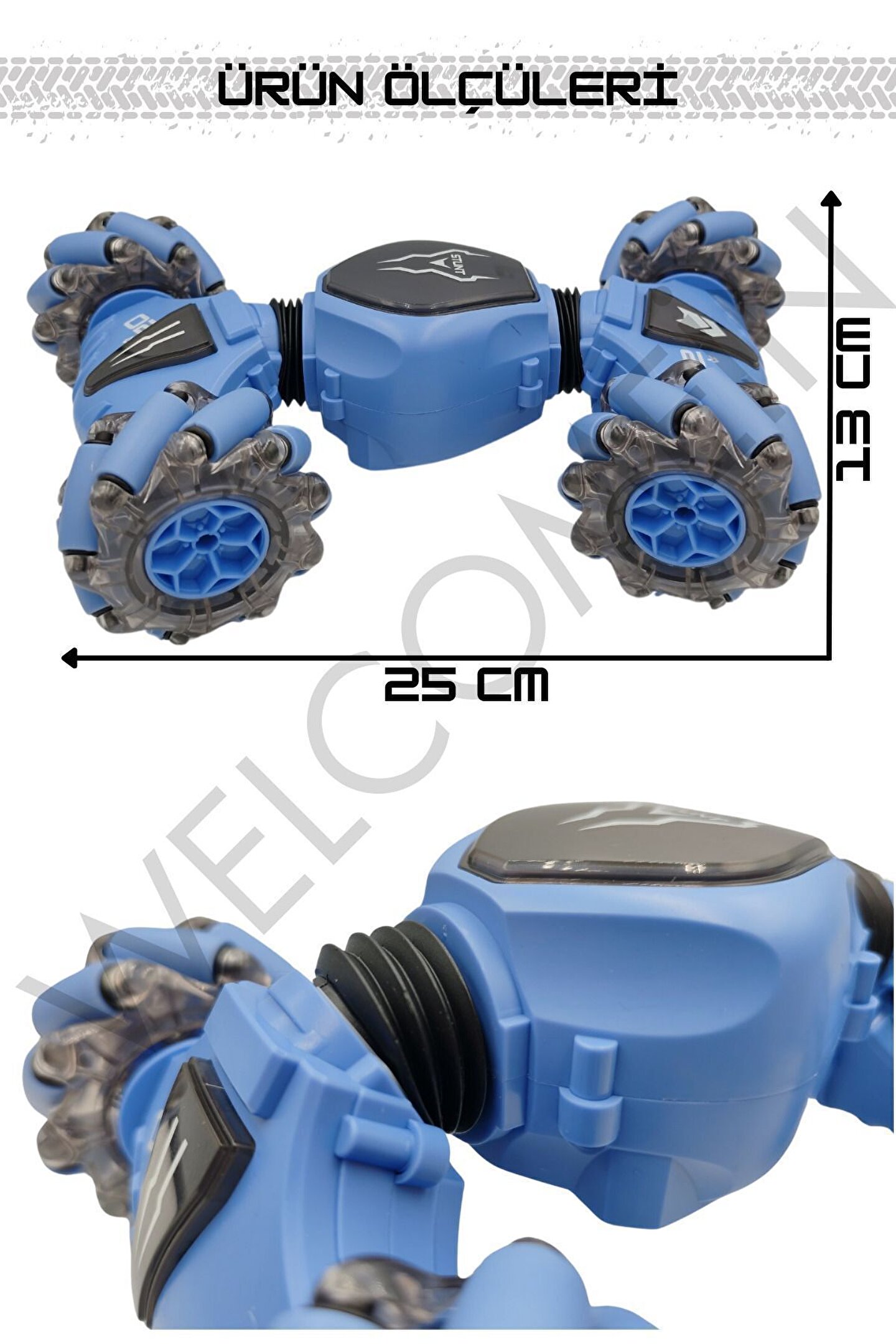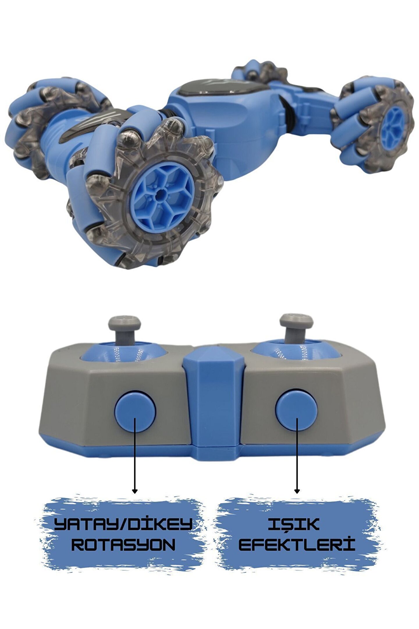- 2.4 GHz frekansında bir bilekten kumandalı ve bir uzaktan kumandalı olmak üzere 2 adet kumandaya sahiptir. ; - Yatay gidebilen lastikleri sayesinde zorlu manevraları kolayca gerçekleştirebilir ve drift atabilir. ; - Dikey hale gelebilen özelliği sayesinde eğlenceli ve heyecan verici sürüş deneyimi sunar. ; - Tırmanma özelliği ile engelleri aşar. ; - Güçlü led ışık efektleriyle donatılmıştır, hem gündüz hem de gece kullanımı için uygundur. ; - Çocukların el-göz koordinasyonunun gelişmesine yardımcı olur. ; - Çocuklar ve yetişkinler için eğlenceli ve dinamik bir sürüş deneyimi sunar. ; - Kumandalar 2 adet ince(kumanda pili)pil ile çalışır. ; (piller dahil değildir);