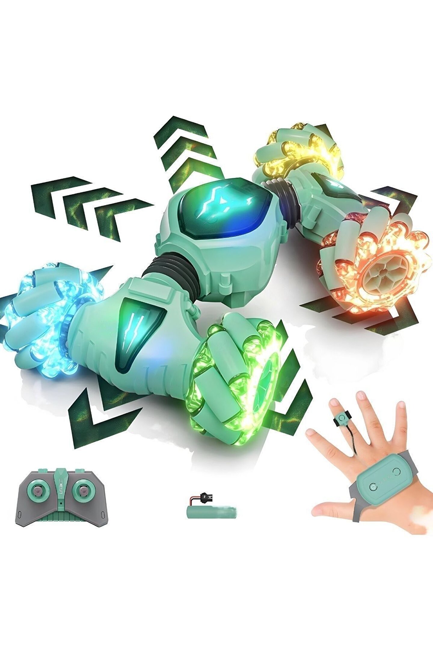 2; 4 GHz frekansında bir bilekten kumandalı ve bir uzaktan kumandalı olmak üzere 2 adet kumandaya sahiptir; Yatay gidebilen lastikleri sayesinde zorlu manevraları kolayca gerçekleştirebilir ve drift atabilir; Dikey hale gelebilen özelliği sayesinde eğlenceli ve heyecan verici sürüş deneyimi sunar; Tırmanma özelliği ile engelleri aşar; Güçlü led ışık efektleriyle donatılmıştır, hem gündüz hem de gece kullanımı için uygundur; Çocukların el; göz koordinasyonunun gelişmesine yardımcı olur; Çocuklar ve yetişkinler için eğlenceli ve dinamik bir sürüş deneyimi sunar; Kumandalar 2 adet ince(kumanda pili)pil ile çalışır; (piller dahil değildir);