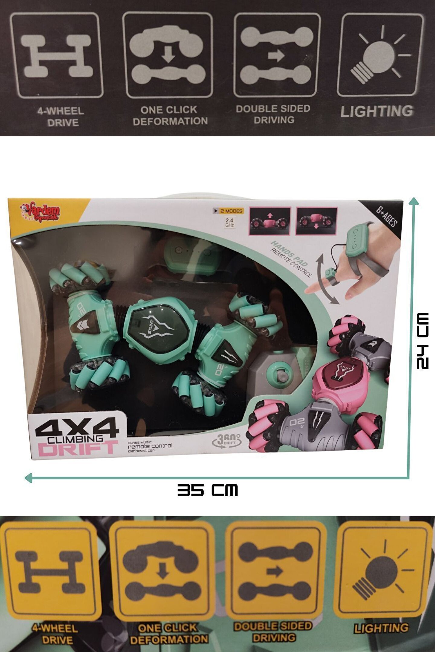 2; 4 GHz frekansında bir bilekten kumandalı ve bir uzaktan kumandalı olmak üzere 2 adet kumandaya sahiptir; Yatay gidebilen lastikleri sayesinde zorlu manevraları kolayca gerçekleştirebilir ve drift atabilir; Dikey hale gelebilen özelliği sayesinde eğlenceli ve heyecan verici sürüş deneyimi sunar; Tırmanma özelliği ile engelleri aşar; Güçlü led ışık efektleriyle donatılmıştır, hem gündüz hem de gece kullanımı için uygundur; Çocukların el; göz koordinasyonunun gelişmesine yardımcı olur; Çocuklar ve yetişkinler için eğlenceli ve dinamik bir sürüş deneyimi sunar; Kumandalar 2 adet ince(kumanda pili)pil ile çalışır; (piller dahil değildir);