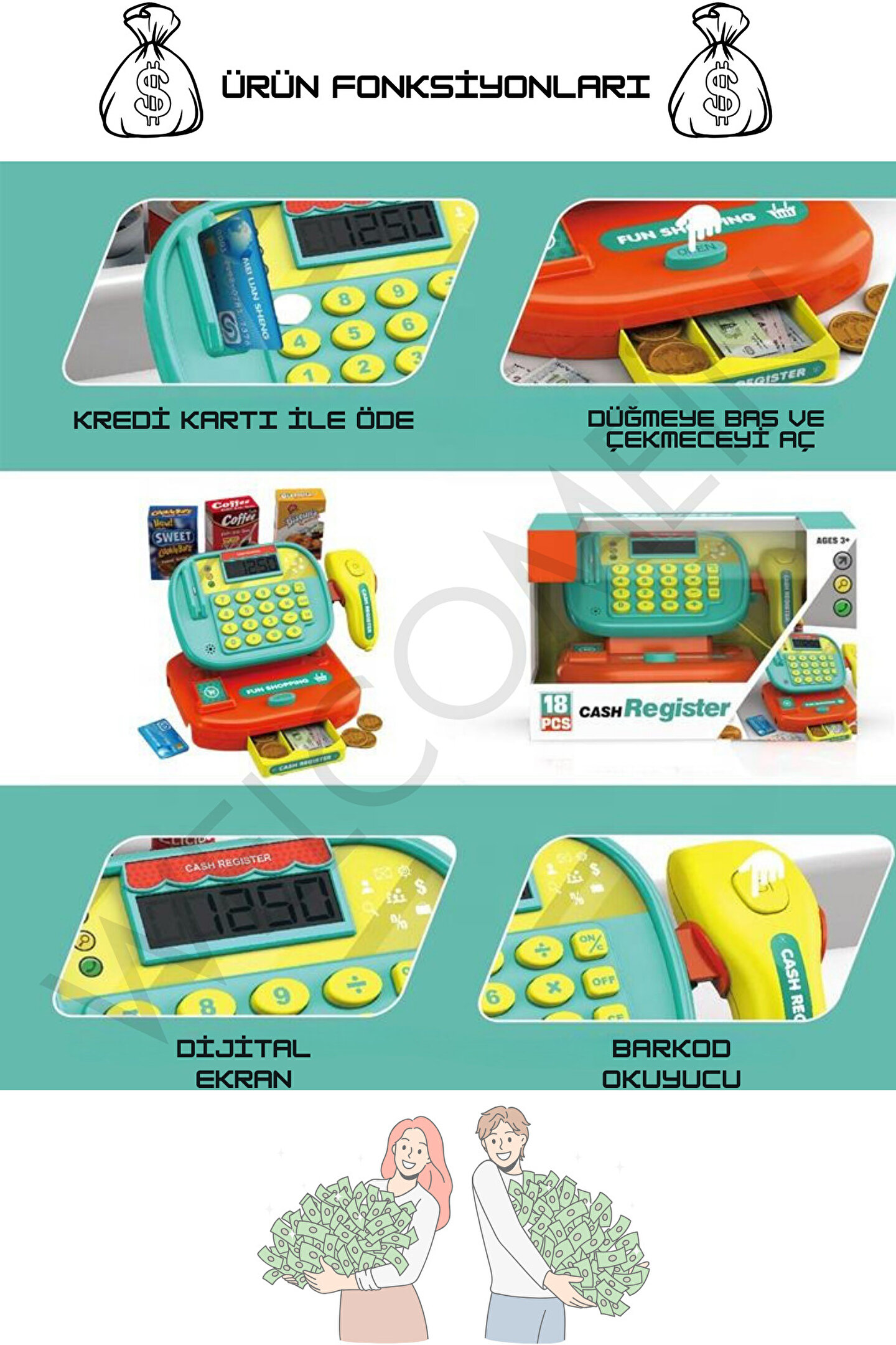 - Hesap makinesi özelliği ile çocuklar temel matematik becerilerini pratik edebilir ve para sayma yeteneklerini geliştirebilirler. ; - Barkod okuyucu sayesinde farklı ürünleri tanıyabilir, alışveriş deneyimini daha gerçekçi hale getirebilirler. ; - Dijital ekran, alışveriş işlemlerini takip etmelerini kolaylaştırır ve gerçekçi bir alışveriş ortamı sunar. ; - Tartı özelliği ile çocuklar farklı ürünlerin ağırlıklarını simüle edebilir. ; - Finansal okur-yazarlıklarını geliştirmelerine yardımcı olurken aynı zamanda mantık ve problem çözme becerilerini destekler. ; - Alışveriş dünyasını keşfederken matematik becerilerini geliştirmelerine ve hayal güçlerini kullanarak yaratıcı oyunlar oynamalarına olanak sağlar. ; - Eğitici ve eğlenceli bir deneyim sunar, çocukların öğrenme sürecini desteklerken keyifli vakit geçirmelerini sağlar.;