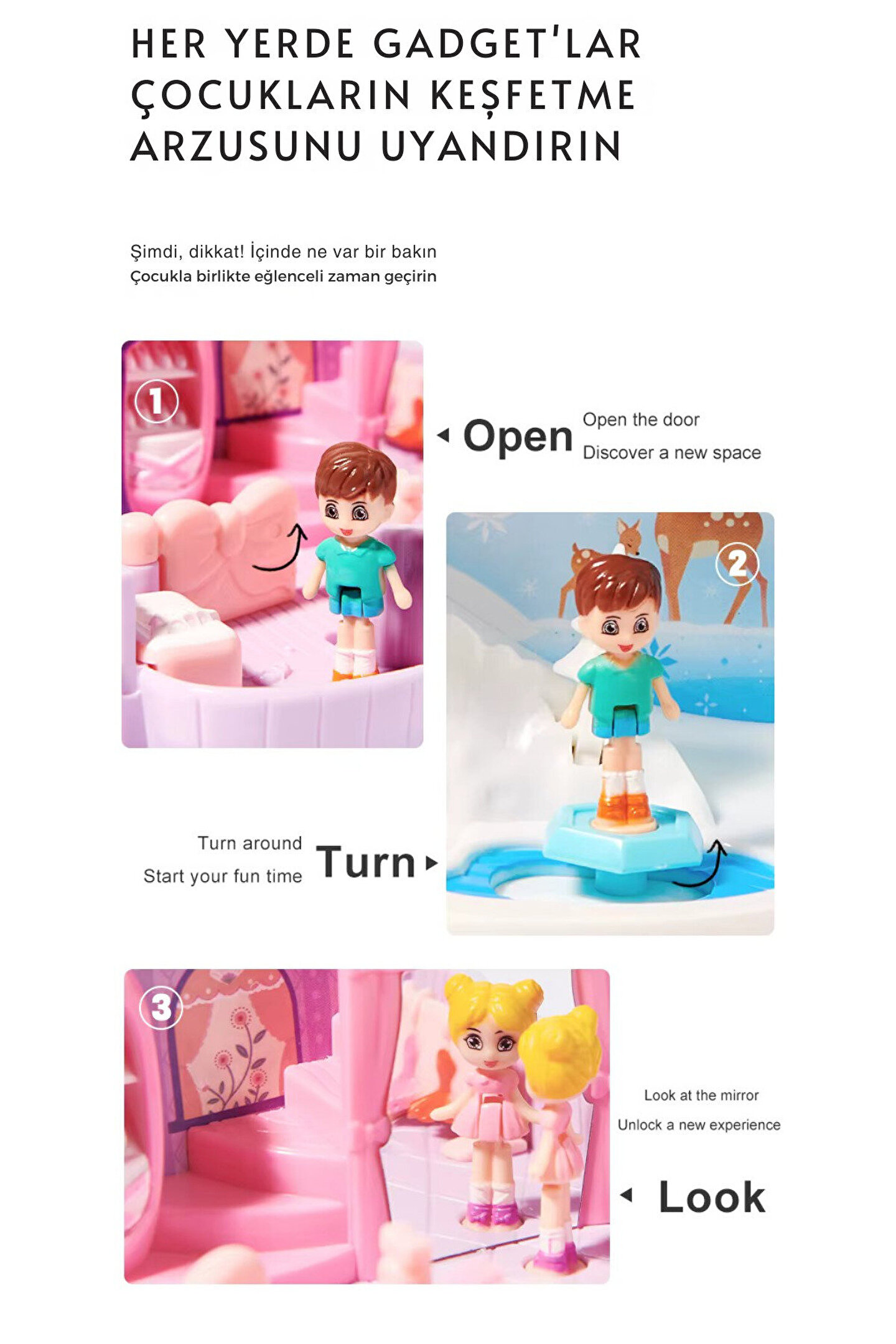 - 3 yaş ve üzeri çocuklar için ideal, eğlenceli ve öğretici bir oyuncak.; - Açılıp katlanabilen yapısı sayesinde kolayca taşınabilir ve saklanabilir.; - Işıklı ve müzikli aksesuarlarıyla çocukların ilgisini çeker ve oyun saatlerini daha keyifli hale getirir.; - Evcilik setleri, çocukların sosyal becerilerini ve hayal güçlerini geliştirmelerine yardımcı olur.; - Çin menşeli olup, kalite standartlarına uygun olarak üretilmiştir.;