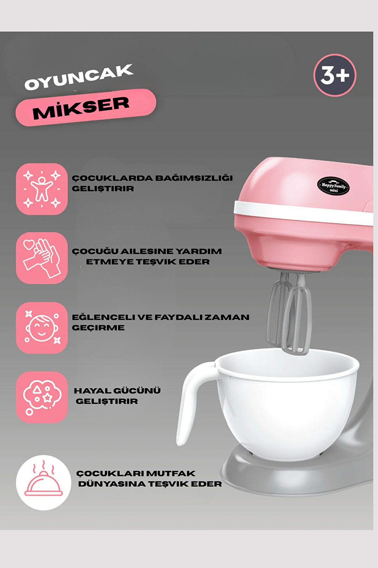 3 yaş ve üzeri çocuklar için ideal bir hediye seçeneği olarak öne çıkan bu oyuncak, onların hayal gücünü ve yaratıcılığını geliştirir.; - Diğer özellikler: Bu oyuncak, çocukların oyun saatlerini daha da eğlenceli hale getiren ekstra özellikler barındırır.; - Normal özellik: Standart işlevselliği sayesinde, çocukların mutfak oyunlarını gerçekçi bir şekilde deneyimlemelerini sağlar.; - Paket içeriği: 1'li paket halinde sunulan bu ürün, çocukların hemen oyunlarına başlayabilmeleri için gerekli tüm parçaları içerir.; - Ürün uyarıları: Çocukların güvenliği için gerekli tüm uyarılar bu üründe belirtilmiştir.; - Menşei: Çin ana karasında üretilen bu oyuncak, kalite standartlarına uygun olarak tasarlanmıştır.;