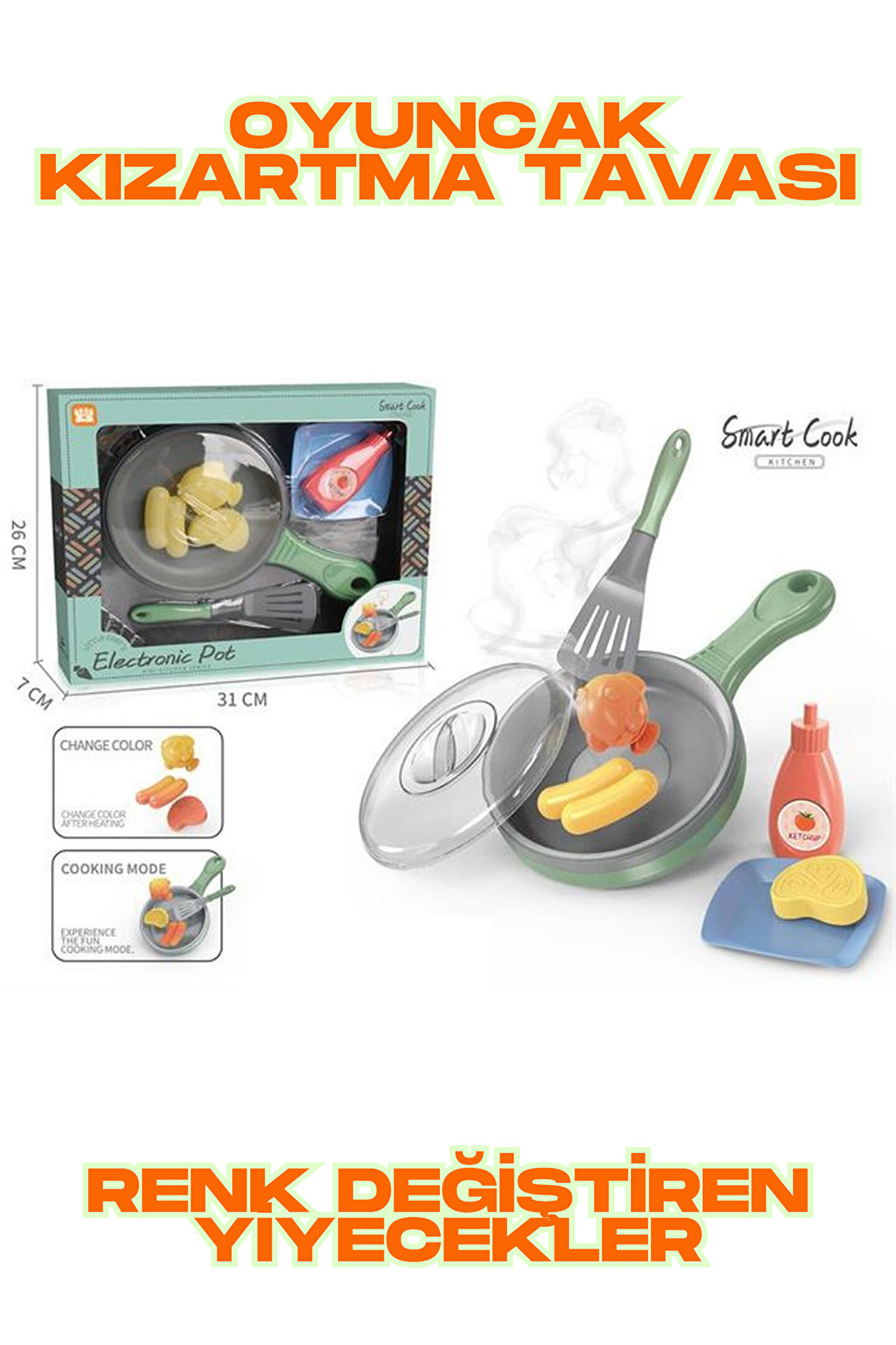 - 3 yaş ve üzeri çocuklar için ideal, eğlenceli ve eğitici bir oyuncak seti.; - Renk değiştirme özelliği sayesinde çocukların dikkatini çeker ve onlara görsel bir deneyim sunar.; - 8 parçadan oluşan set, çocukların hayal gücünü geliştirmeye yardımcı olurken, yemek yapmayı öğrenmelerine de katkıda bulunur.; - CN menşei (Çin ana karası) ile üretilen bu oyuncak, güvenle çocuklarınızın elinde olabilir.;