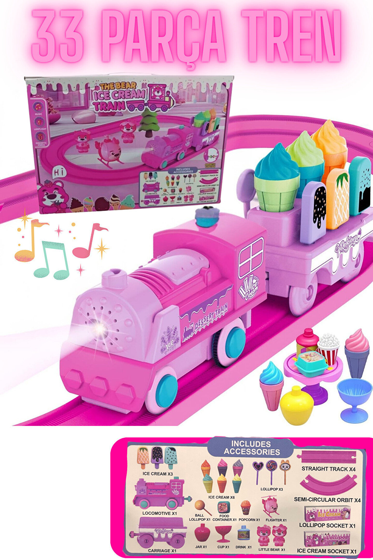 Oyuncak Sesli ve Işıklı Pembe Dondurma Treni Train Mıknatıslı Vagon Bağlantısı