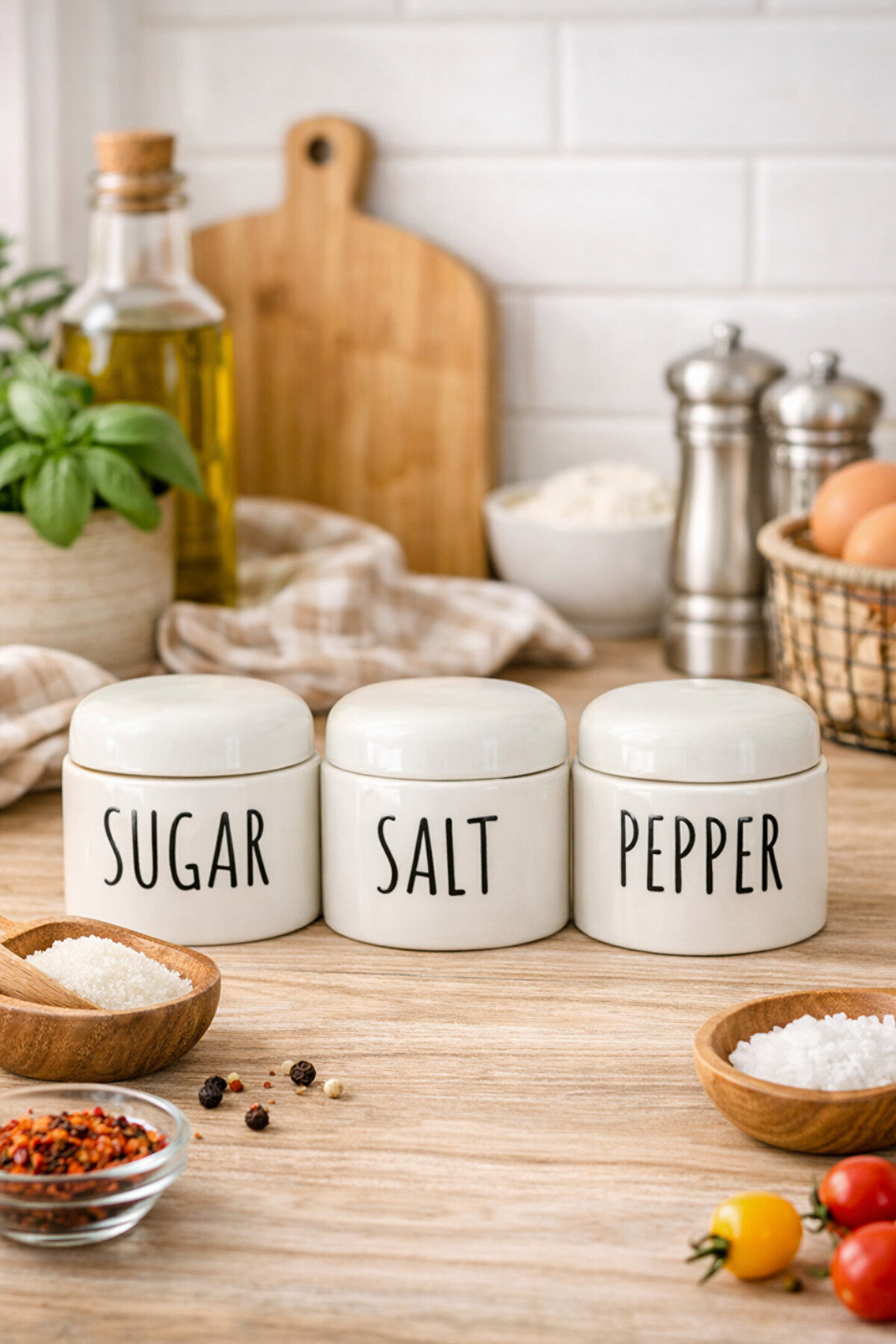 Porselen Küçük Baharatlık Takımı 3’lü – Kapaklı, Minimal Tasarım, Tezgah Üstü
