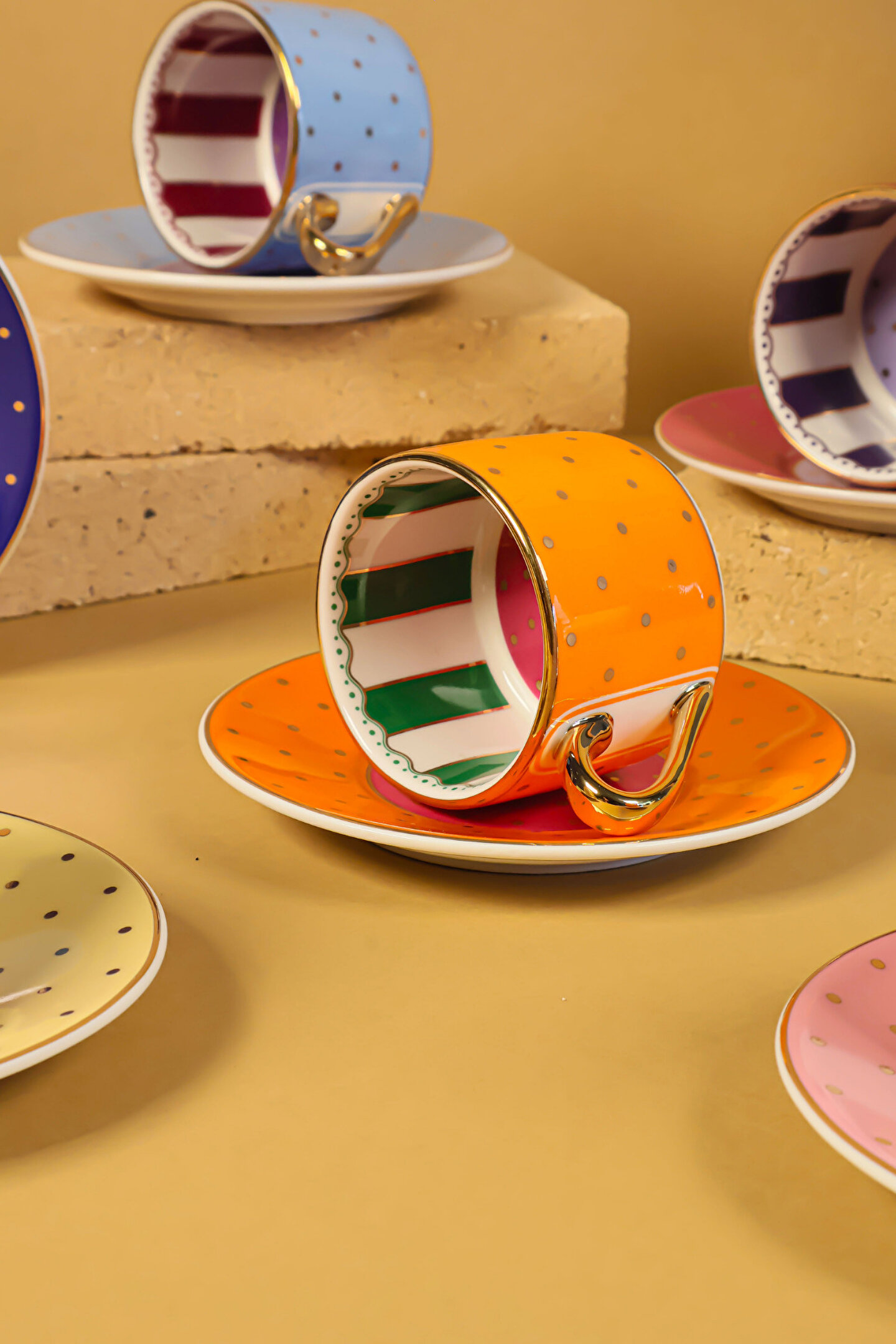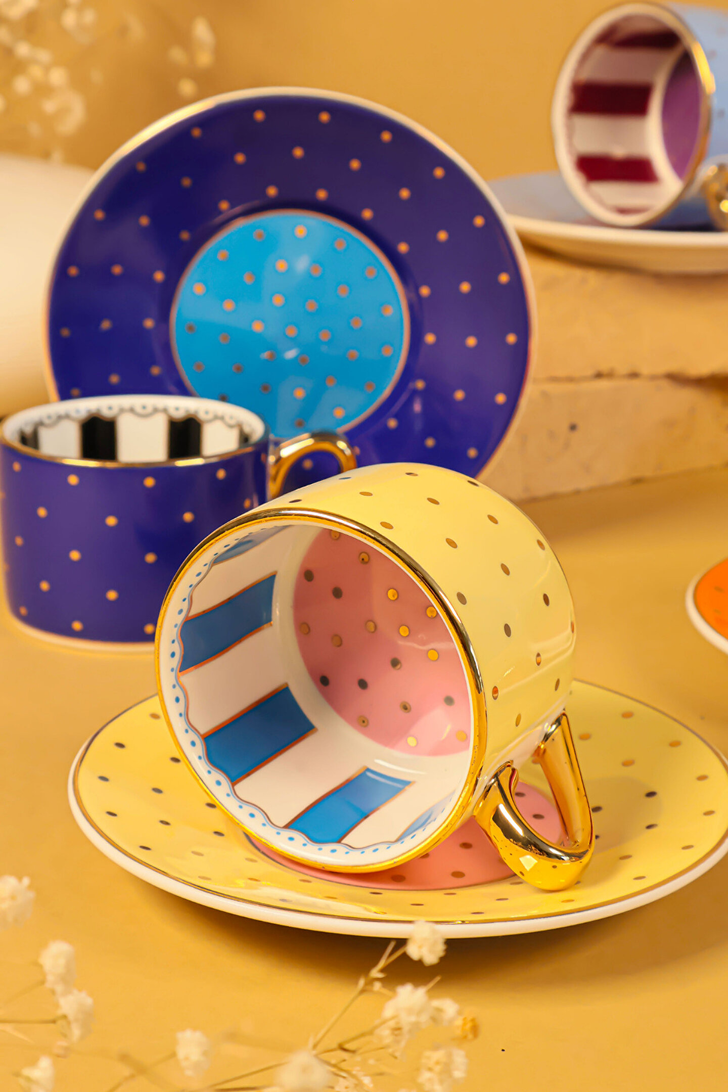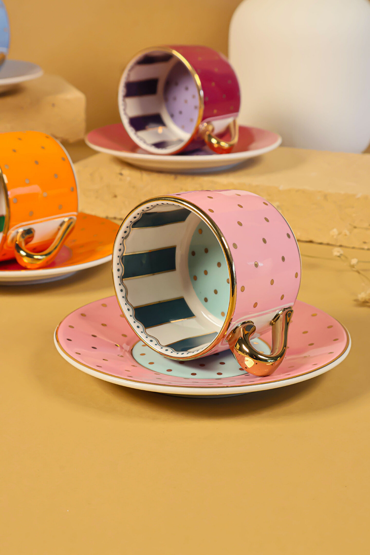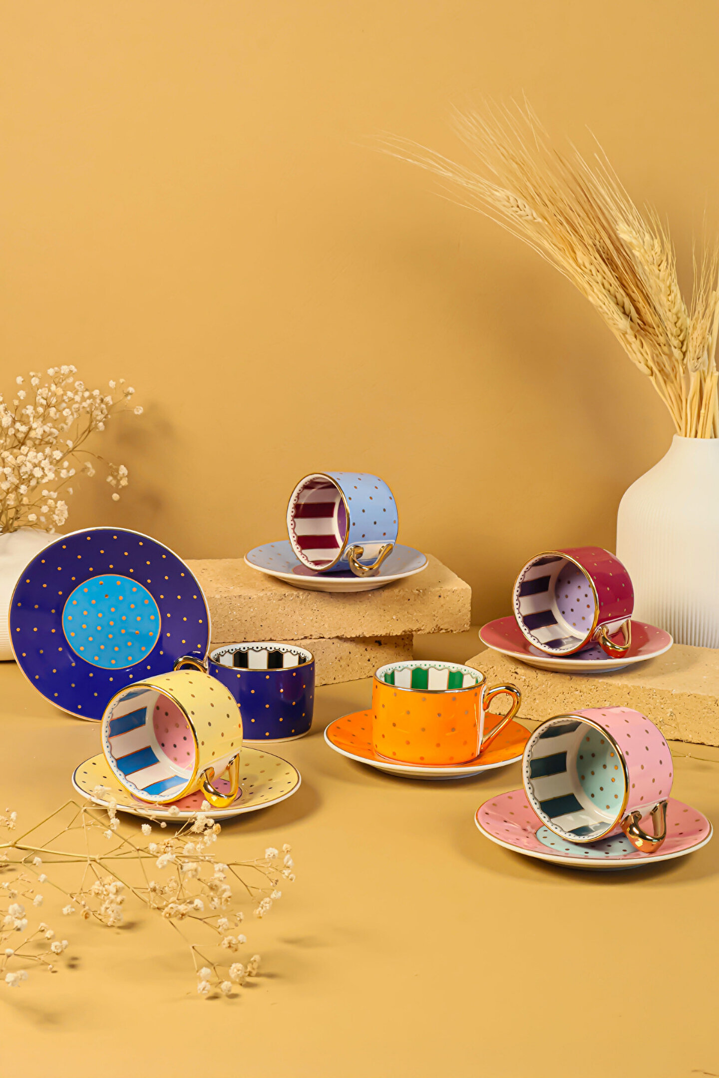 Enerjik renkler, altın ışıltısı ve modern çizgiler bir arada! Yeni koleksiyona ait bu porselen kahve fincan takımı, canlı renk paleti ve gold detaylı zarif tasarımıyla dikkat çekiyor.