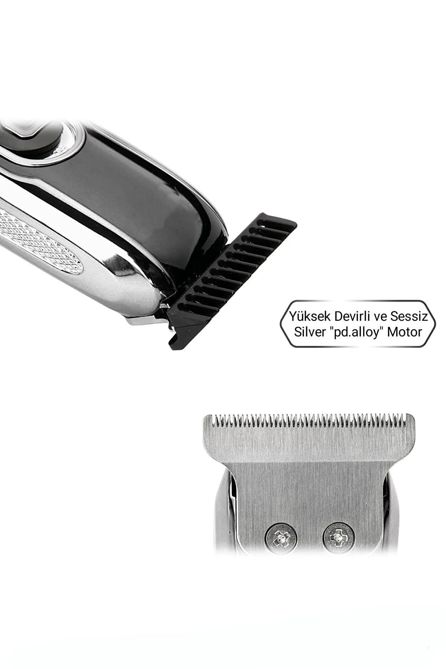 Rd-XP Silver Profesyonel Şarjlı Saç Sakal Ense Tıraş Makinesi Rd-XP Silver Profesyonel Şarjlı Saç Sakal Ense Tıraş Makinesi gümüş "pd.Alloy" motor sayesinde en sık ve sert saç & sakallarda bile Çekme yolma ve yığılma yapmaz -keskin çelik bıçakları dayanıklı ve uzun ömürlüdür -yüksek devir gücü ile sorunsuz tıraş -sessiz ve titreşimi optimize edilmiştir -taraksız kullanımda sıfıra yakın (0,1mm) kesim sağlar -ergonomik yapısı sayesinde kolay kavranır Kutu içeriği: 1 adet şarjlı tıraş makinesi Taraklar 1 adet 1mm 1 adet 2mm 1 adet 3mm 1 adet şarj adaptörü 1 adet temizlik fırçası 1 adet bakım yağı Temizlik ve bakım Makinenin uzun ömürlü olması için bıçaklarını kullanım yoğunluğuna göre düzenli bir şekilde yağlayınız. ; Öncelikle her kullanımdan sonra kutu içerisinde bulunan temizlik fırçası ile makinenizin bıçaklarında ki saç-Sakal artıklarını temizleyiniz. ; Uzun süreli kullanımdan (1-2 ay) sonra detaylı temizlik için çelik bıçağın arkasındaki 2 adet vidayı sökünüz ve fırça ile temizliği tamamladıktan sonra uygun kısımları yağlayarak tekrar takınız. ; Makinenizi suya yada yağa yatırmayınız ve yıkamayınız. ; Kozmetik temizliği için nemli bez kullanınız. ; Temizlik aşamasında çözücü ve ovucu maddeleri kullanmayınız.;