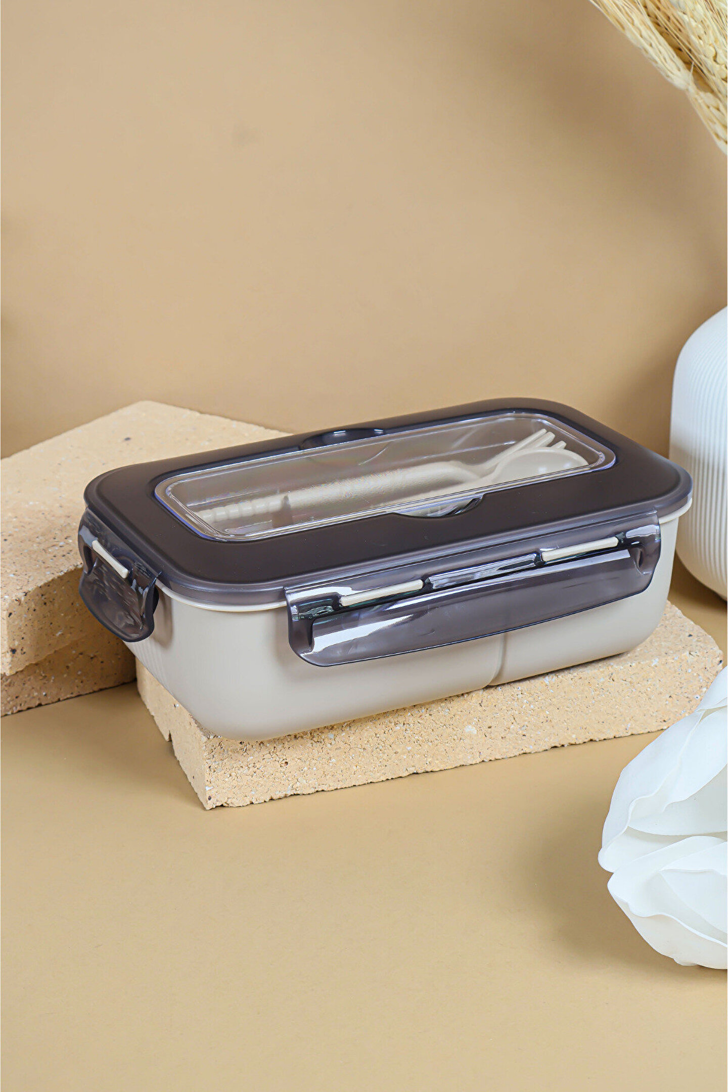 Sızdırmaz Kapaklı Kaşıklı Dikdörtgen Beslenme Kabı - Mikrodalgaya Uygun Öğle Yemeği Kabı