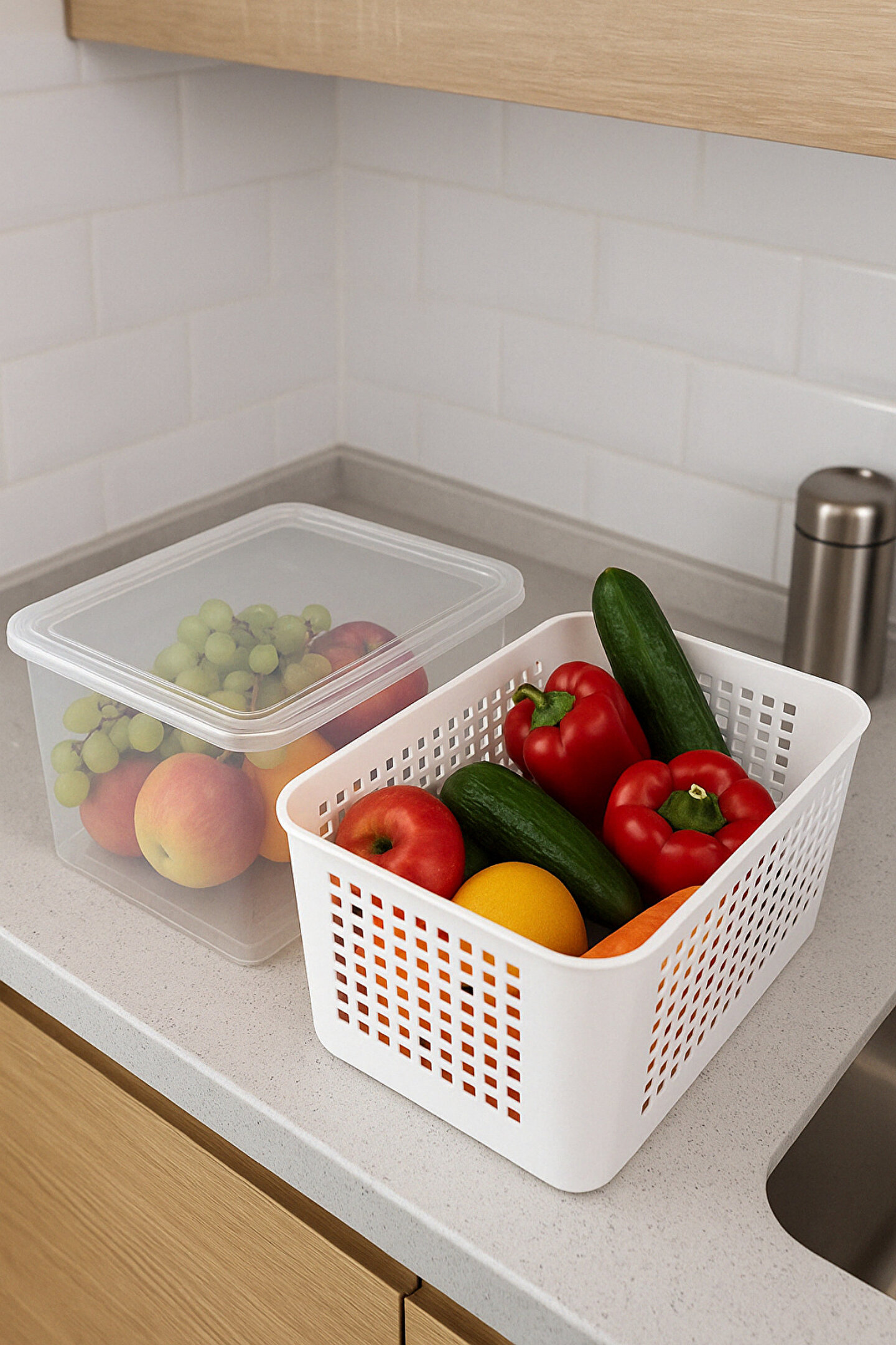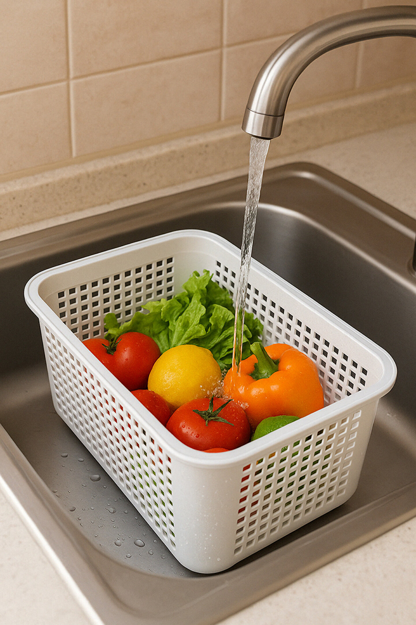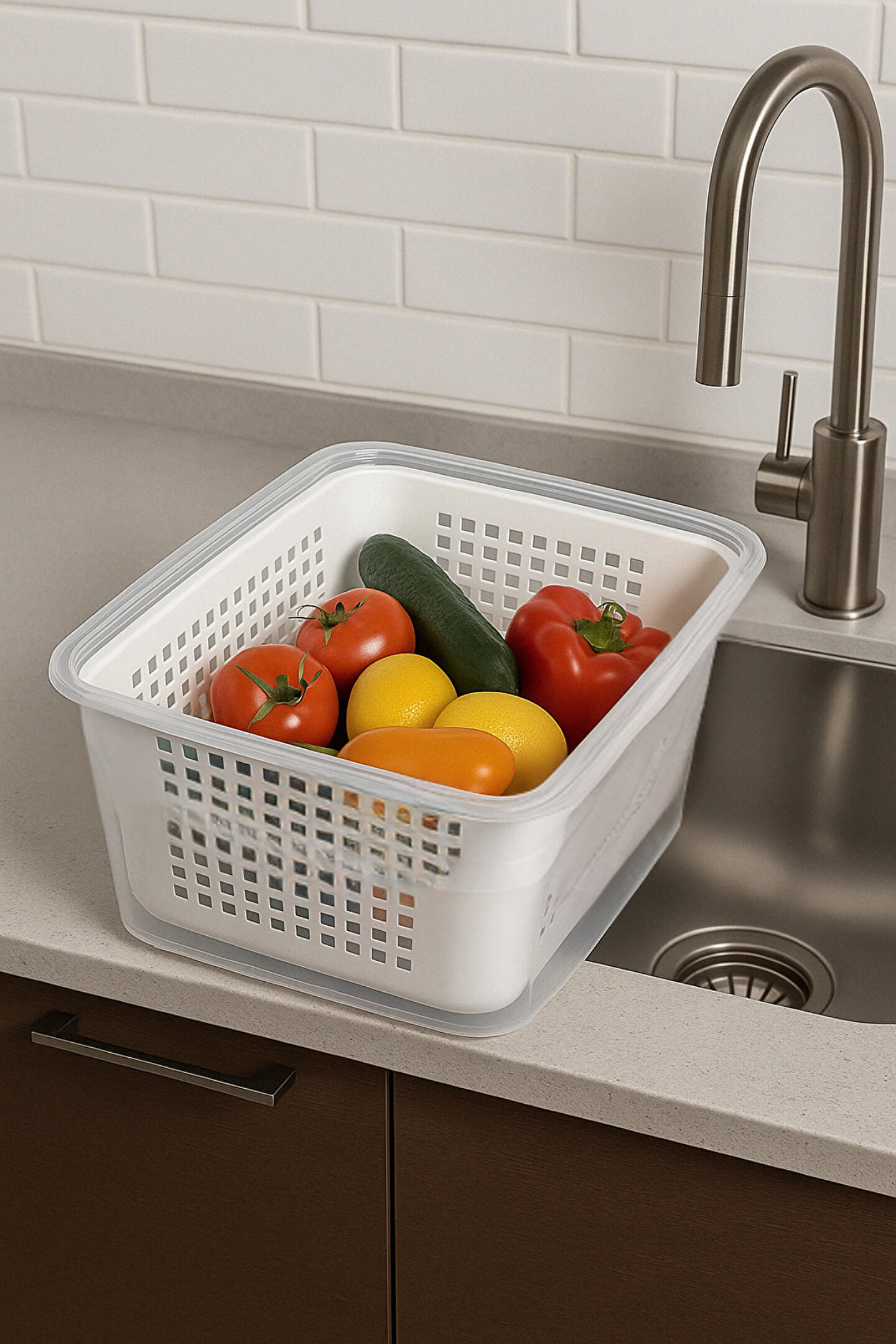 Mutfakta düzeni ve hijyeni bir arada sunan bu Süzgeçli plastik organizer, sebze ve meyvelerinizi hem yıkayıp hem de saklamanızı kolaylaştırır.