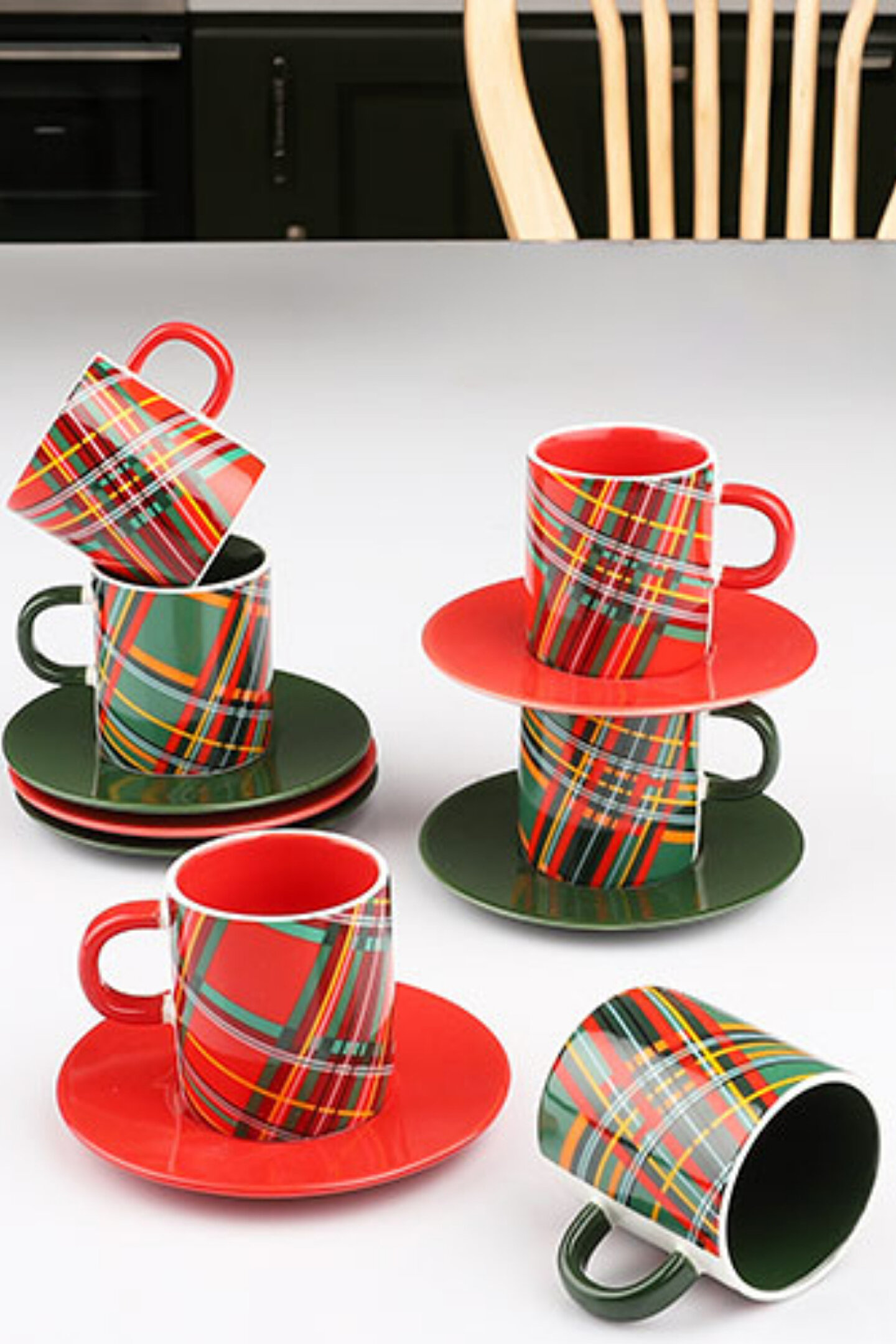 welcomein Yılbaşı Konseptli 6’lı Kahve Fincan Takımı – Kırmızı Yeşil Ekose Desenli, Porselen, Hediye Seti