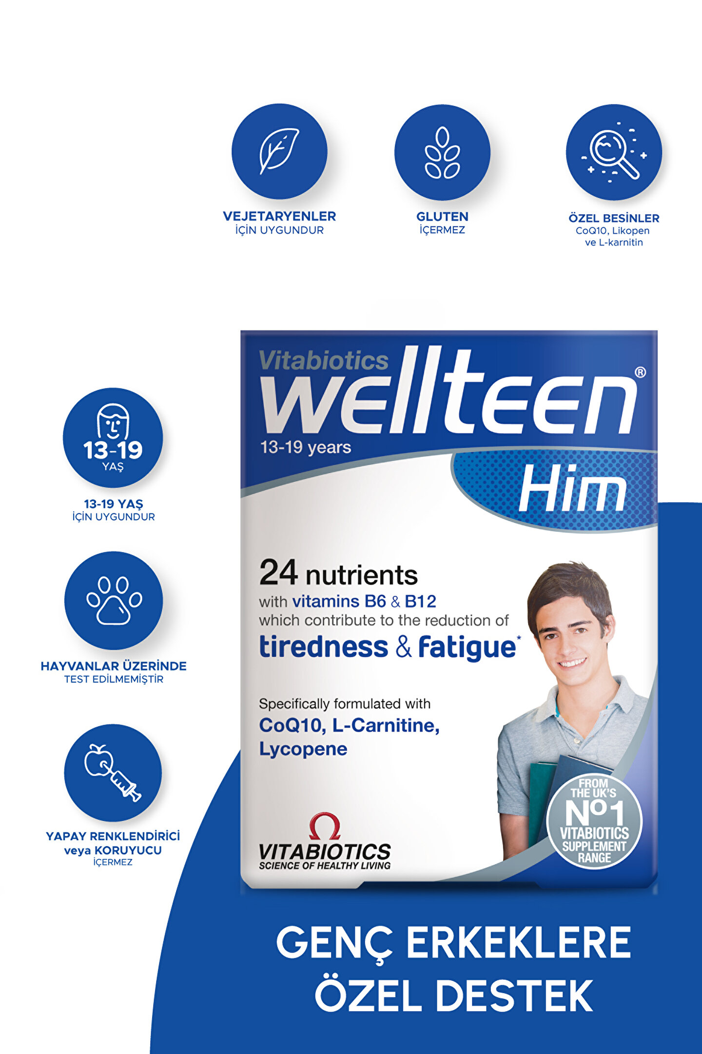 Vitamin D, Çinko ve Folik Asit bağışıklık sisteminin normal fonksiyonuna katkıda bulunur.; Vitamin B6,B12, C ve Pantotenik Asit yorgunluk ve bitkinliğin azalmasına katkıda bulunur.; Vitamin B6 ve C normal enerji oluşum mekanizmasına katkıda bulunur Önerilen Kullanım; 13-19 yaş arası genç erkeklerin günde 1 tablet alması tavsiye edilir.; Vejetaryenler için uygundur Gluten içermez Koruyucu içermez Tuz veya maya içermez Wellteen® Him hayvanlarda test edilmemiştir.; Ürün Markası: Vitabiotics Ürün Boyutu: 30 Tablets Özet Bilgi: Multivitamin ve mineraller içeren takviye edici gıda