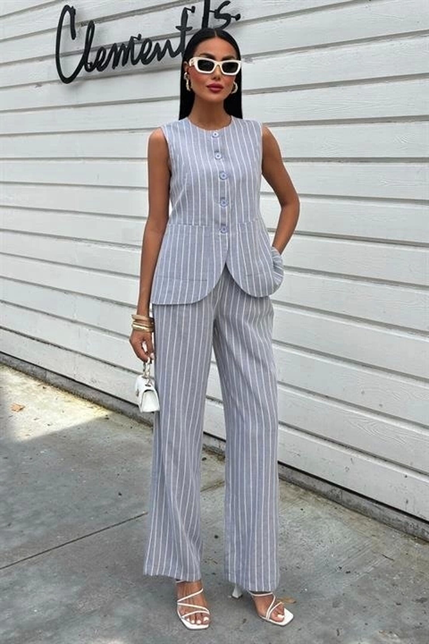 Çizgili Viscon Keten Yelekli Rahat Takım 10121