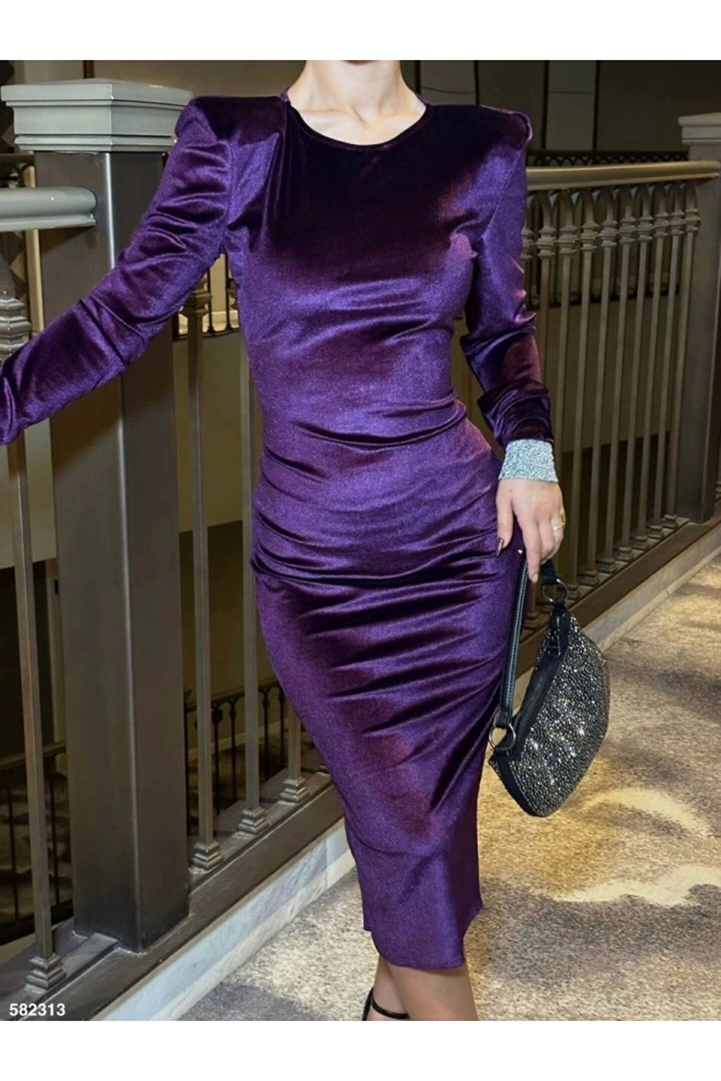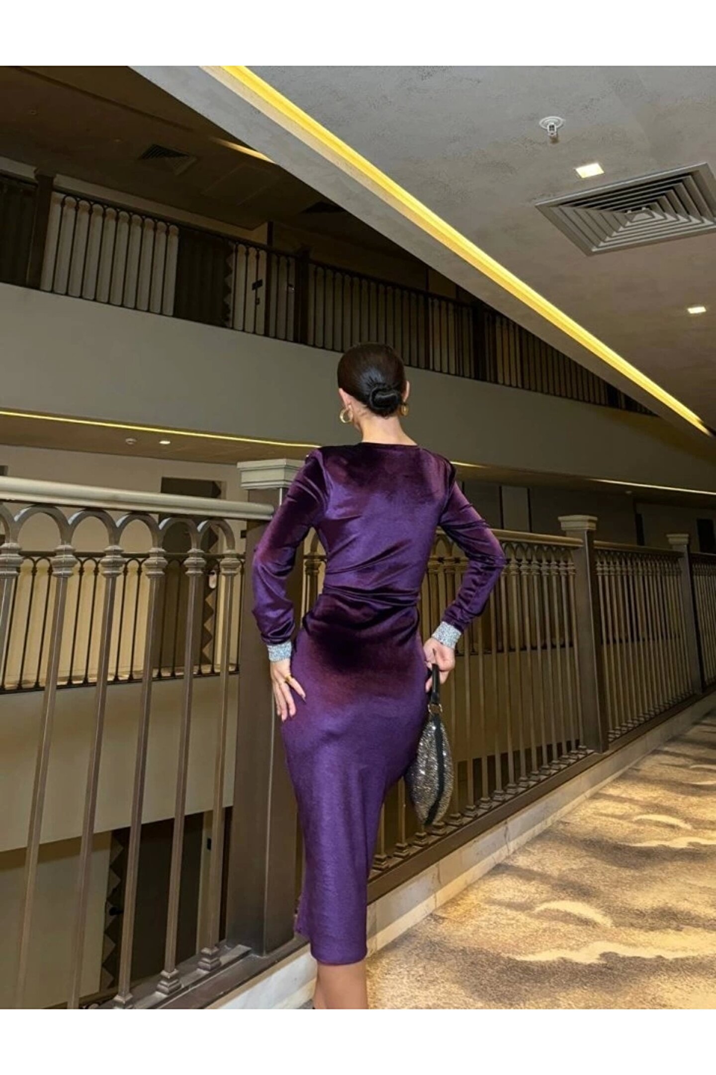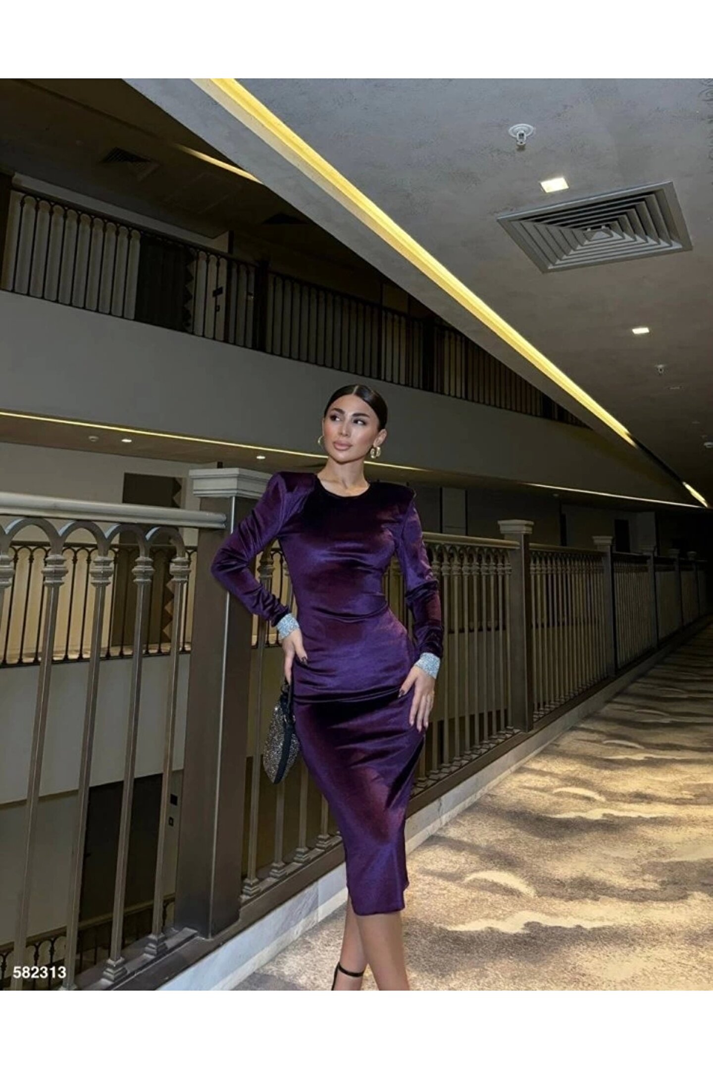 Kadın Bisiklet Yaka Vatkalı Manşet Detay Kadife Kumaş Midi Boy Elbise Modelin Ölçüleri: Boy:165, Kg:55, Göğüs:90, Bel:72, Kalça: 100 Modelin üzerindeki ürün M/38 bedendir TARZ-Kokteyl YAKA-Bisiklet/Yuvarlak Yaka DESEN-Desensiz/Düz KOL UZUNLUK-Uzun Kol KALIP-Kalem Elbise
